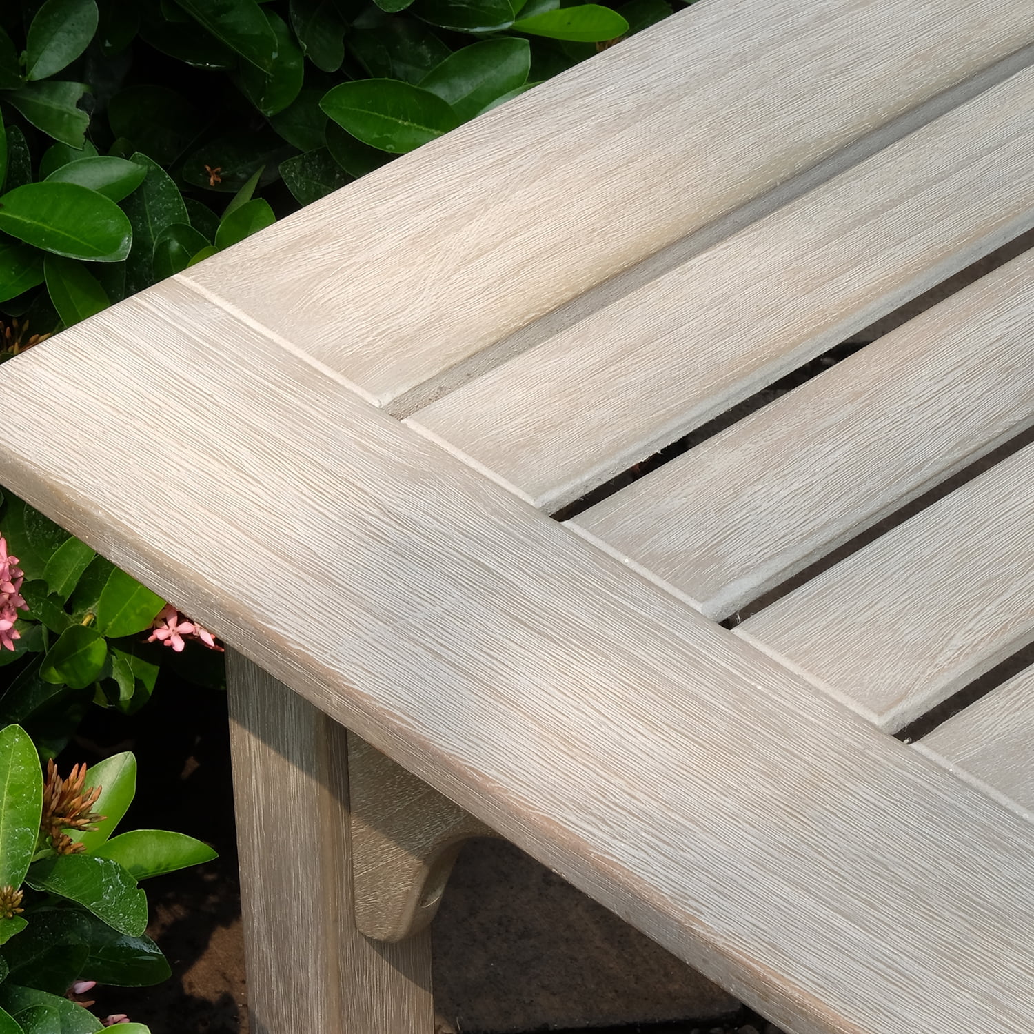 Crafted from high-quality solid teak wood. Available in natural teak and weathered gray finishes, seamlessly complementing any patio decor. Protected with an eco-friendly and weather-resistant water-based finish, ideal for the weathered gray option. Ideal teak table for both outdoor and indoor use. Slatted tabletop design enhances drainage for rainy days. Overall Dimension: 22 in. L x 22 in. W x 18.25 in. H Weight Capacity: 200 lbs Quick and simple assembly through detailed step-by-step instructions, along with a printed and instructional video via the QR code provided in the box. (Assembly Instruction)