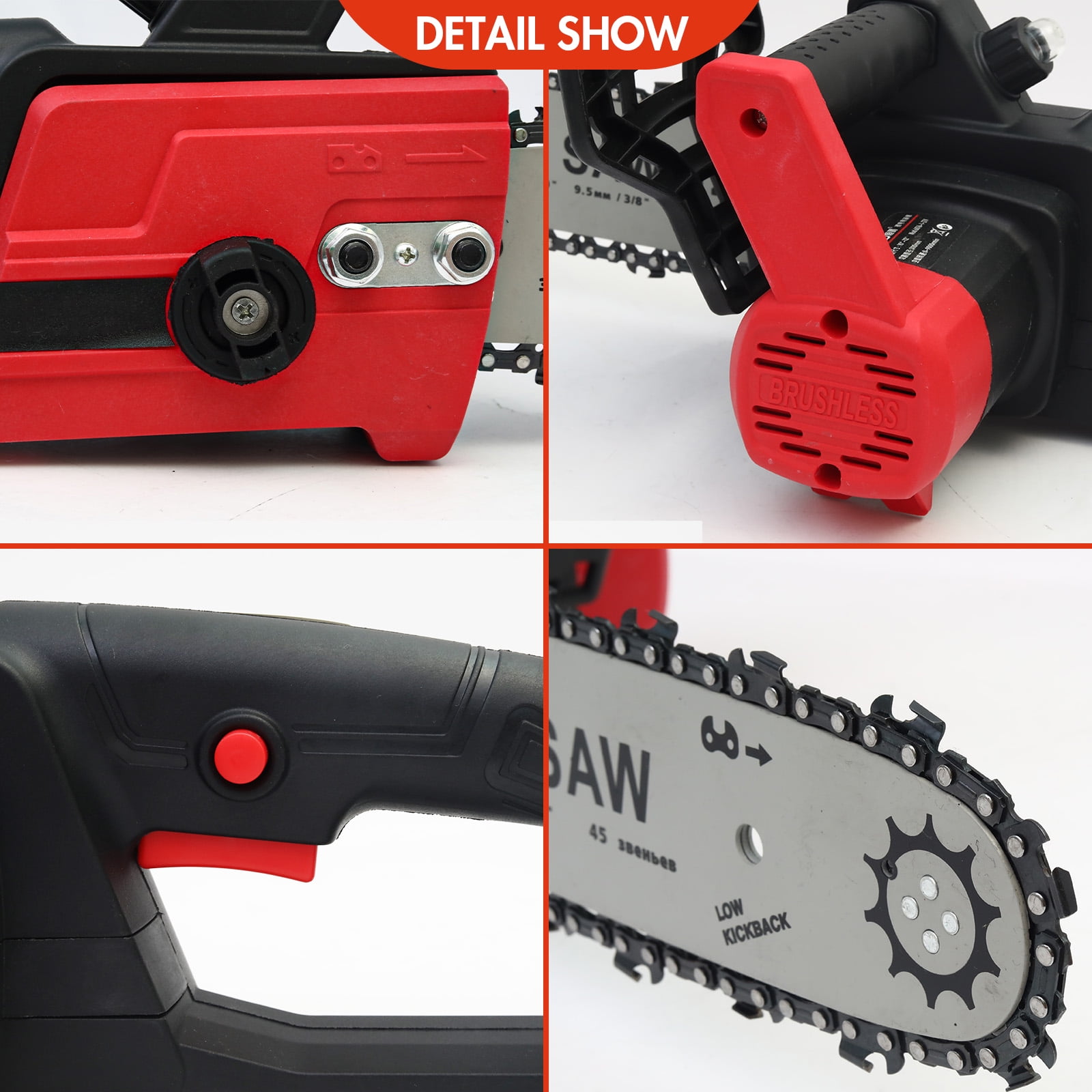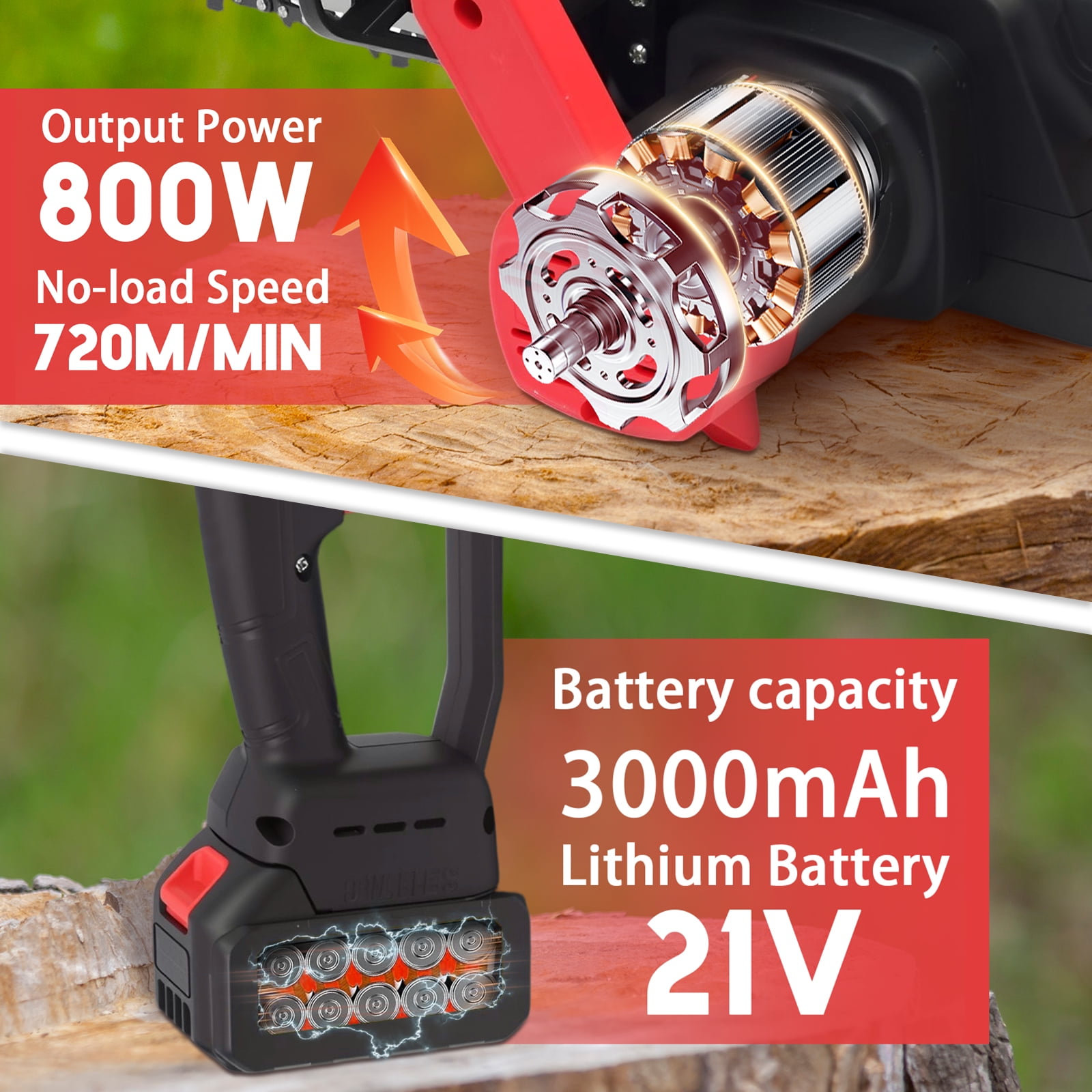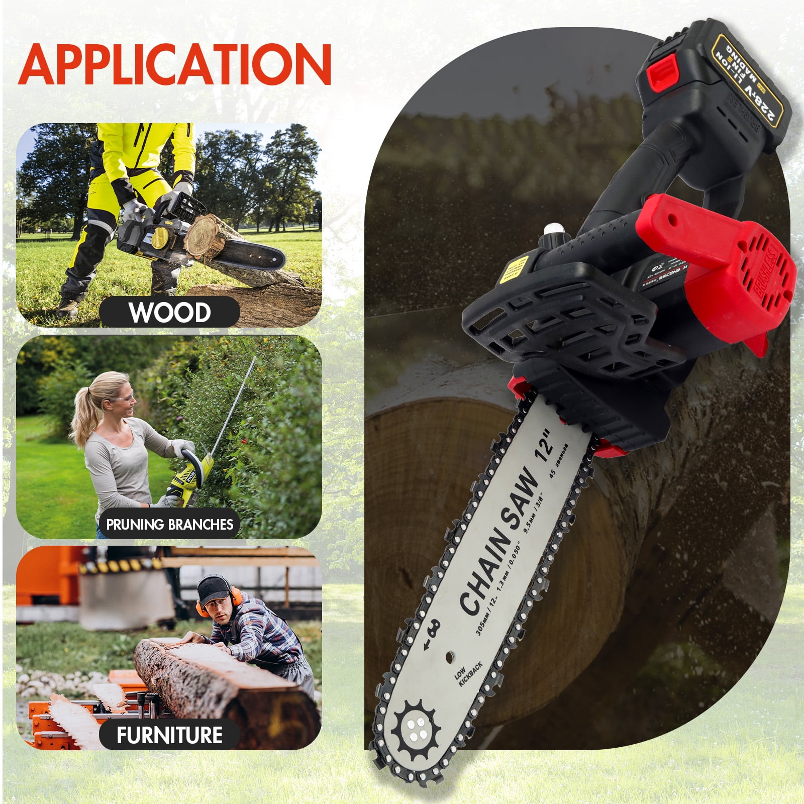 【Lithium Battery Power, Unlimited Power】The lithium battery chainsaw uses a high-quality, high-capacity lithium battery, providing strong and lasting power for each operation. Whether it’s the 20-minute runtime provided by 10 cells or the 40-minute extended runtime from a large battery, your work will never be limited by battery life. 【Stronger Power, Double Efficiency】The upgraded brushless full copper 95 large motor not only has low wear but also high energy conversion efficiency, providing unmatched power. It can cut through 20cm trees in just 15 seconds, easily handling various thicknesses of tree trunks, making your work smooth and uninterrupted. 【Reinforced Body, Durable and Reliable】The reinforced body material ensures the equipment is lightweight yet sturdy. It is resistant to damage and remains like new even after long-term use. Combined with a high-hardness quenched chain, it can handle nails and hard objects, ensuring your work is worry-free. 【Wear-resistant Chain, Safe Operation】The wear-resistant steel chain ensures smooth operation without interruption. Additionally, the protective guard in front of the handle effectively prevents wood chips from causing injury, providing comprehensive protection for your hands.