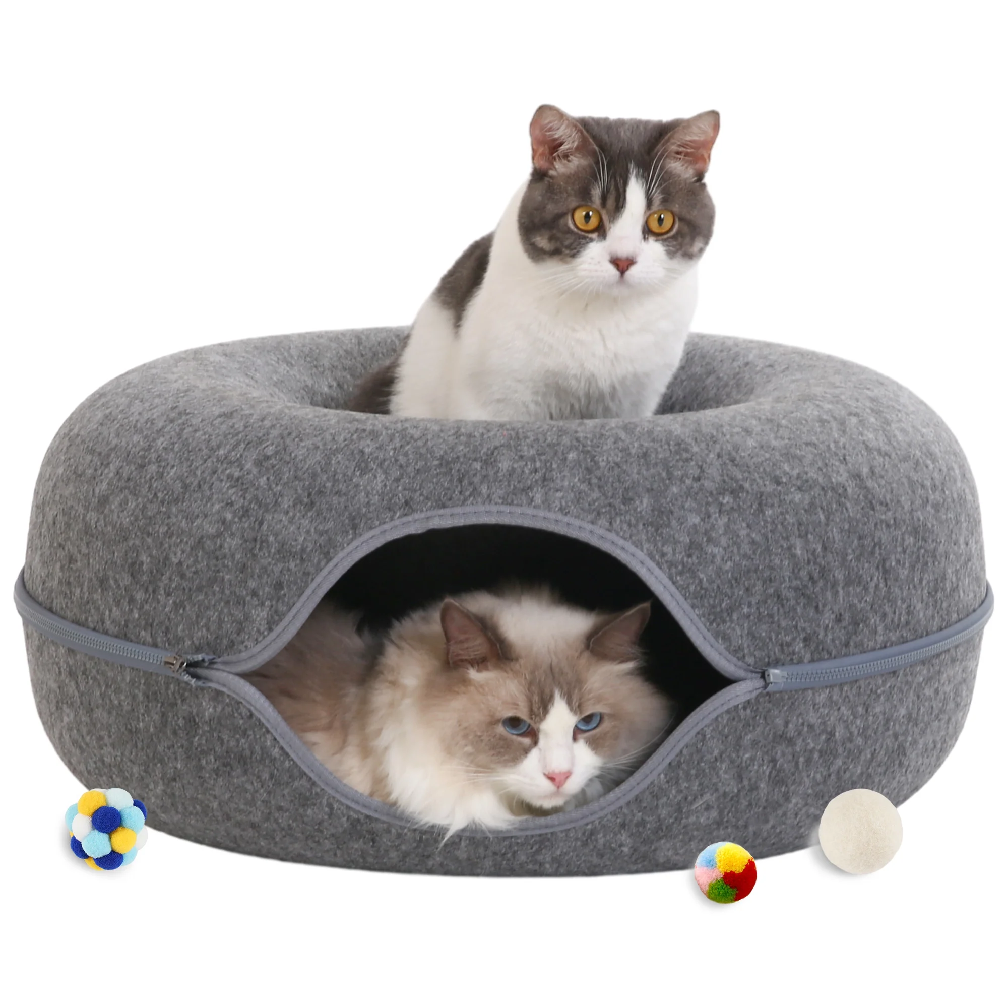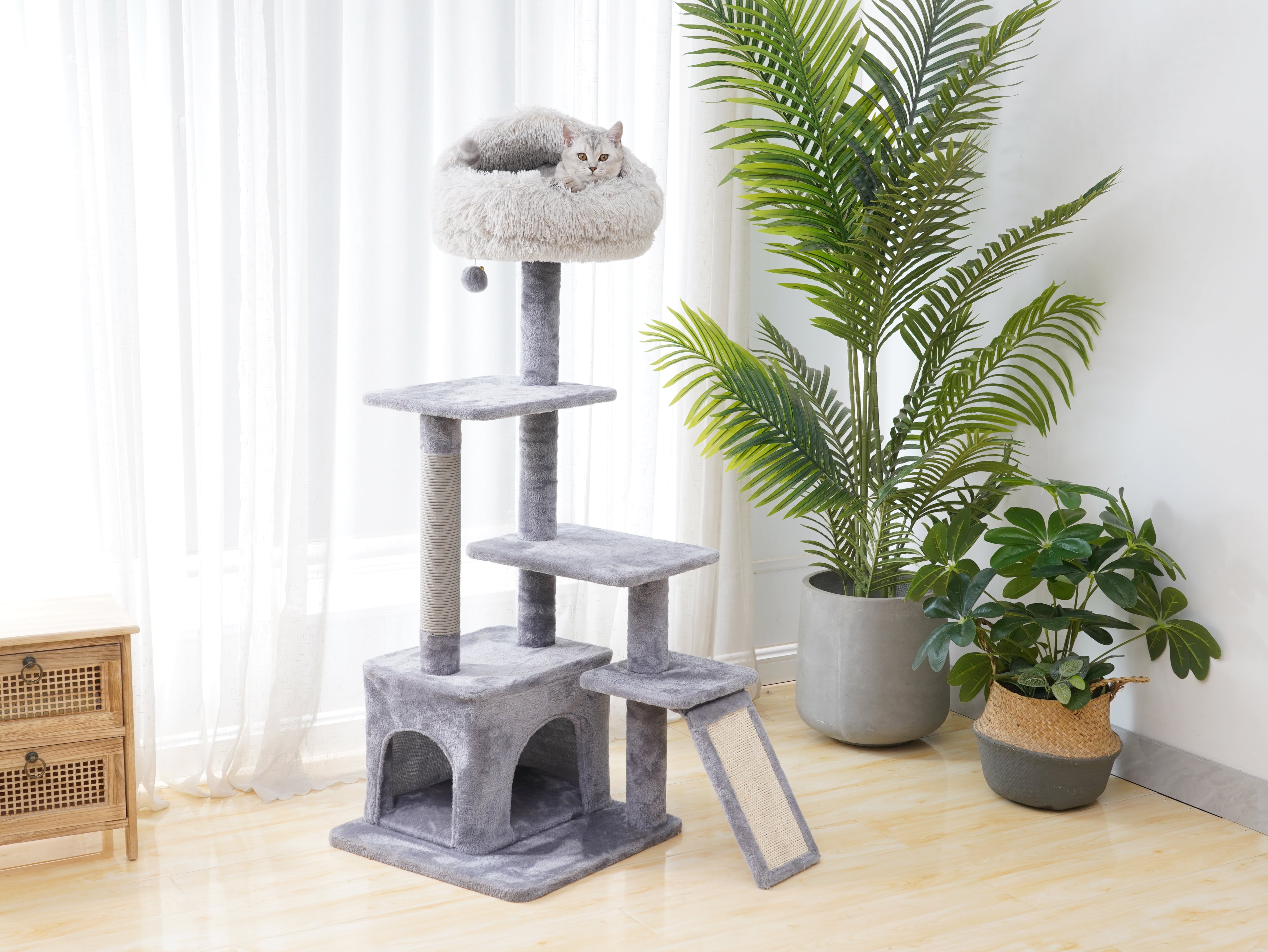 Multi-Functional large cat tree Dimensions 18.5 in x 18.8 in x 48 in Includes a hooded shag top bed and pom-pom cat toys Size with 18.5L, 18.8W, and 48 Height Includes recycled paper rope scratching posts Features a soft plush cat condo Features a natural sisal scratching pad
