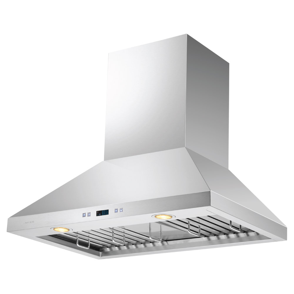 Product Features:Ultra Quiet Centrifugal BlowerSix-Speed Electronic Touch Sensitive Controls with LED DisplayHigh Quality Stainless Steel ConstructionDelayed Power Auto Shut Off with 30 Hour Cleaning ReminderTelescopic Chimney Fits 8 – 9 Foot CeilingsOptional Duct Cover Extension Available for Ceiling Heights up to 10′ Sold SeparatelyOne Year Limited Factory WarrantyRange Hood cannot be converted to ductless/recirculating (kit not available in United States)Specifications:Maximum Ceiling Height: 120″Minimum Ceiling Height: 94″Width: 30″Depth: 19-17/25″Height: 43″860 CFM Centrifugal BlowerLighting: Two 35W Halogen Lights6″ Round Duct Vent ExhaustSones: 0.7 – 6.5Filter: Stainless Steel Baffle120V / 60Hz