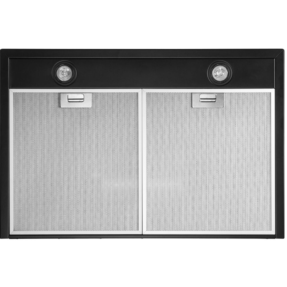 19-gauge stainless steel wall-mounted range hood 218W low-noise dual-chamber motor (level: 25 dB to 56 dB) Telescopic chimney fits up to 9′ ceiling Dishwasher-safe aluminium mesh filters 6″ round duct vent
