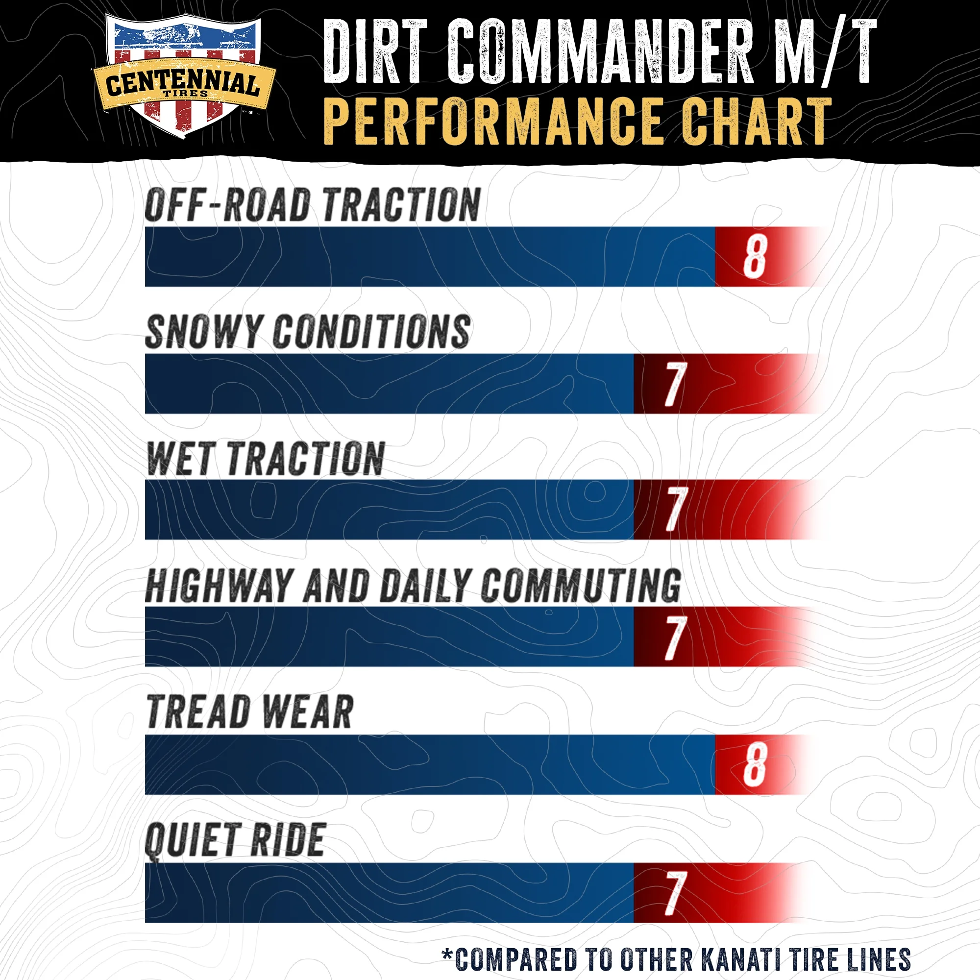 Centennial Dirt Commander M/T LT33X12.50R15 108Q C OVERVIEW Dirt Commander M/T light trucks tires offer all the qualities of a brand name mud terrain tire except for the hefty price tag. Whether installed on your daily commute vehicle or work truck, it’s aggressive tread is ready to get the job done, on or off road. Its rugged lugs are strategically laid out to give you a wider stance, while their tapered edges give you the grip and biting force you need to conquer challenging terrains.