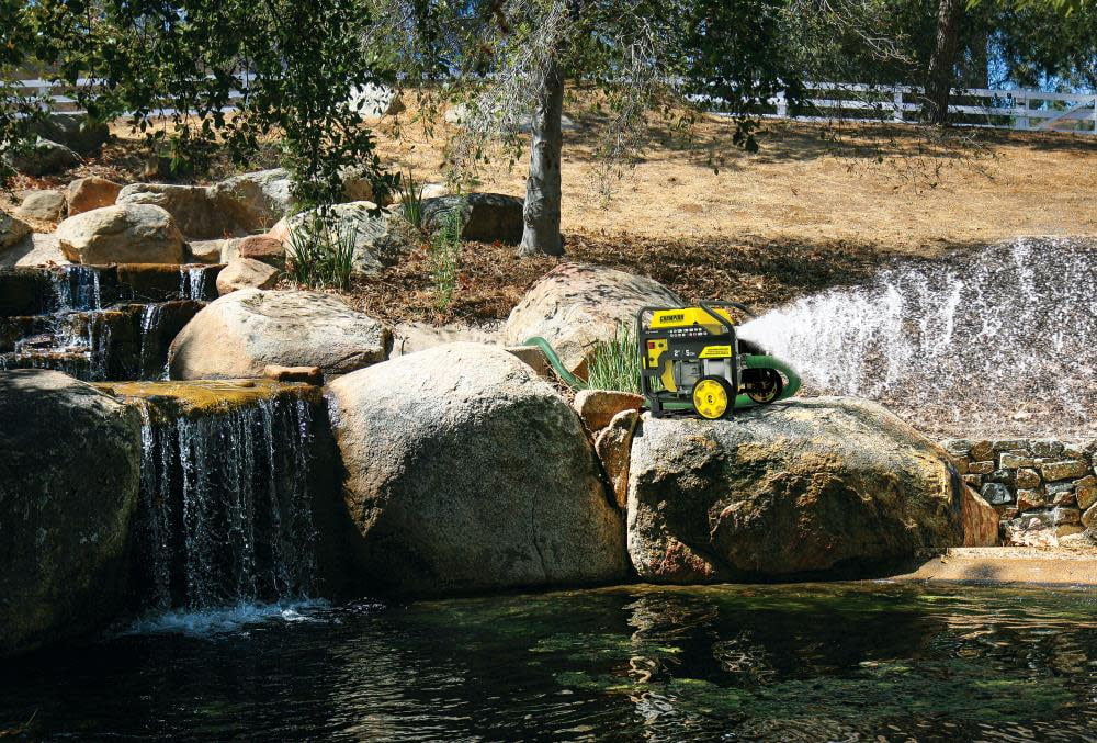Everything you need to start pumping – 12-foot suction hose with filter, 25-foot discharge hose, quick cam lock coupler, clamps, adapters, fittings, nylon tape, and storage bag Up to 158 gallons per minute maximum delivery powered by a 212cc Champion OHV engine with a 3-gallon fuel tank and 0.5-quart oil capacity. Includes a wide priming cap for quick startup Featuring a durable steel frame, handle and wheel kit with never-flat tires, this pump is easy to move from one job to the next and a cinch to store