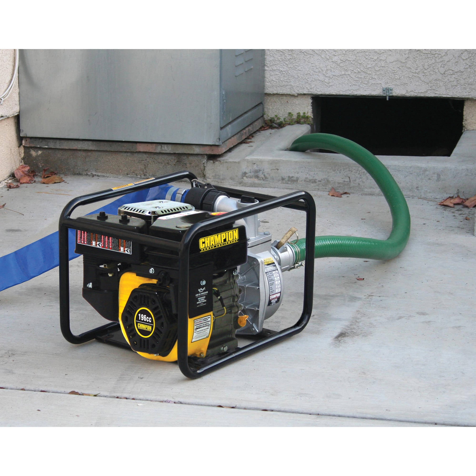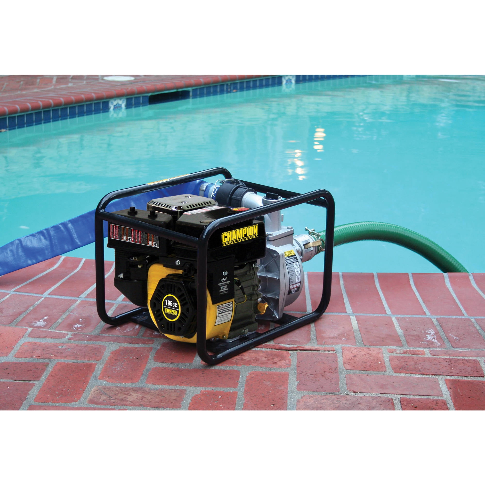 Complete Setup?Everything you need to start pumping – 12-foot intake hose, 20-foot discharge hose, cam action quick coupler, intake strainer, clamps, fittings and adapters (just add oil and gas) Efficient?158 gallons per minute maximum delivery powered by a 196cc Champion engine with a 0.9-gallon fuel tank and 0.6-quart oil capacity Semi-Trash?Capable of passing solid waste up to 9/16 inch in diameter, this pump has a 2-inch inlet, a 2-inch outlet, total head of 98 feet and suction head of 26 feet Convenient?Featuring a durable steel frame, handle and wheel kit with never-flat tires, this pump is easy to move from one job to the next and a cinch to store Champion Support? Includes 2-year limited warranty with FREE lifetime technical support from dedicated experts