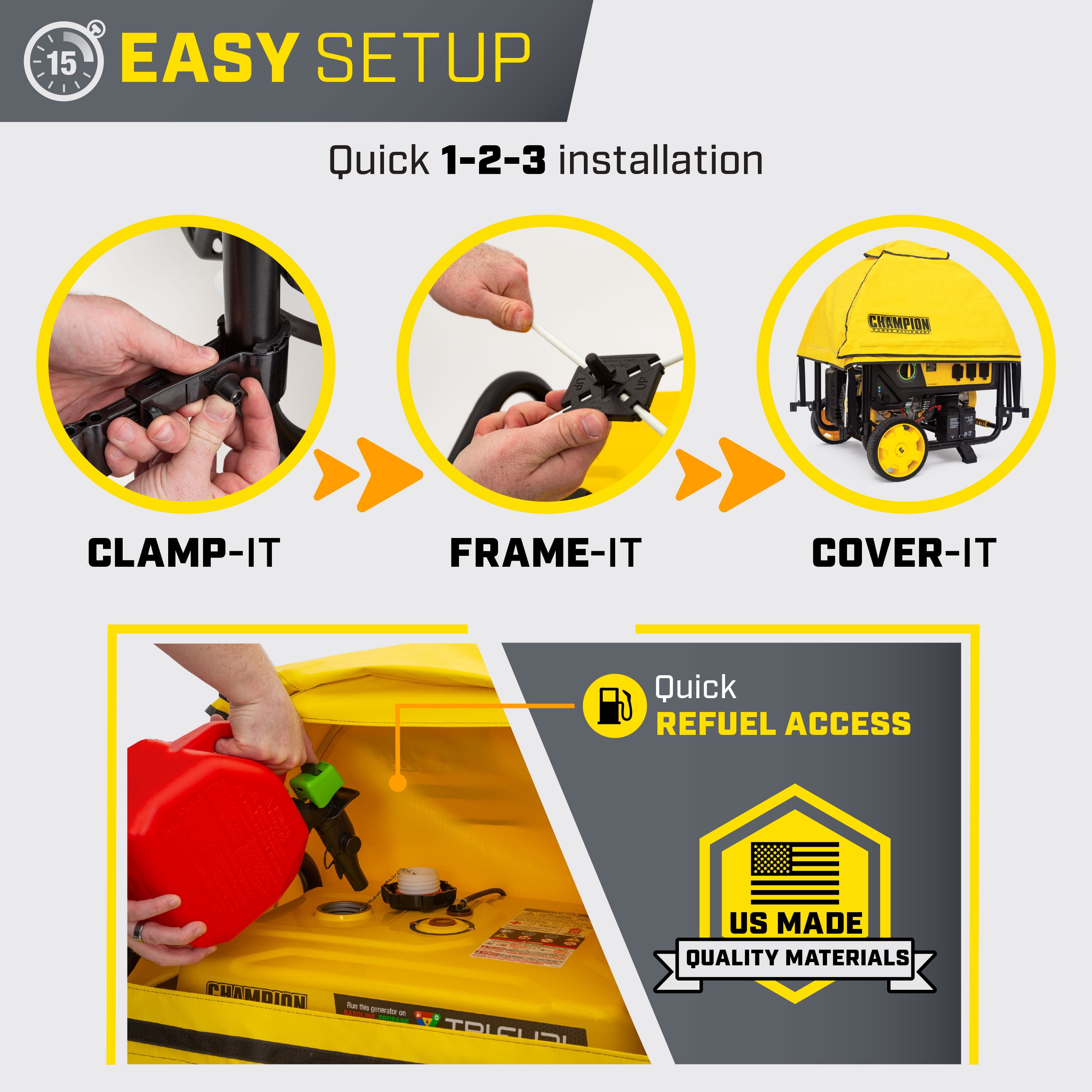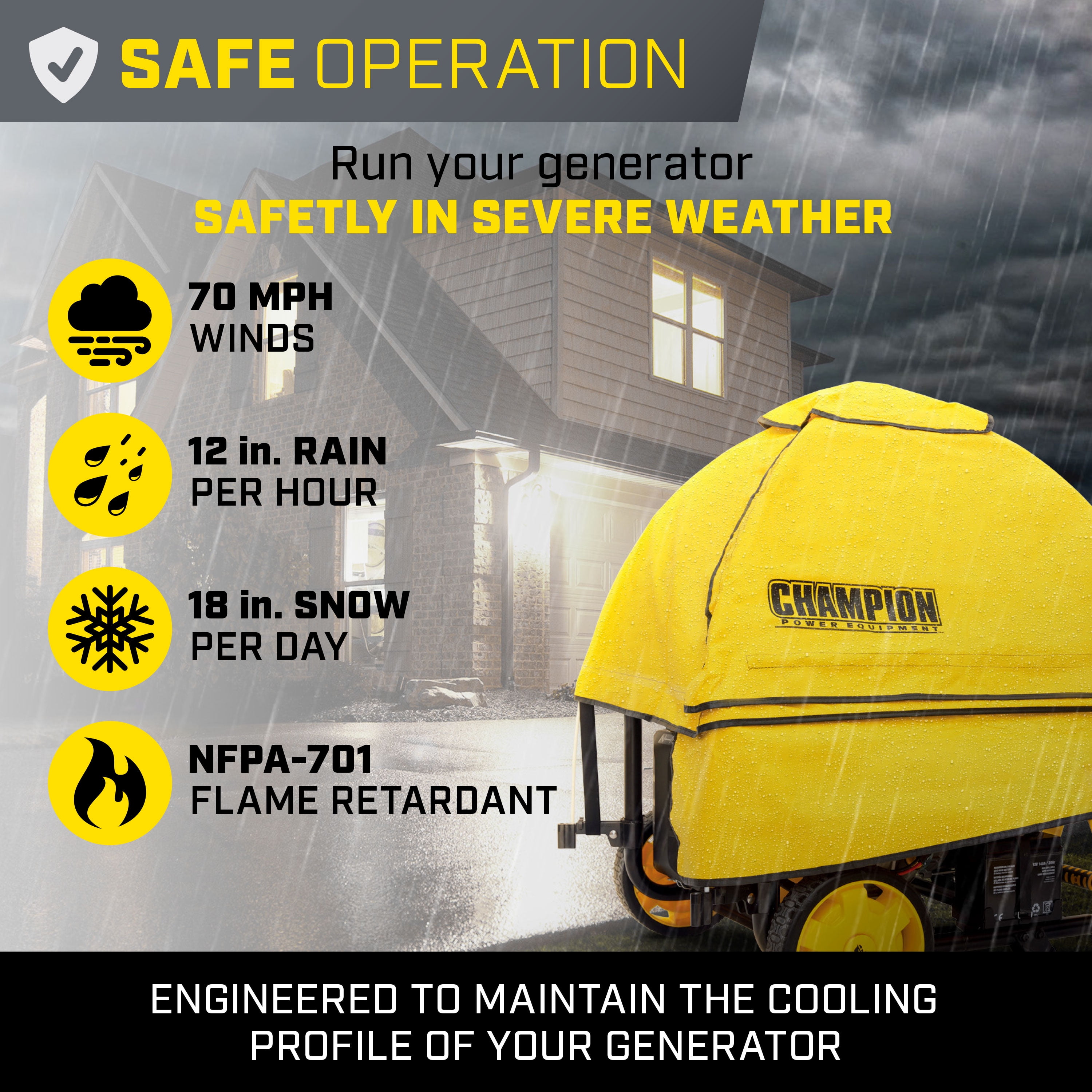 Installs easily in 3 simple steps with its self-attaching design The large refueling door, omni-fit electrical panel apron and natural airflow design allows for generator operation and maintenance while the cover is on Operate your 4000 to 12,500 starting watt generator with your safety and protection of the generator in mind The NFPA rated, waterproof cover includes high-strength frame rods designed to withstand winds up to 70 mph, up to 12 inches per day and up to 18 inches of snow per day Champion Support includes 1-year limited warranty with FREE lifetime technical support from dedicated experts