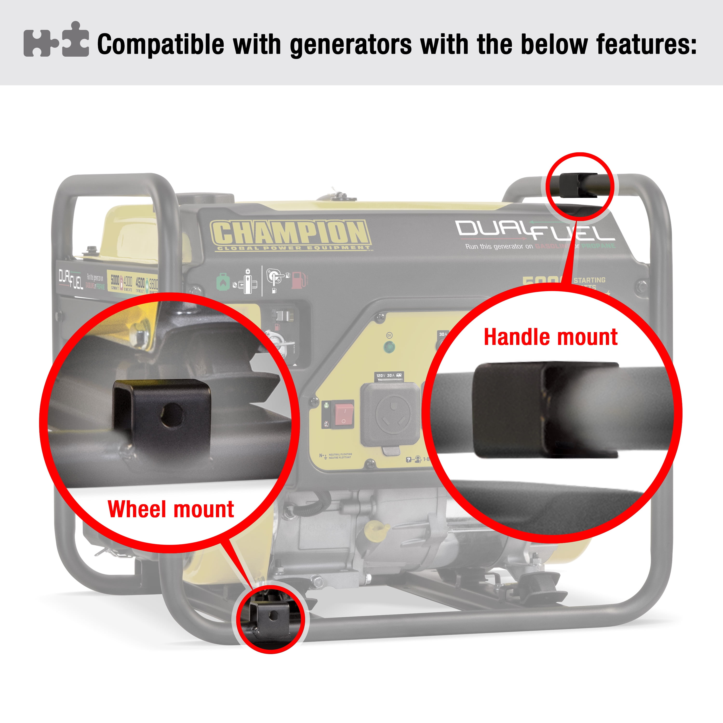 Count on the 8-inch never-flat tires and folding handle to upgrade your generator’s mobility and make storage a cinch Install your wheel kit in minutes thanks to Champion’s thoughtful packaging and clear instructions, plus all the hardware you need is included Easily move your generator in and out of storage and take your power where you need it without heavy lifting, plus the support leg with vibration mounts ensures smooth and secure transport Designed for Champion generators 2800-4750 watts produced in/after January 2013 Champion Support includes 1-year limited warranty with FREE lifetime technical support from dedicated experts
