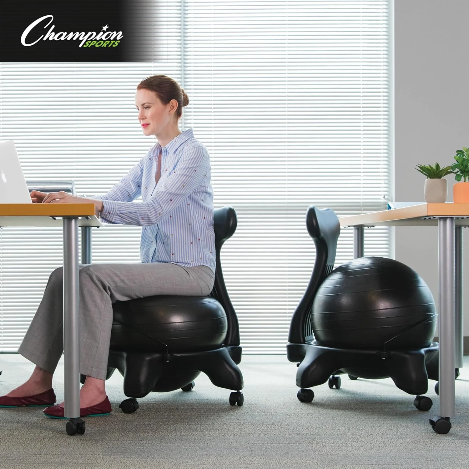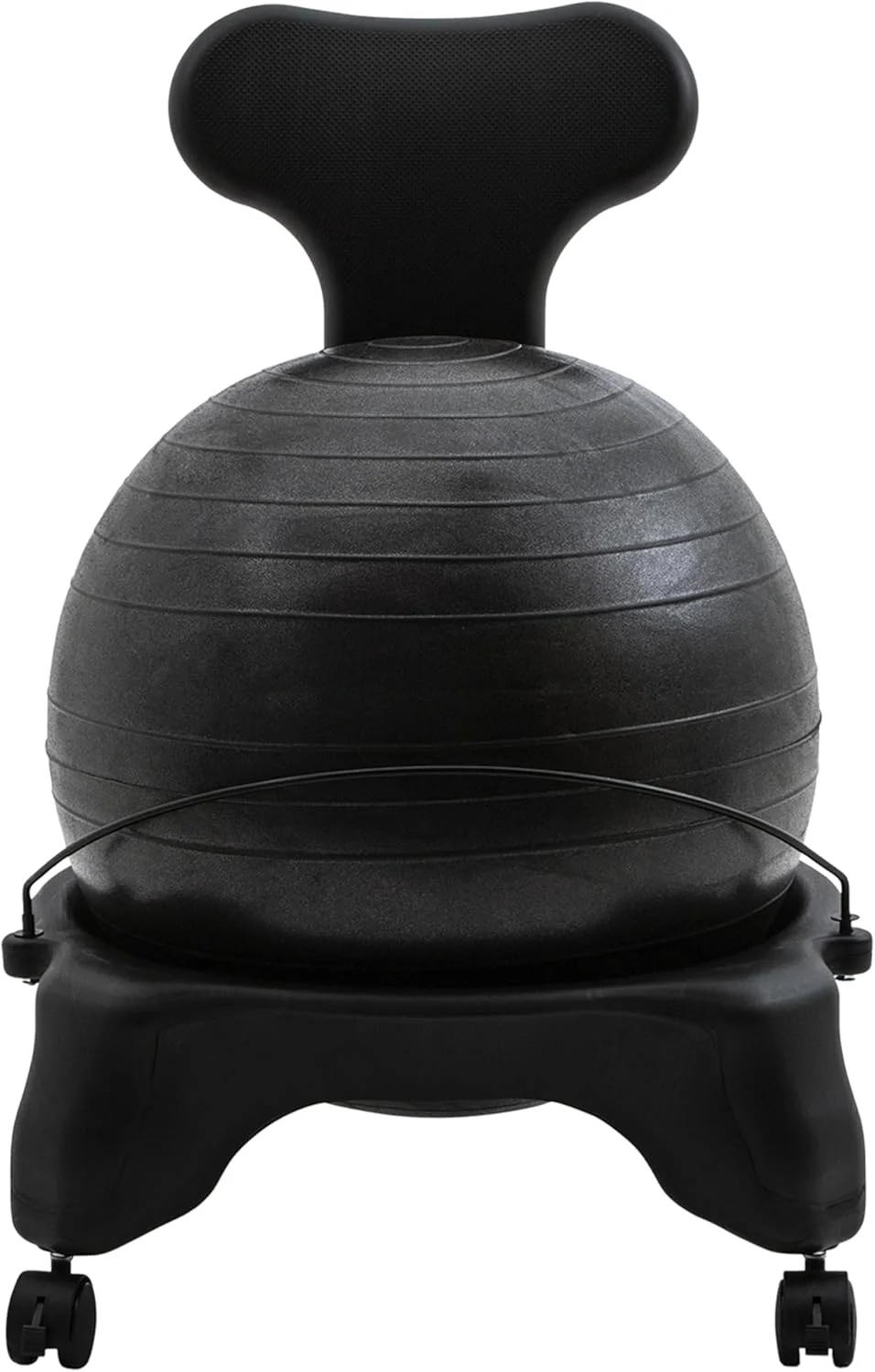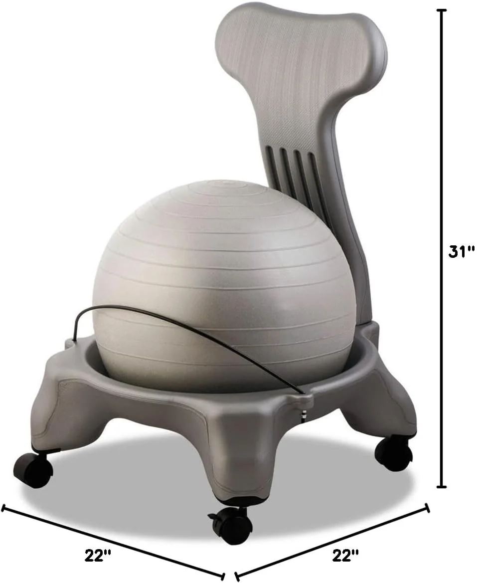 ALTERNATIVE DESK CHAIR: Ball chairs are comfortable and healthy alternatives to traditional work and computer chairs which are often stiff and unforgiving, leading to poor posture and back problems STABILITY BALL SEAT: Sitting on the large, heavy duty inflatable yoga ball helps correct your posture and strengthen your back and core muscles as if you were exercising; a small hand pump is included STRONG PLASTIC FRAME: The balance ball fits snugly inside a 22 x 22 x 31 inch wheeled base made of durable plastic material to withstand daily use; the sturdy frame allows for easy assembly in minutes SCULPTED BACK SECTION: The fitness ball holder has a tall, specially shaped back to provide ergonomic support and improve your spinal alignment, preventing lingering back stiffness and soreness EASY TO TRANSPORT: Use our ball chair to build a healthier core and prevent back pain; the rolling base is compact and lightweight so you can take it to your office, classroom or anywhere in your home