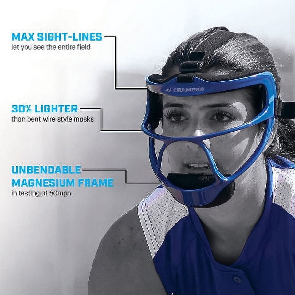CHAMPRO Rampage Sports Pro-Elite Grill Youth Fielders Mask (Black) For use with softballs only Molded magnesium frame is stronger and lighter Narrower design stays closer to the face Offers maximum sightlines for a wider field of vision Adjustable harness strap includes ponytail slot