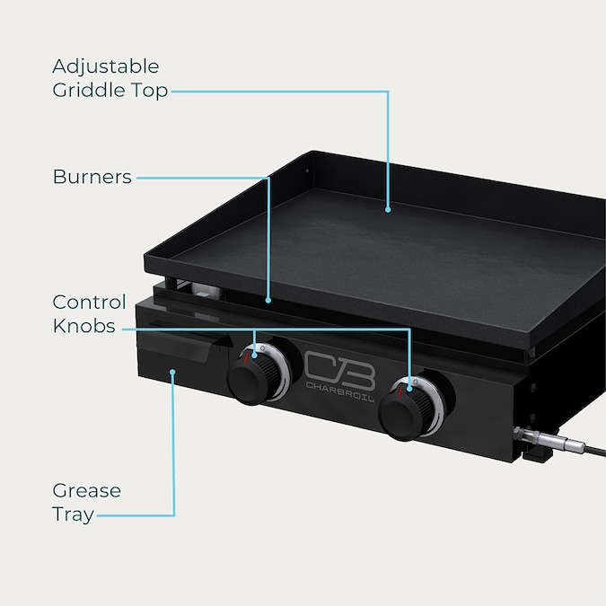 The Charbroil® Performance Series™ 22″ Portable Gas Griddle II is all you need to cook breakfast, lunch and dinner when you’re tailgating, camping and hanging out in the back yard. Enjoy a wide variety of foods from light fluffy pancakes with sausage links for breakfast to grilled tuna melts for lunch and beef stir fry for dinner. If you want an easy option for delicious grilled food at home and on the road, you want this versatile Portable Gas Griddle.