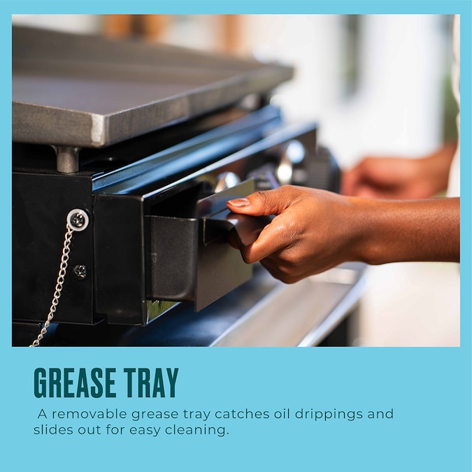 - Removable grease tray catches oil drippings and slides out for easy cleaning.