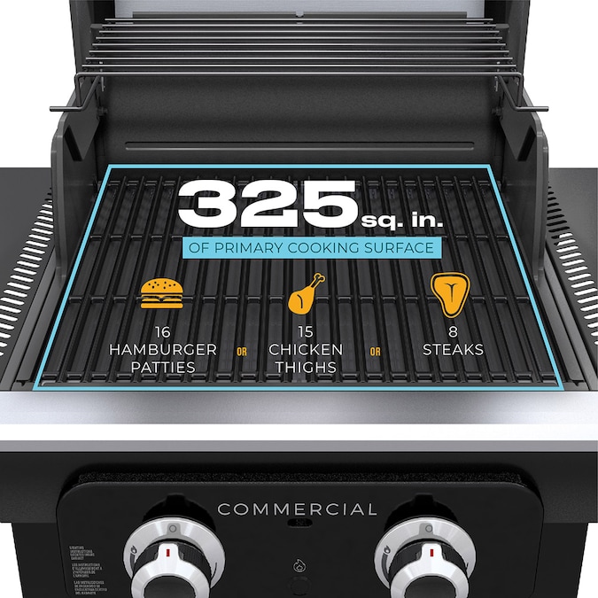- Grill up to 16 burgers, 15 chicken thighs and 8 steaks on 325-square-inches of primary cooking space