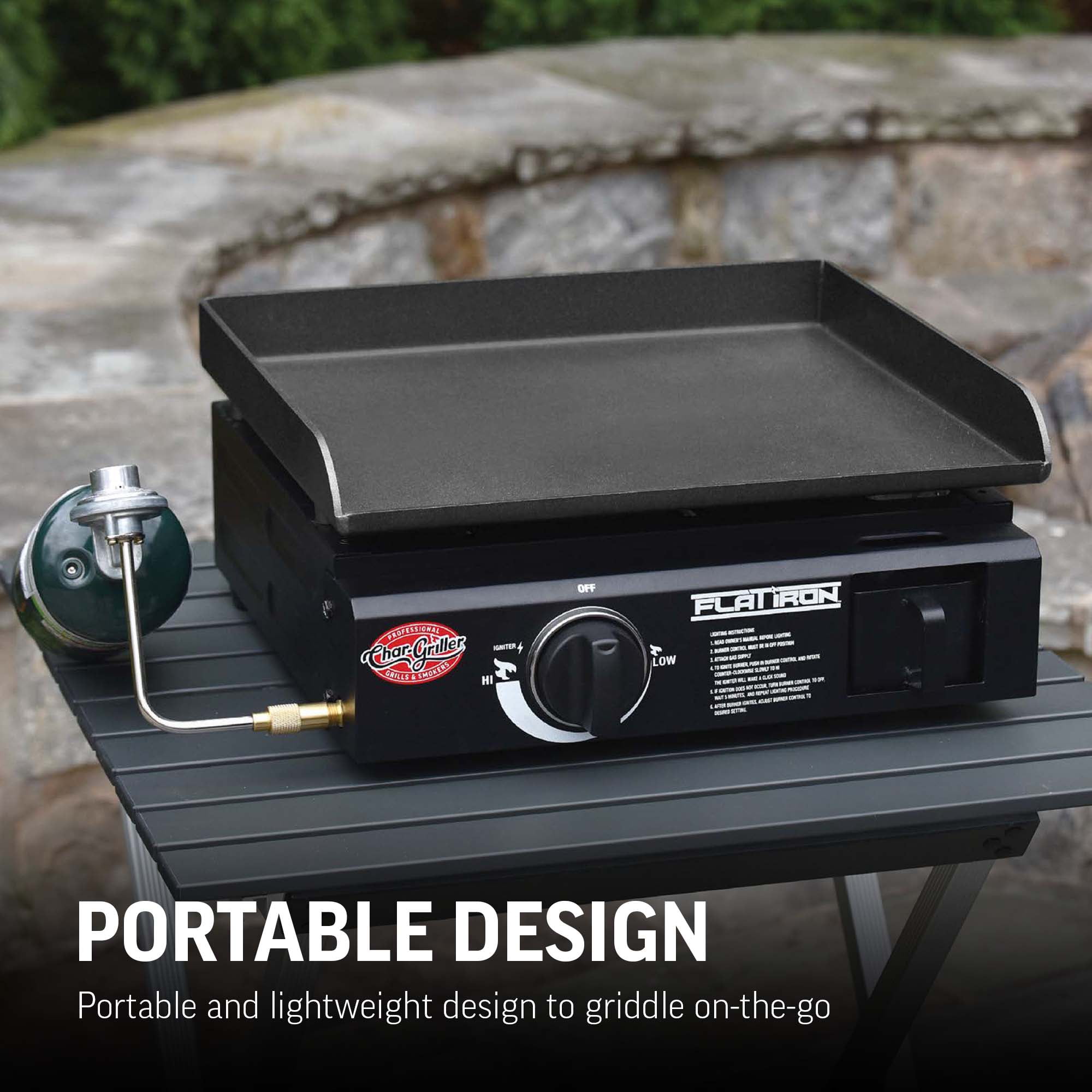 Take your griddle on the go with the Char-Griller Flat Iron® Portable 17-inch Gas Griddle. Equipped with a 12,000 BTU gas burner, the heavy gauge steel griddle top heats quickly, evenly, and gets better with every cook With a removable drawer for easy grease management and enough space to cook for the crew, this portable griddle is perfect for camping, tailgating, and more.