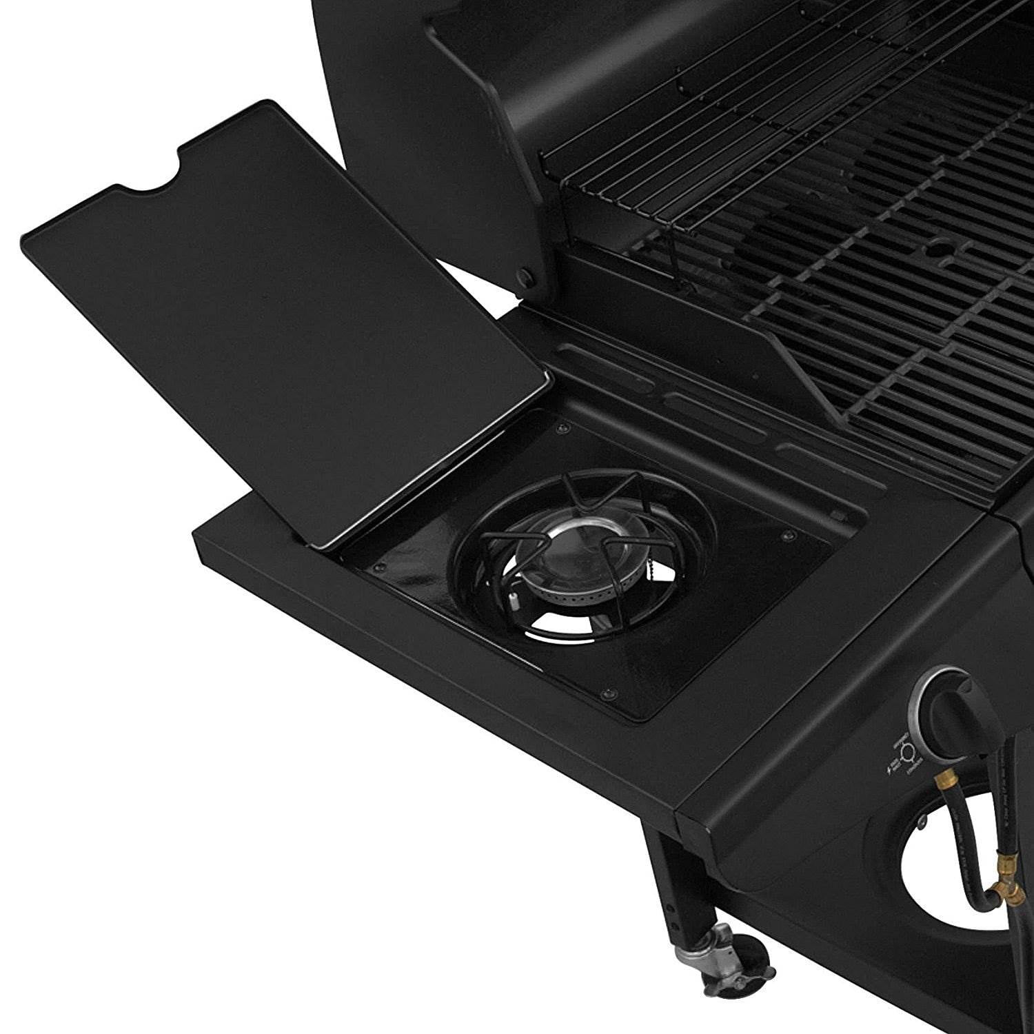 Hybrid grill can be used for both gas and charcoal grilling, no extra tools needed 780-square-inch primary cooking area is enough for 40 burgers Side burner can be used for warming up sauces and side dishes, or use it as a workspace Electronic ignition makes turning on your grill easy and simple Charcoal chamber features a crank-adjustable-height charcoal grate, easy-access charcoal door, and a slide-out ash pan Gas section features 3 stainless steel burners and porcelain-coated cast iron cooking grates Lid temperature gauge for monitoring the inside grill temperature Assembly required: Yes Fuel type: Charcoal and liquid propane Burners: 3 Main burner BTUs: 36,000 BTUs Side burner BTUs: 12,000 Color: Black Manufacturer warranty: 1-year warranty