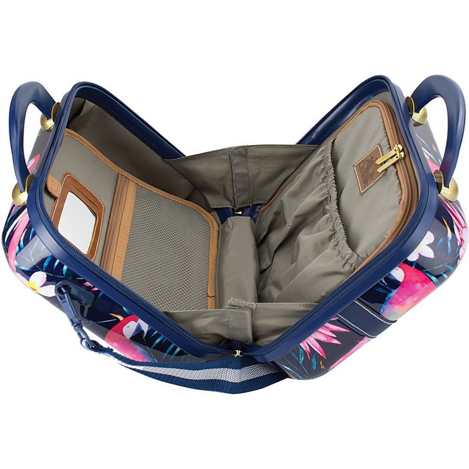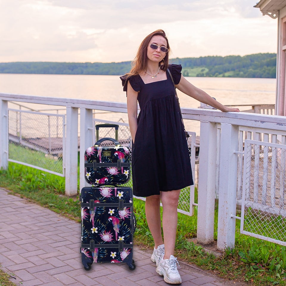 The Gatsby Collection is a flawless combination where fashion meets function. Designed from the inside out this vintage luxury trunk features 360 glide wheels, vegan leather trim, and a TSA lock. The beauty case features a vanity mirror, a bag strap to attach to a suitcase, and a detachable shoulder strap.