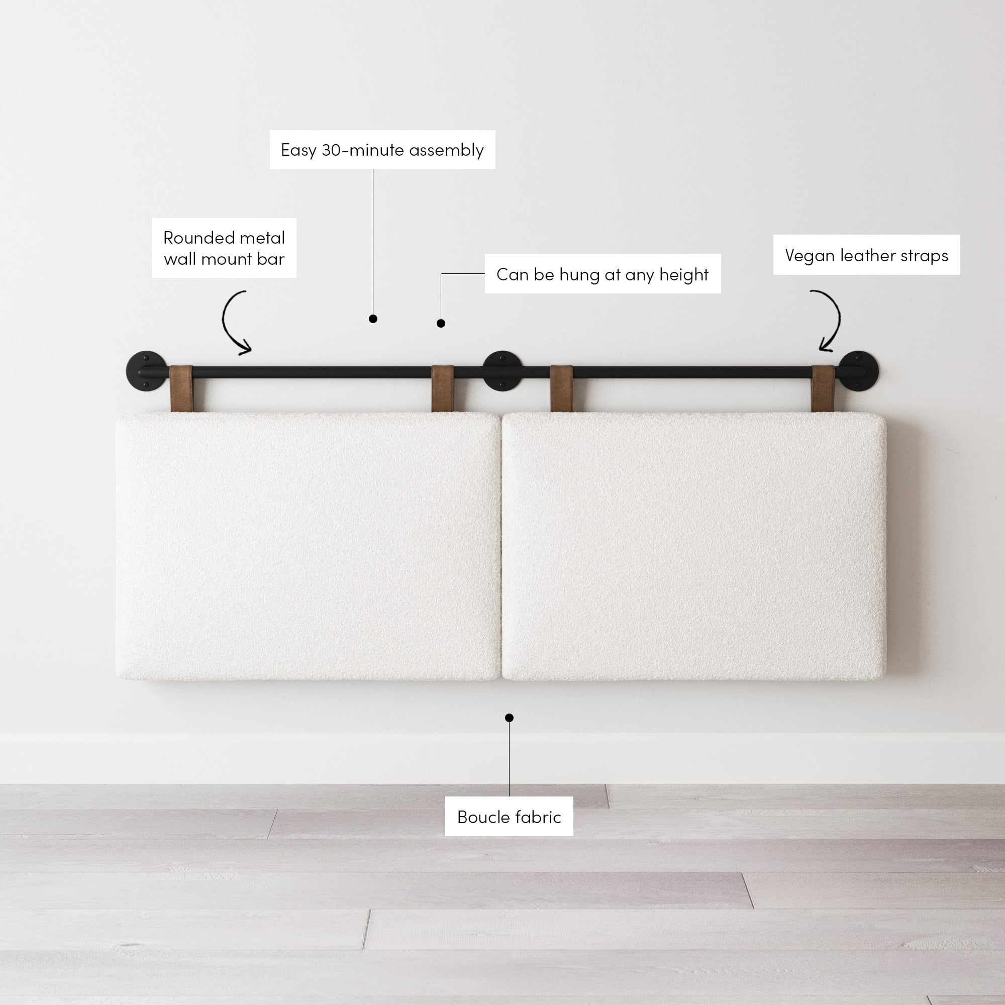 This soft hanging headboard features a sleek metal rail and vegan leather strap to be hung at any height. Charlie is the perfect complement to your bedding style and can adapt to any queen-size beds thanks to its versatile design. The boucle fabric of the Charlie padded upholstered headboard brings texture and softness to the room. The bohemian modern design of this piece will add coziness and a relaxed feeling thanks to its neutral colors and natural materials. Charlie wall mounted headboard is an easy 30 min assembly that will keep your space light and breezy. Accessorize it with patterned pillows and cushions for a full-on bohemian look. Get creative and add style to your seating area by hanging these panels in an entry, dining, or banquette area behind a bench or a set of stools. Lean on Charlie headboard as it is as versatile as your imagination. Easy 30-minute assembly and lifetime manufacturer warranty: try for 100 days. Materials: Boucle Rough White Fabric, Black Matte Metal PC Rail, Saddle Brown Vegan Leather Strap Assembly Must-Haves: Phillips head screwdriver, Drill with 1/4” drill bit, Packaging carton as working surface