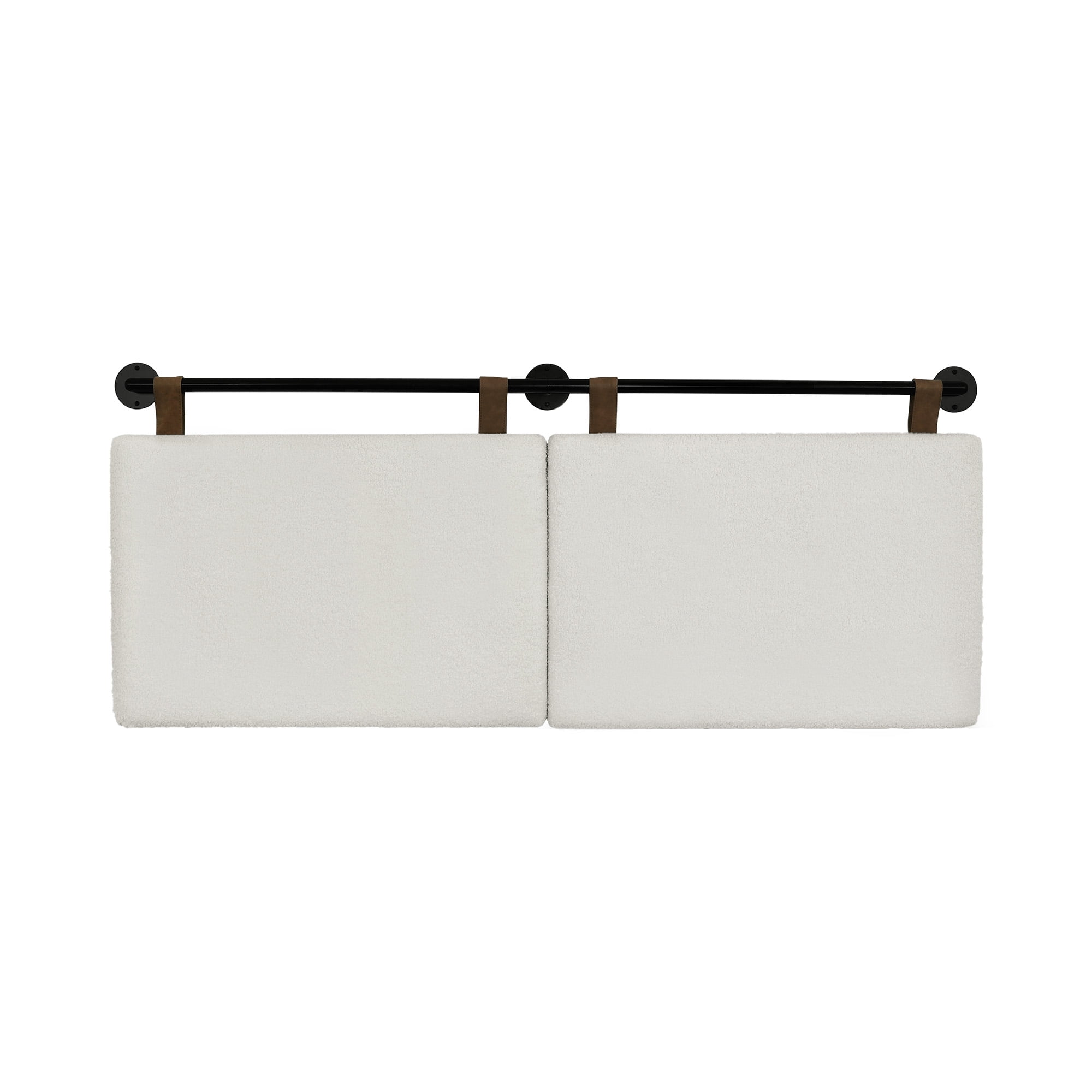 Charlie Queen Size Wall Mount Headboard, Boucle Upholstered Padded Headboard, Adjustable Height Brown Leather Straps with Black Matte Metal Rail, White/Black