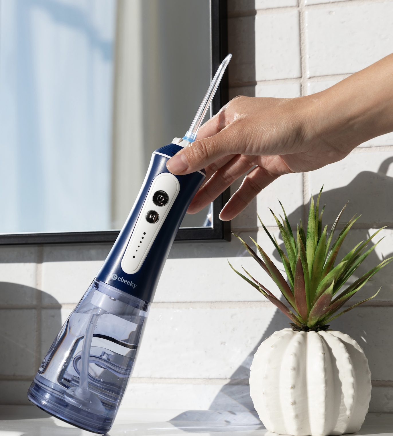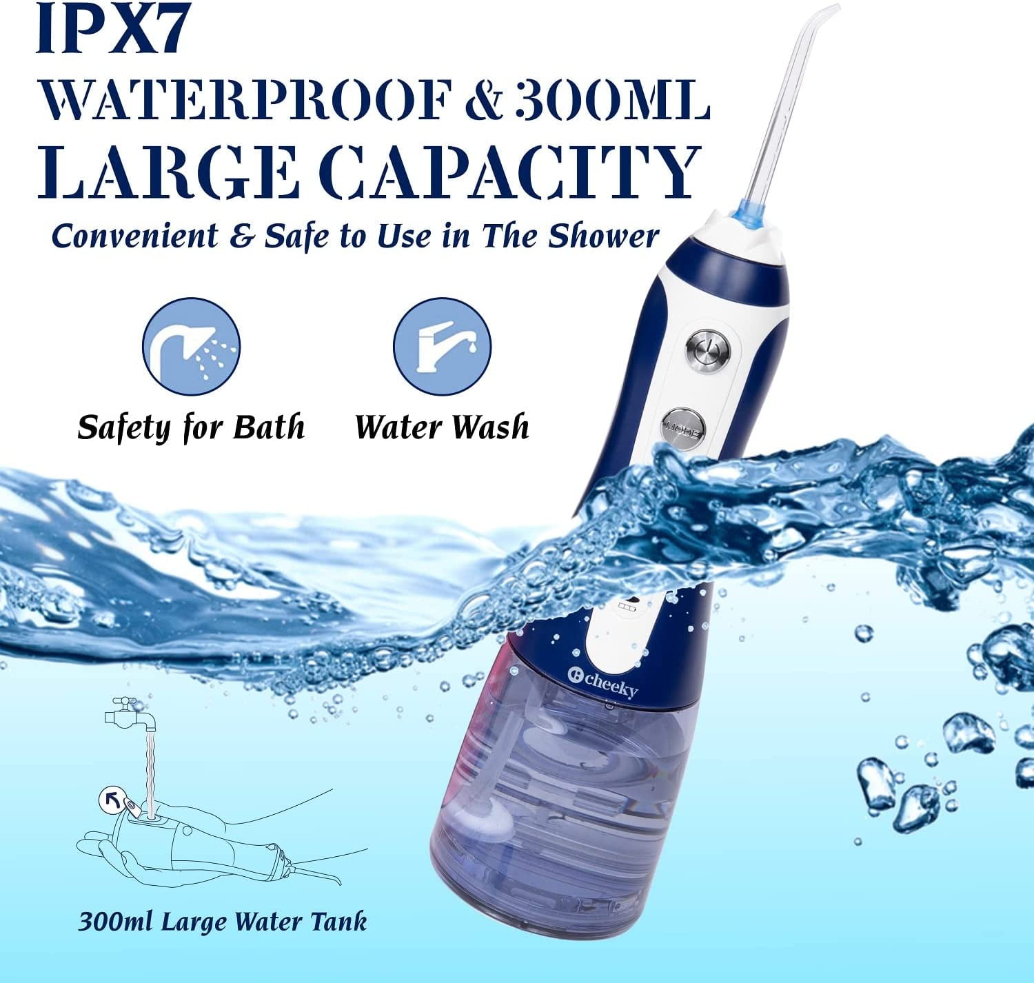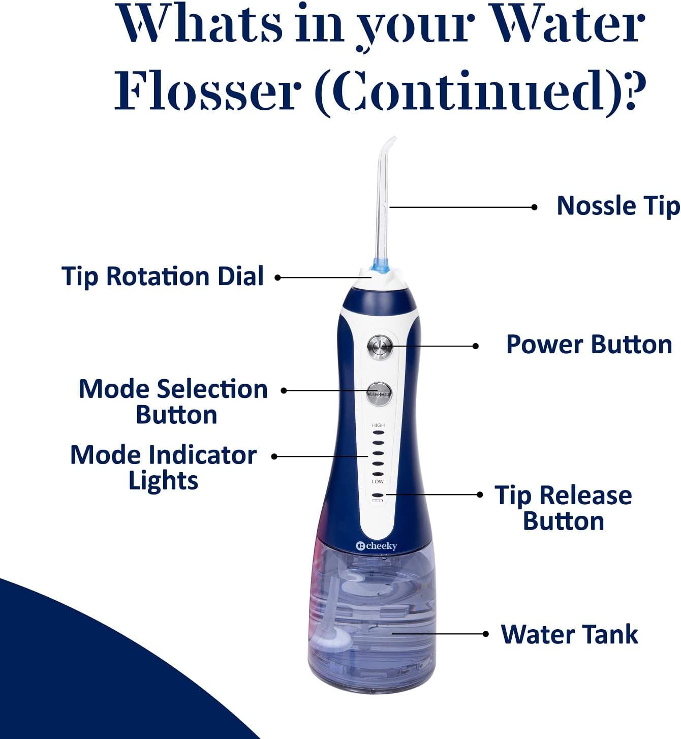 Cordless water flosser Five (5) water pressure modes Five (5) reusable flossing heads High-quality, rechargeable lithium battery Large, easy-to-fill 300 mL water tank Precision cleaning and gentle on sensitive gums Supports kids and adults (Ages x and up) Deep-Cleaning Water Flosser – Designed to let you clean between teeth, along the gumline, over and on braces and even around dental work our water flossing system makes it easy to reach every spot in your mouth for a deeper, more effective clean. Custom Pressure for Sensitive Gums – The Cheeky water flosser professional system features five individual low-to-high pressure settings to make it easier to really clean your mouth without irritating sensitive gums or teeth. High-Quality, Reusable Flossing Heads – Each portable water flosser also comes with five floss heads to support long-term flossing efforts or so you can swap them out between different users in your family. Compact, Portable and Rechargeable – A large capacity 300 mL water tank and built-in lithium battery make it easy to floss in your bathroom, on the couch or when you’re on vacation. Just fill it up, attach the floss head and keep your mouth clean. Fast, Efficient and Clean Use – Unlike manual water flosser thread that can be tough to manage, uncomfortable and even wasteful our reusable, rechargeable water flossers for teeth and gums make flossing quick, easy and efficient.