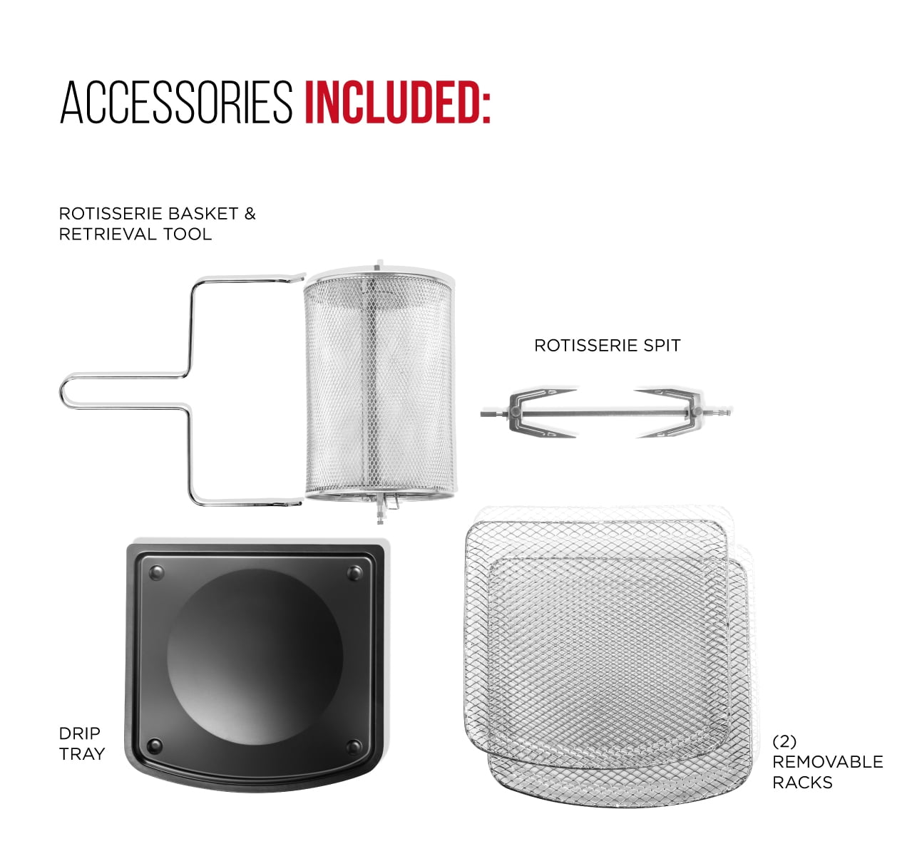 • This versatile product functions as an air fryer, rotisserie oven and dehydrator, perfect for nearly any cooking task. Make better-for-you fries that are just as crispy and tasty, roast a whole chicken, or dehydrate that leftover pineapple you’ve been meaning to eat. •This multi-functional airfryer cooks faster than an oven and does not require preheating. The capacitive touch screen display is easy to use; temperature range of 90-400 degrees and 8 preset options make any kitchen task easy – from frying and roasting to dehydrating and baking! •Interior lighting allows you to easily watch your food as it cooks. Accessories include 2 air flow racks, rotisserie spit and forks, rotating basket/retrieval tool and drip tray. Removable drip tray and dishwasher safe parts make cleaning a breeze. •Extra guests, or just extra hungry? Either way, this air fryer was thoughtfully designed with the whole family in mind. The spacious 6-liter unit allows you to make plenty of food so you can make enough food for the whole family – without having to heat up your oven! •cETL approved with advanced safety technology for long lasting durability, & 1-year hassle-free warranty provided by Chefman, so you can purchase worry-free – we’ve got your back! 120 Volts/1700 Watts – RJ38-6-RDO