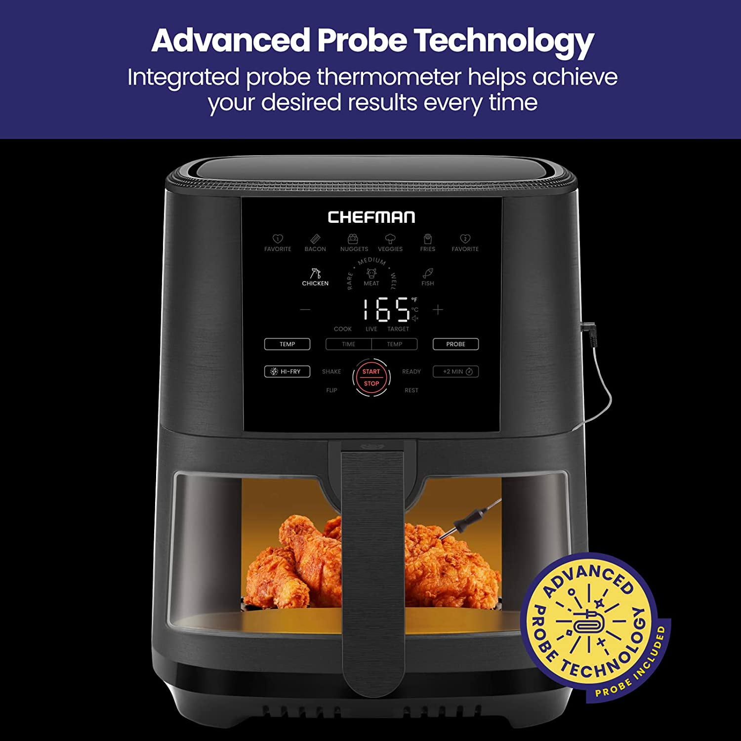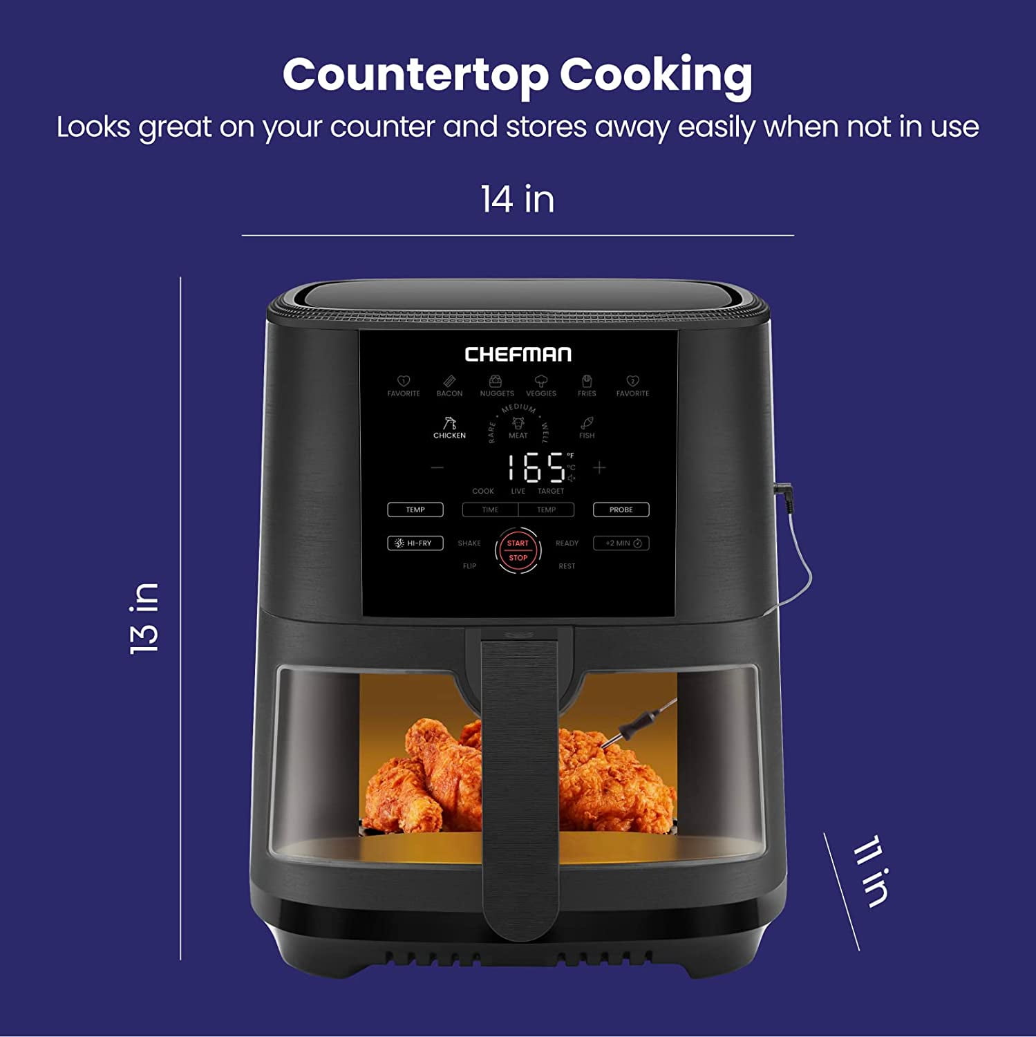 FRY WITH THE POWER OF AIR: Don’t sacrifice great taste for healthier cooking. Serve all the delicious fried foods your family loves using 98% less oil. Air fry chicken, vegetables, pizza, French fries, frozen foods, and even leftovers to a perfect crisp in minutes. PROBE PERFECTION: This big air fryer includes a removable integrated probe thermometer and advanced probe technology that effortlessly cooks chicken, fish, and meat to your ideal doneness with real-time temperature updates on the digital screen. It offers non-probe presets too! EASY TO USE: Our best rated air fryer offers intelligent touch controls and 8 preset cooking options to streamline setup so you can air fry with accuracy and take the guesswork out of making meals. FEED THE FAMILY: The 5-quart large airfryer capacity holds enough to feed a family of 4 to get dinner on the table quickly. Additionally, the square-shaped large basket saves space while providing ample interior cooking surface. CUSTOMIZED CRISP: With a cooking temperature range up to 450°F, you can create the perfect dish nearly oil-free no matter what’s on the menu. The new Hi-Fry option is the smart way to add a crisp finish when you crave that extra crunch. EASY TO CLEAN: This portable air fryer with removable fryer basket is dishwasher-safe for simplified cleanup. The exterior easily wipes down with a damp cloth to keep your kitchen appliance looking like new. SAFETY FIRST: It’s okay to walk away while your food cooks—our electric fryer includes an automatic shutoff to ensure your food stops cooking when you want it to or in the event of a safety emergency. COUNTERTOP CHIC: The compact size and impressive capacity make this the perfect countertop cooking companion. The sleek design will seamlessly fit in with your other home kitchen appliances, apartment, or dorm room decor. RESOURCES: cETL approved with advanced safety technology for long-lasting durability, & 1-year assurance provided by Chefman. 120 Volts/1000 Watts – RJ38-SQPF-5T2P-W NEW