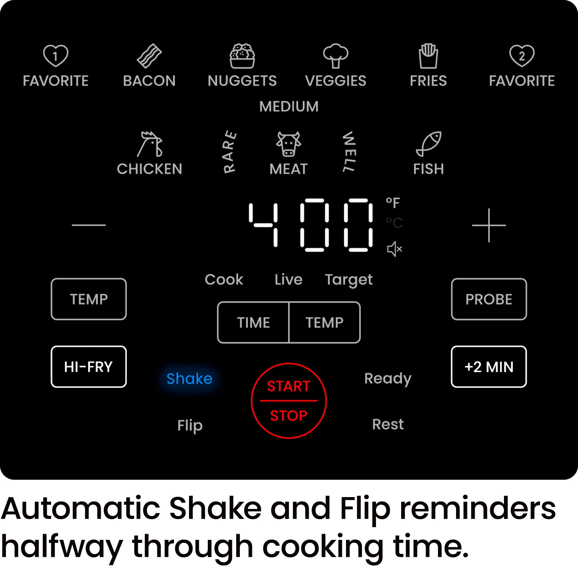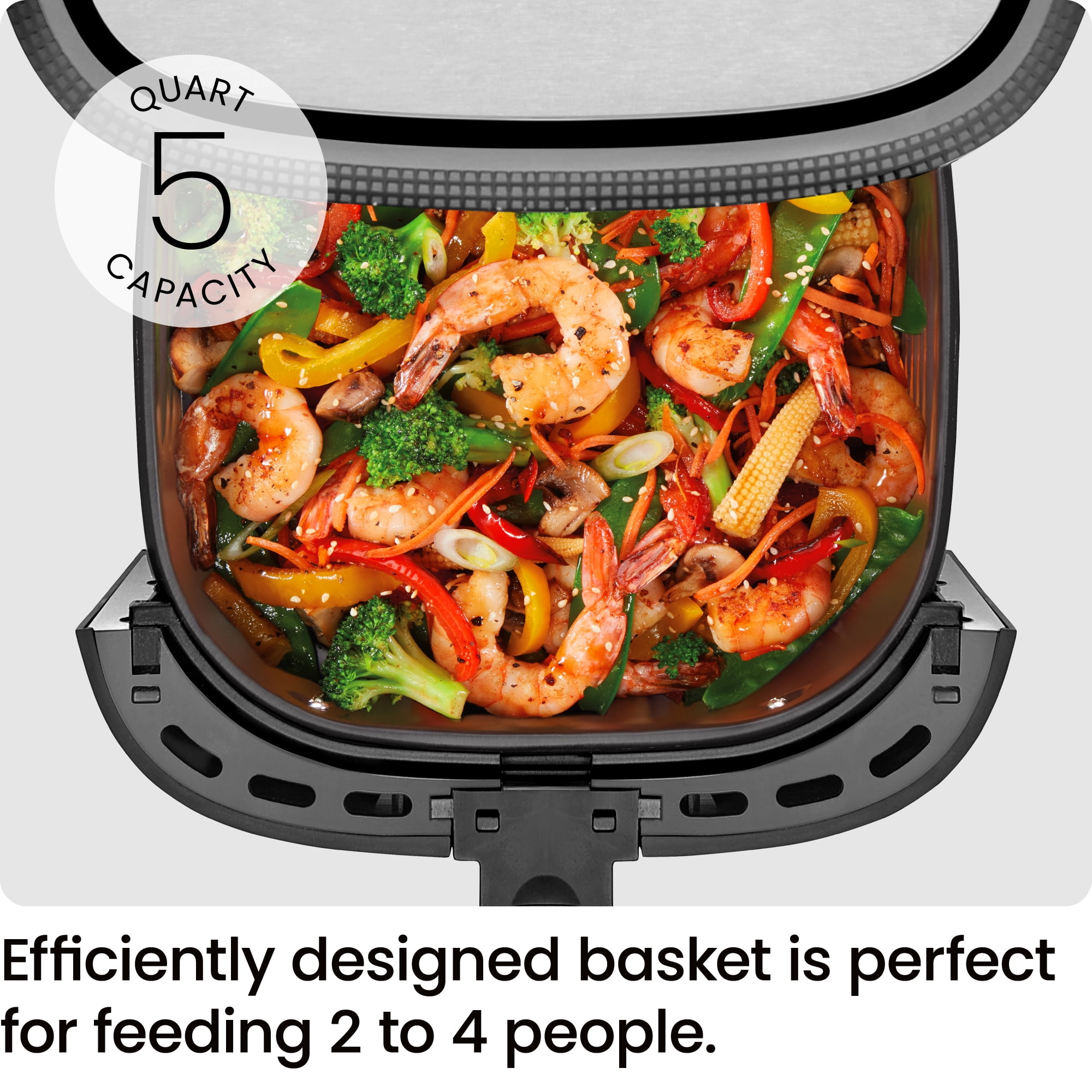 FRY WITH THE POWER OF AIR: Don’t sacrifice great taste for healthier cooking. Serve all the delicious fried foods your family loves using 98% less oil. Air fry chicken, vegetables, pizza, French fries, frozen foods, and even leftovers to a perfect crisp in minutes. PROBE PERFECTION: This big air fryer includes a removable integrated probe thermometer and advanced probe technology that effortlessly cooks chicken, fish, and meat to your ideal doneness with real-time temperature updates on the digital screen. Offers non-probe presets too! MEALS MADE IN MINUTES: The 5-quart large air fryer capacity holds enough to feed 2-4 to and will get dinner on the table quickly. Additionally, the square-shaped large basket saves space while providing ample interior cooking surface. CUSTOMIZED CRISP: With a cooking temperature range up to 450°F, you can create the perfect dish nearly oil-free no matter what’s on the menu. The new Hi-Fry option is the smart way to add a crisp finish, increasing the heat for the final two minutes of cooking. EASY TO CLEAN: This easily portable air fryer with removable fryer basket is dishwasher-safe for simplified cleanup. The stainless-steel exterior easily wipes down with a damp cloth to keep your small kitchen appliance looking like new. SAFETY FIRST: It’s okay to walk away while your food cooks—our electric fryer includes an automatic shutoff to ensure your food stops cooking when you want it to or in the event of a safety emergency. COUNTERTOP CHIC: The compact size and impressive capacity make this the perfect countertop cooking companion. The sleek stainless-steel design will seamlessly fit in with your other home kitchen appliances, apartment, or dorm room decor. 120 Volts/1500 Watts – RJ38-SQSS-5T2P-WM New