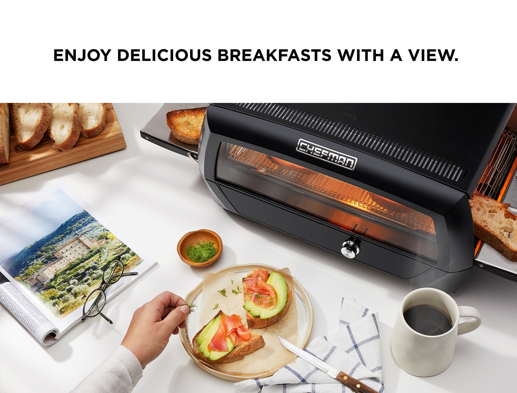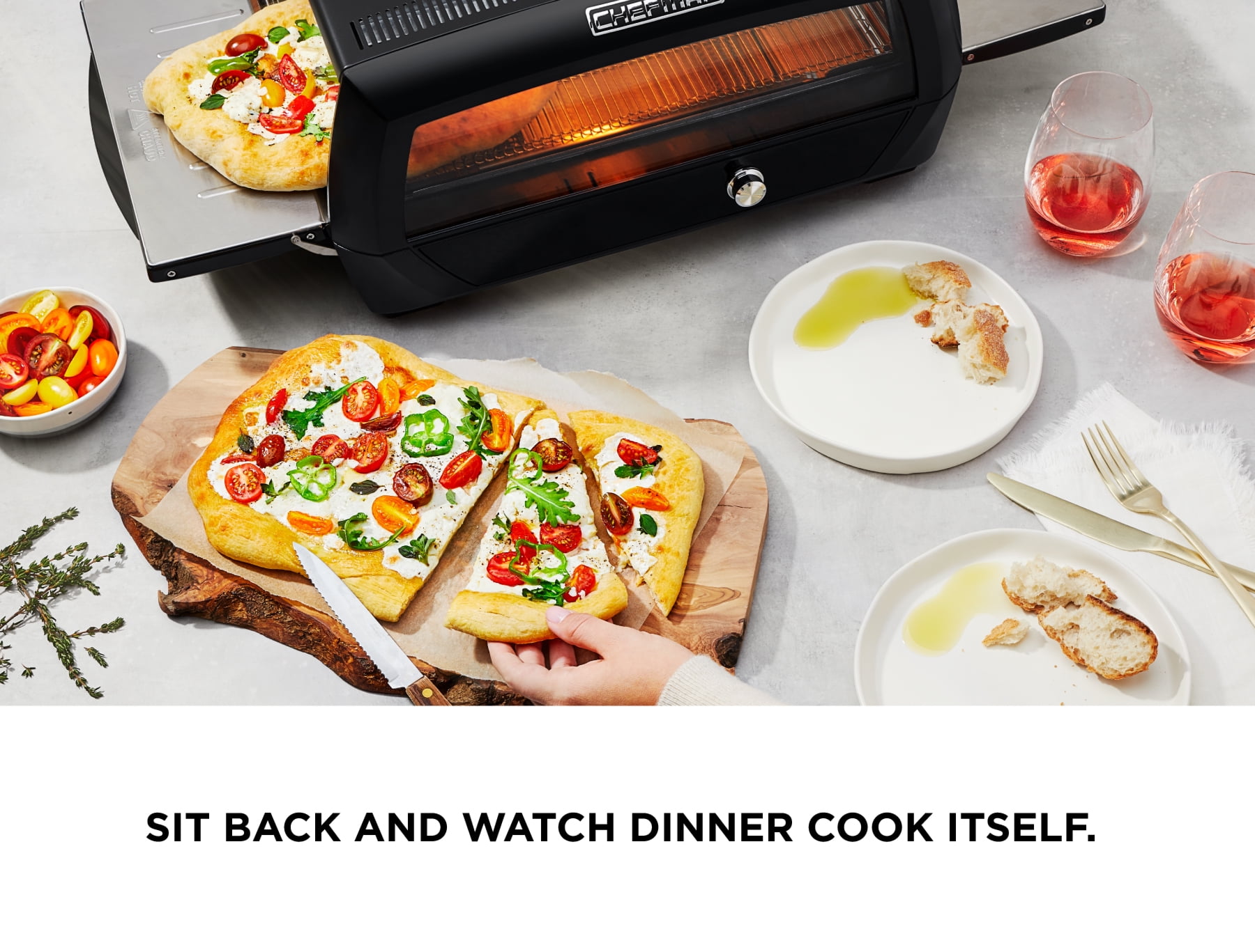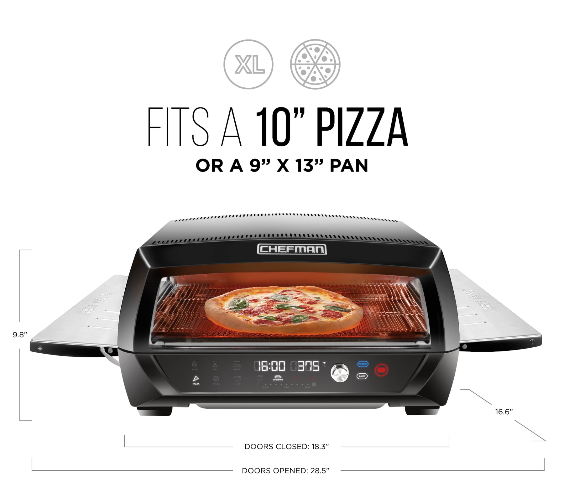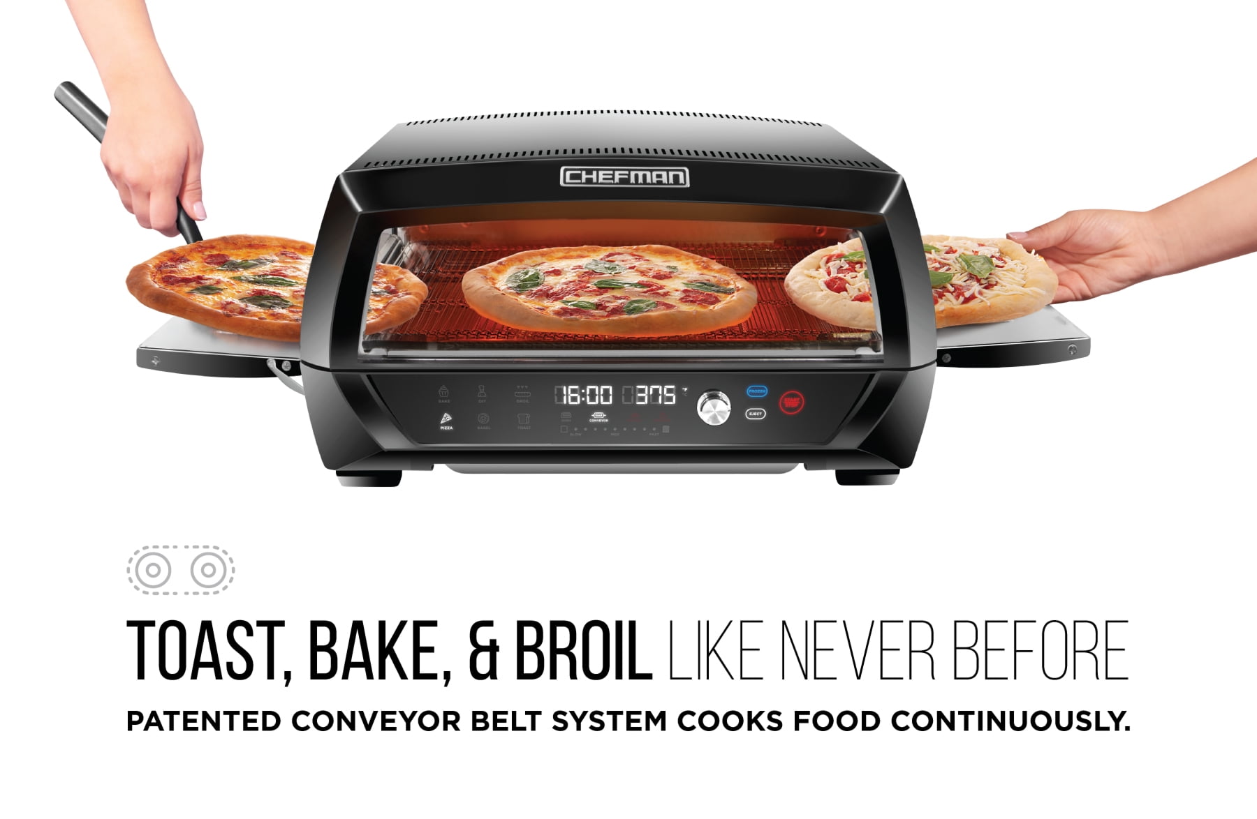 Patented conveyor belt system cooks food continuously and evenly Infrared and halogen heating technology 6 cooking presets including Toast, Bagel, Bake, Broil, Pizza and DIY Cooks meals up to 20% faster than traditional cooking methods Advanced digital display and efficient heating system Large viewing window & adjustable temperature control Removable dishwasher-safe conveyor belt and crumb tray Includes a bonus cooking pan that fits perfectly on the moving belt 1800 Watts/120 Volts Chefman RJ25-C NEW