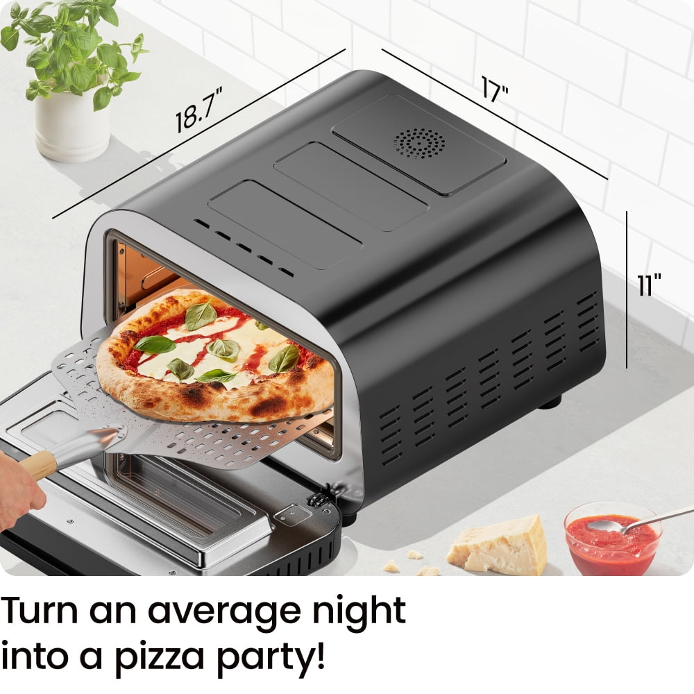 RAPID COOKING: Our electric indoor outdoor pizza oven is perfect for countertop use, quickly cooking up restaurant-quality pizza using up to 800°F temperature settings. VERSATILE DESIGN: The Chefman pizza cooker is perfect for any size kitchen. The sleek indoor pizza oven’s countertop design fits into compact spaces while making delicious homemade pizza in no time! 6 PIZZA PRESETS: Choose from our touchscreen pizza preset options including Neapolitan, New York, Thin-Crust, Pan, or Frozen. Or customize your pie with the Manual setting to get your perfect crust, every time. RESTAURANT QUALITY: With commercial oven technology, you can now make delicious pizzas like a professional chef right at home with our pizza maker machine. HIGH AND VARIABLE HEAT: Crank up the temperature on this countertop pizza oven. Both heating elements range from 300-800°F to make pizza your way, and retain the heat for back-to-back cooking. MAKE MULTIPLE PIZZAS: The double-paned window and high-heat design keeps the indoor pizza oven hot for making multiple pizzas back-to-back. ACCESSORIES INCLUDED: Our pizza oven indoor for home cooking includes a pizza stone and pizza peel, as well as a digital cookbook to jumpstart your pizza party. 1700 Watts/120 Volts RJ25-PO12-BLACK New
