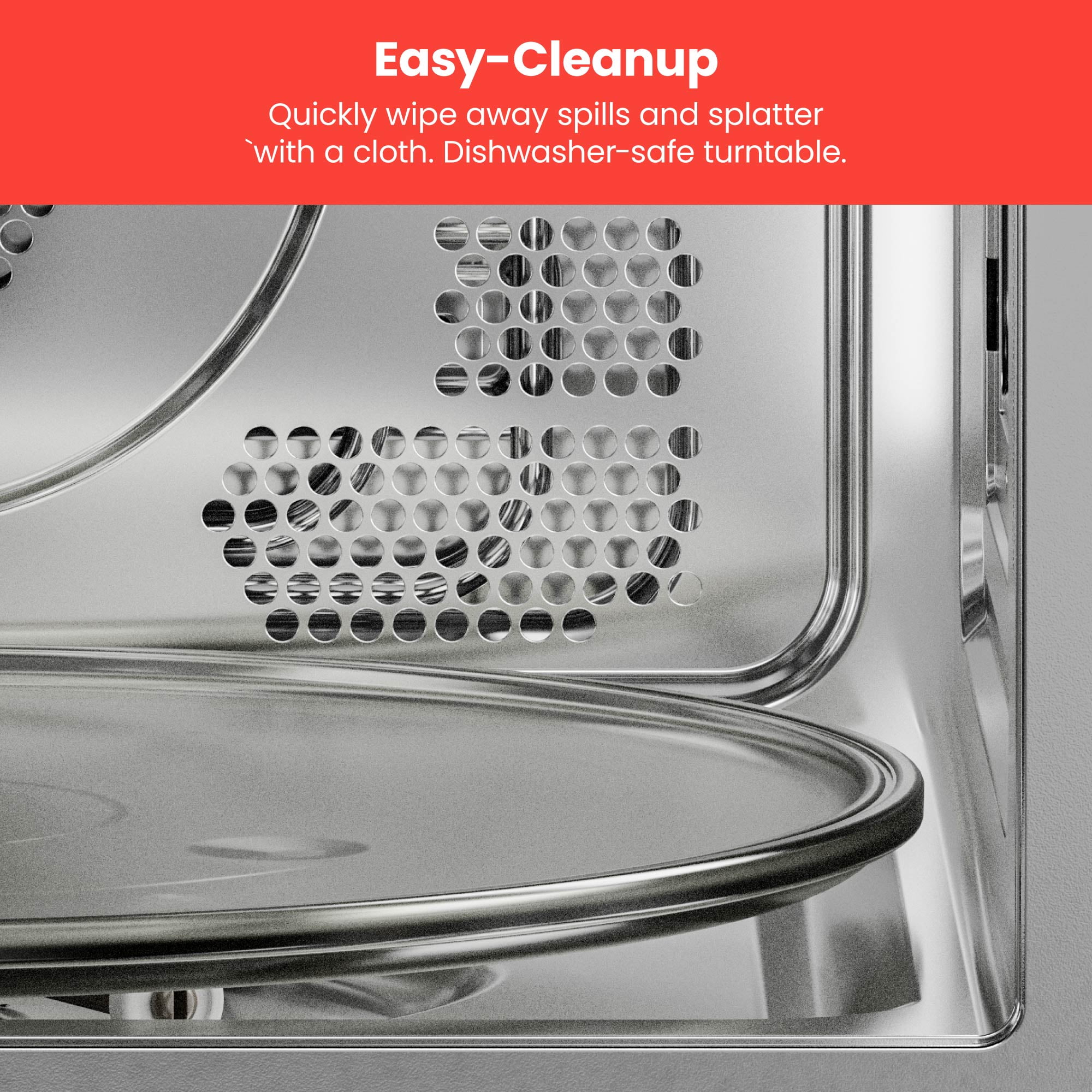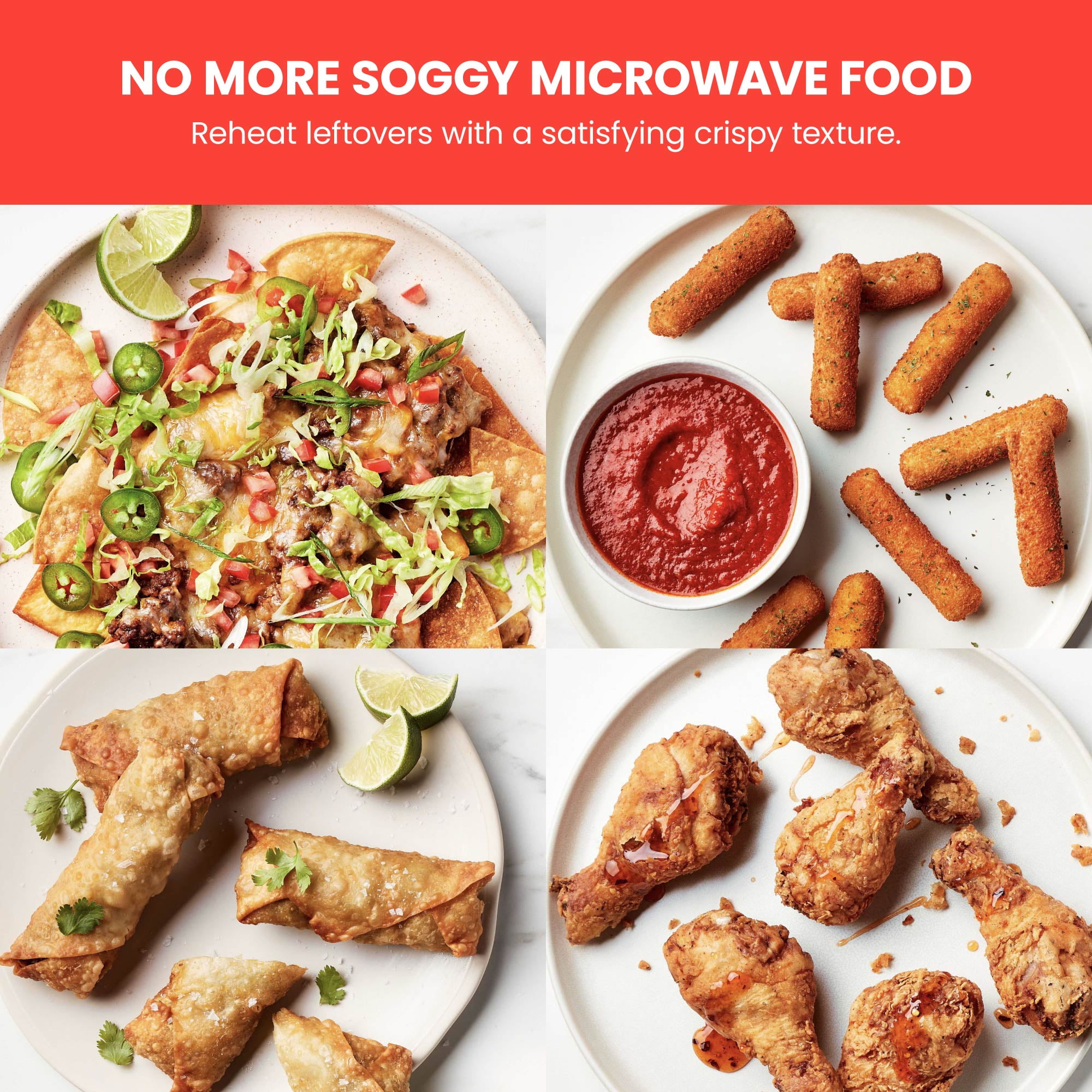 NO MORE SOGGY MICROWAVE FOOD: Reheat leftovers with a crispy crunch! Unlike other microwave ovens, the MicroCrisp features a convection crisper for integrated air fryer functions: perfect for crispy fries or to fully cook raw poultry. POWER COMBO COOKING: The unique micro-and-crisp function offers phase cooking options, with the same results from microwave ovens and air fryers but all in one appliance. Heat up leftover fried chicken, then crisp it with convection heat! STREAMLINED SETUP: The user-guided touch control panel on our MicroCrisp countertop microwave oven helps you choose the perfect cooking time, power level, and function for the results you want without any of the guesswork. GUESS-FREE PRESETS: With 6 guided preset menus, you don’t have to guess how long to cook your favorites. Simply choose your food and your convection microwave will do the rest, making it the perfect microwave popcorn popper! KEEP IT QUIET: The alarm mute option silences all microwave cooker alarms. Allow your baby to sleep soundly in the middle of the day, or for early risers or night owls, keep your noise to a minimum while the rest of the house sleeps. PERFECTLY SIZED: This 18.5 x 16.3 x 11-inch mini microwave has a 0.8 cubic foot capacity: perfectly sized to cook everything you need while still fitting in seamlessly with your other kitchen appliances. The black stainless steel microwave blends in well with any style of kitchen décor. BIG POWER: The unique power cooking combo has a 900W microwave with cooking power levels from 1-10, and 1800W countertop convection oven function at 425°F. Achieve that perfect air fryer heat so you can look forward to your leftovers. EASY CARE: The easy wipe-down interior and dishwasher-safe glass cooking plate allow spills and crumbs to get easily cleaned up, so you can keep your microwave countertop oven looking like new. 1800W/120V-RJ55-MF-8 NEW