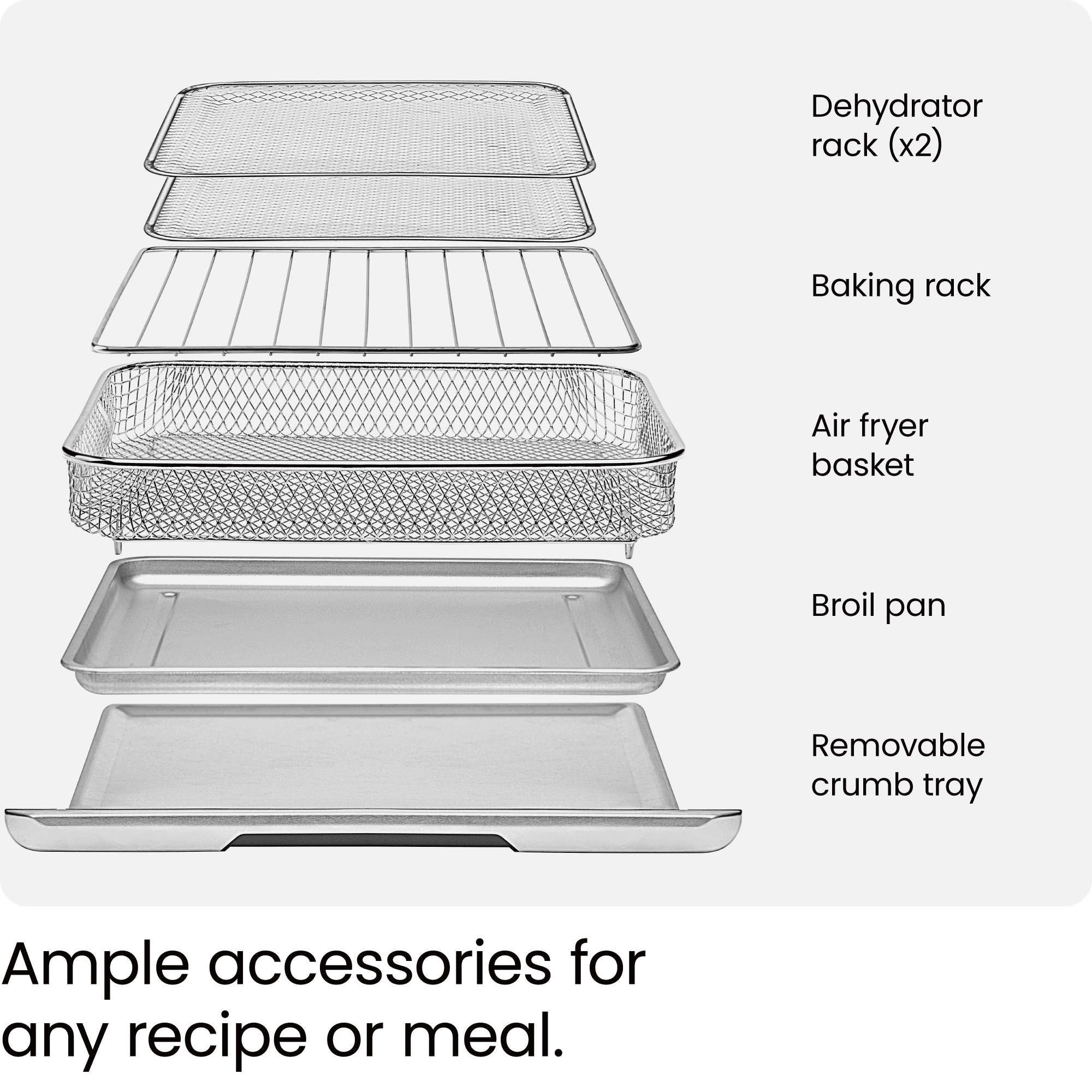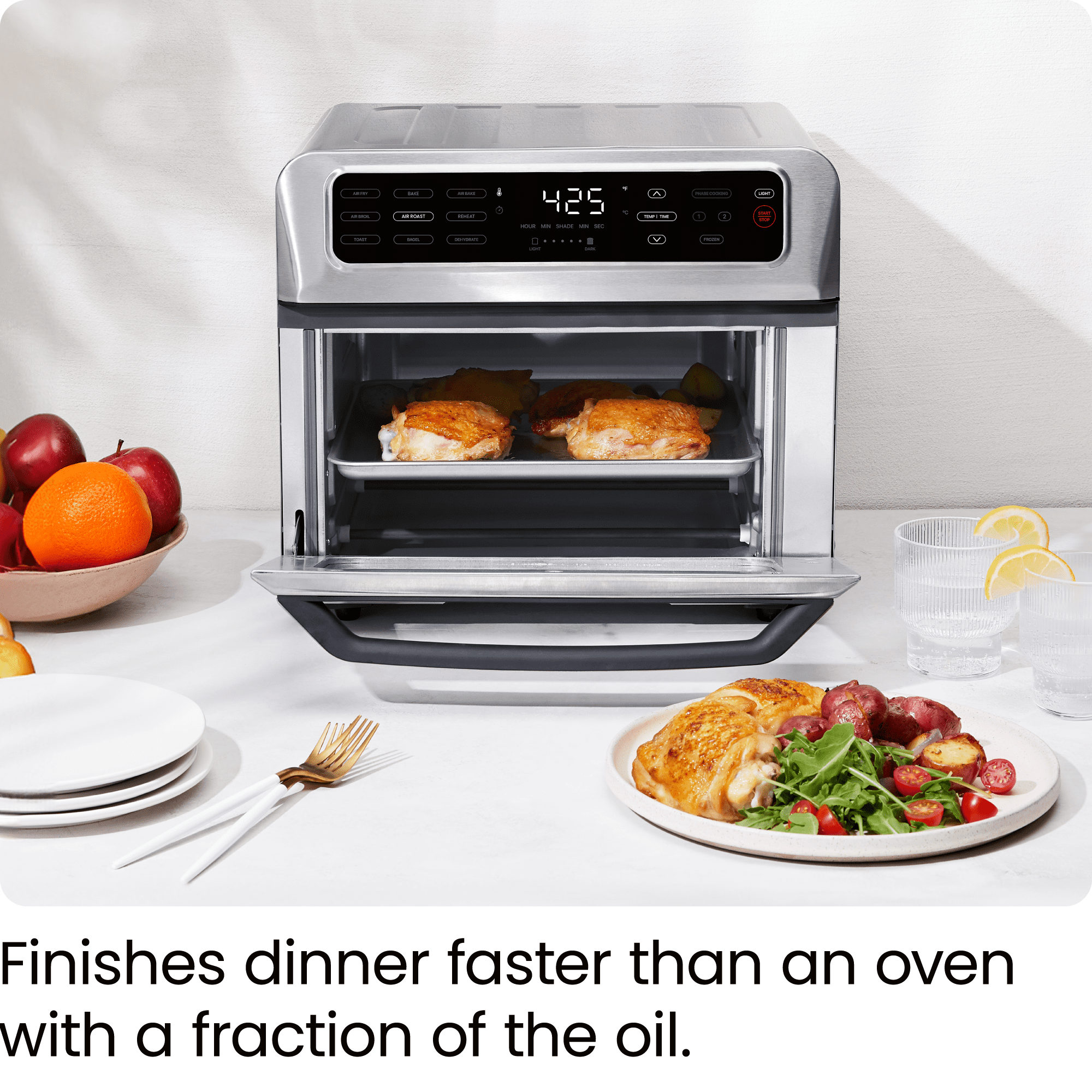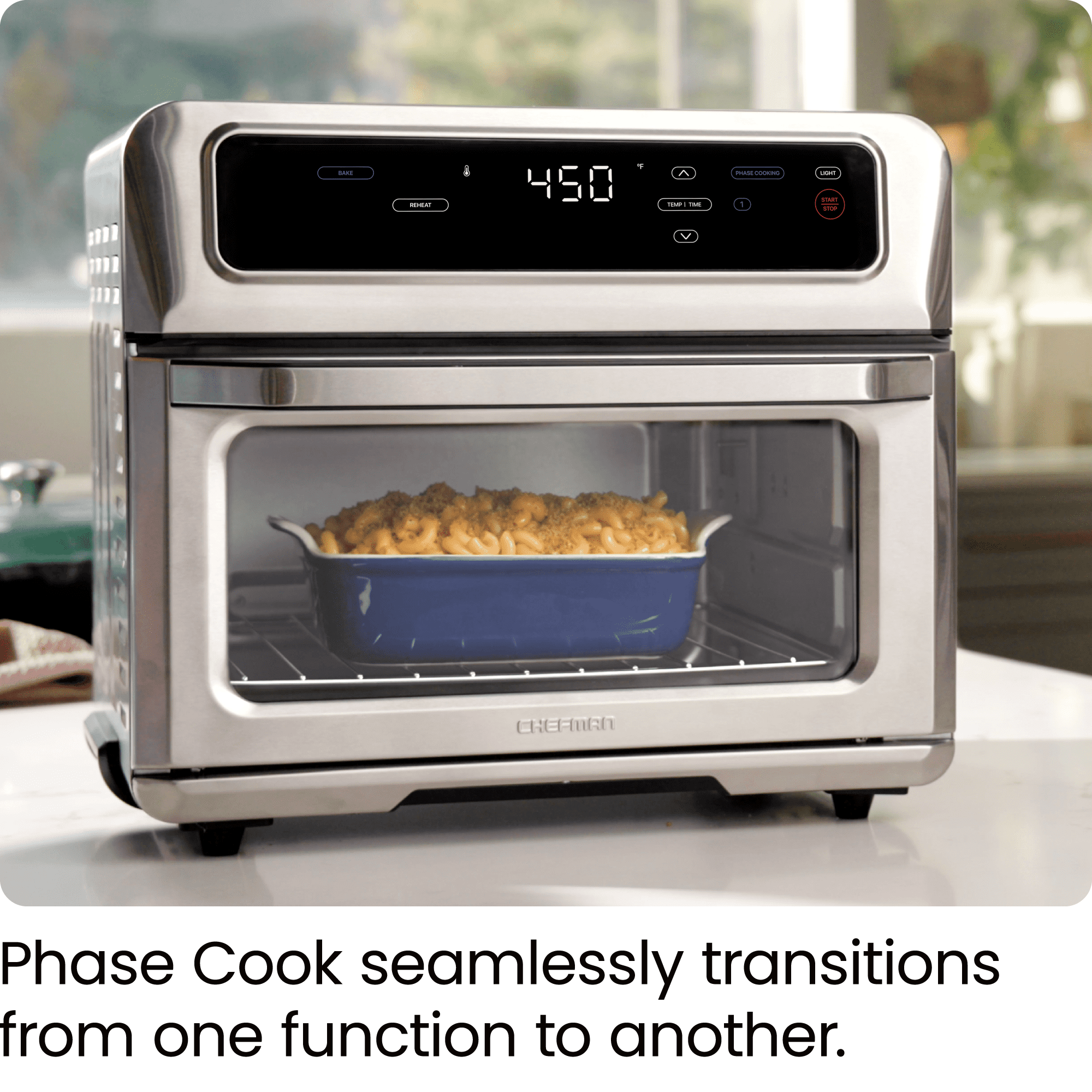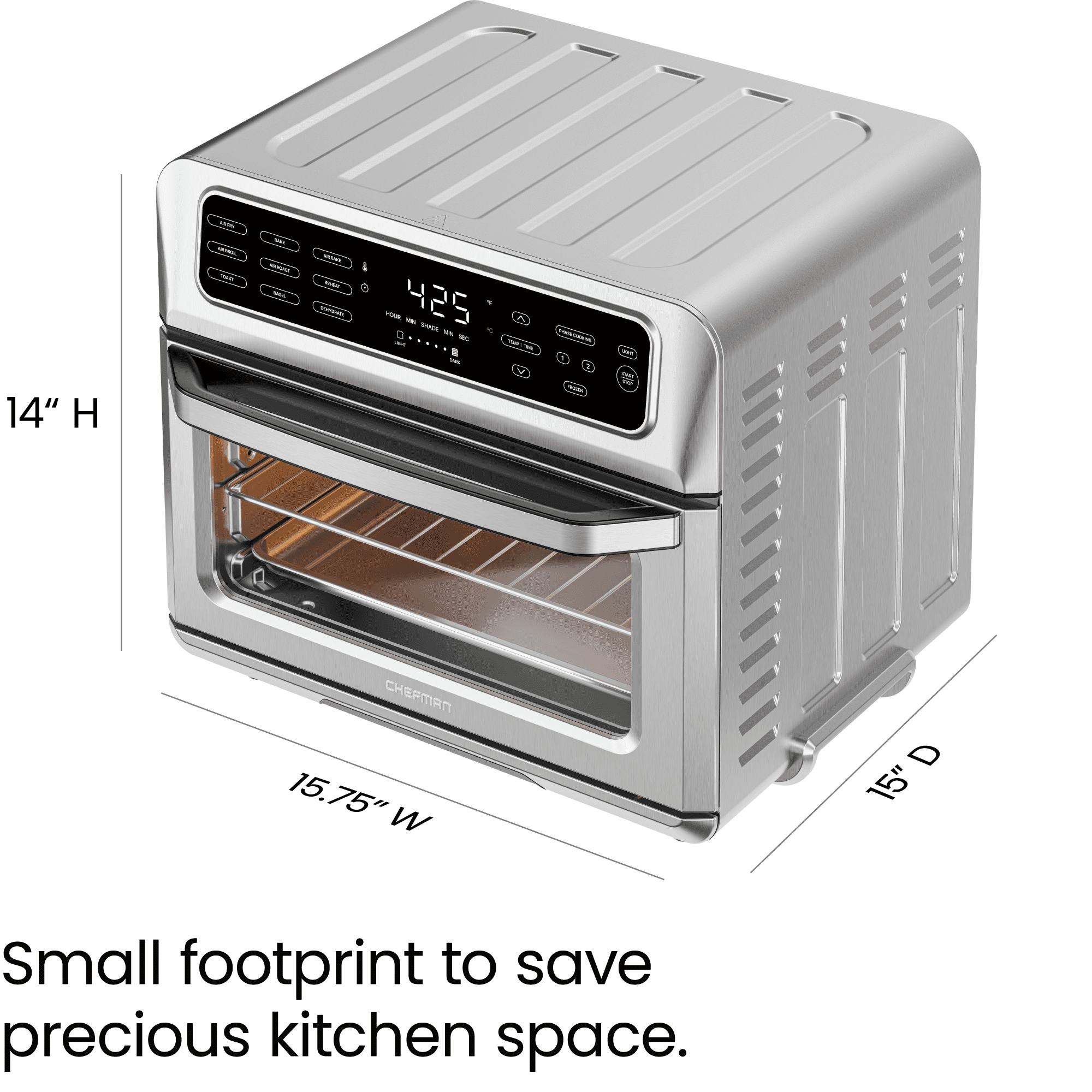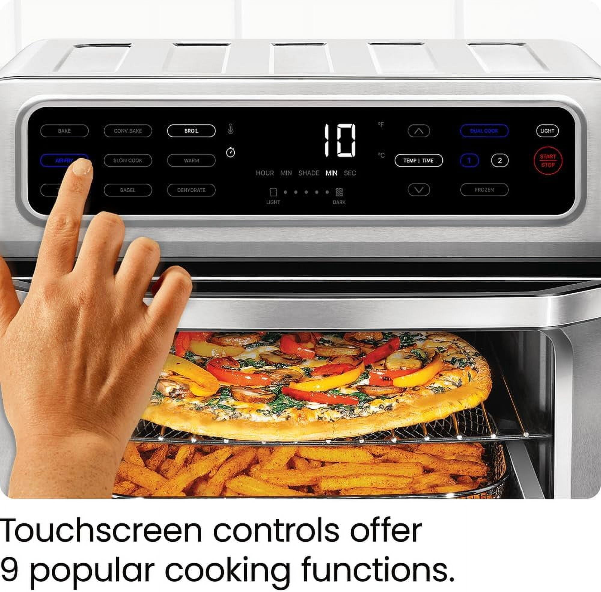 DUAL FUNCTION COOKING: Automatically transitions between cooking presets for precise cooking of your favorite foods, just set it and forget it. Enjoy your favorite fried food without any extra oil needed. The high-speed convection fans speed up baking & provide that desired fried finish & flavor. 9 VERSATILE PRESETS: This versatile 9-in-1 appliance air fries, bakes, broils, convection bakes, convection broils, toasts, and more. The temperature range of 200-450°F makes it easy to achieve a healthy, crispy, fried finish using less oil than traditional fryers – or no oil at all. Make better-for-you fries that are just as crispy and tasty, roast a whole chicken, or perfect your avocado toast all in one appliance. XL FAMILY SIZE: Extra guests, or just extra hungry? Either way, this toaster oven air fryer was thoughtfully designed with the whole family in mind. The spacious 20-liter capacity fits 4 slices of toast, a 10-inch pizza, or whole chicken so you can make plenty of food for the entire family – without heating up your oven. AUTO SHUTOFF & EASY CLEANING: For added safety, the toaster oven airfryer is equipped with advanced over-heat protection. The included broil pan, two dehydrator racks, air fry basket, baking rack, and removable crumb tray are dishwasher safe, while the interior walls are nonstick making for easy cleanup. Plus, the stainless steel exterior is cool-touch for even easier operation. RESOURCES: UL certified with advanced safety technology for long lasting durability, & 1-year assurance provided by Chefman, so you can purchase worry-free! 120 Volts, 1800 Watts. – RJ50-SS-T New