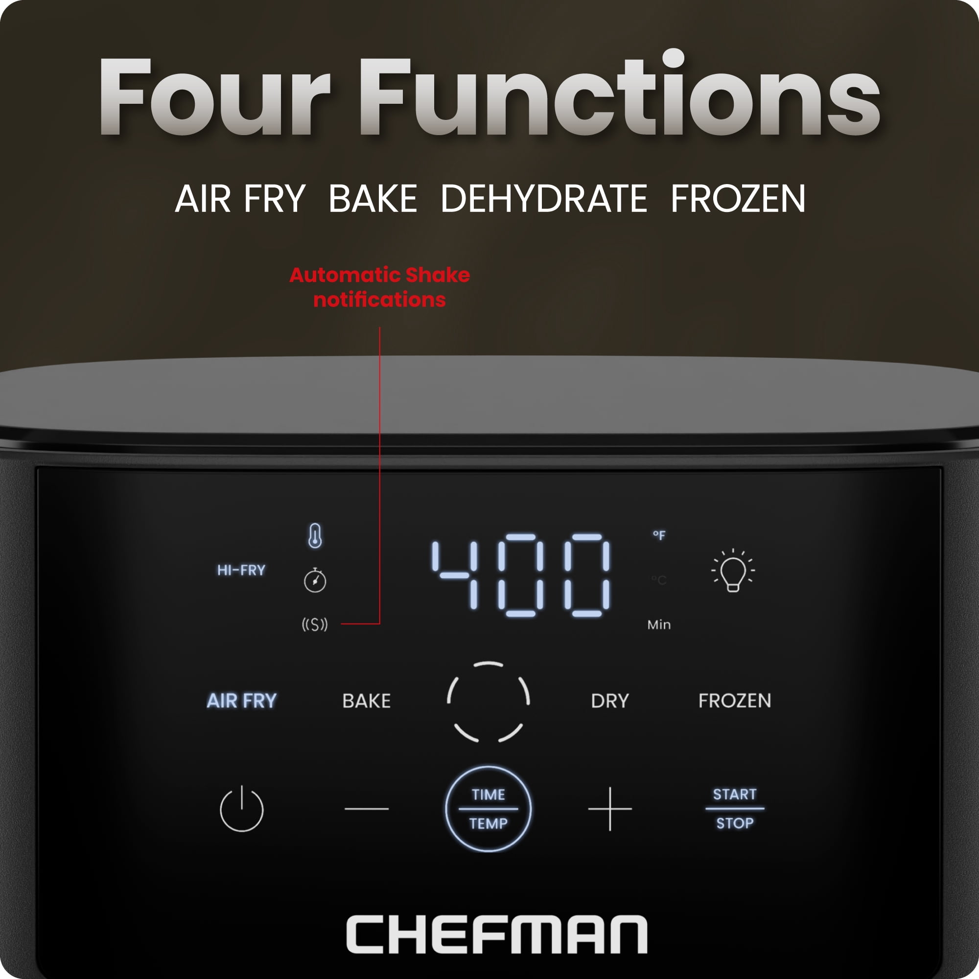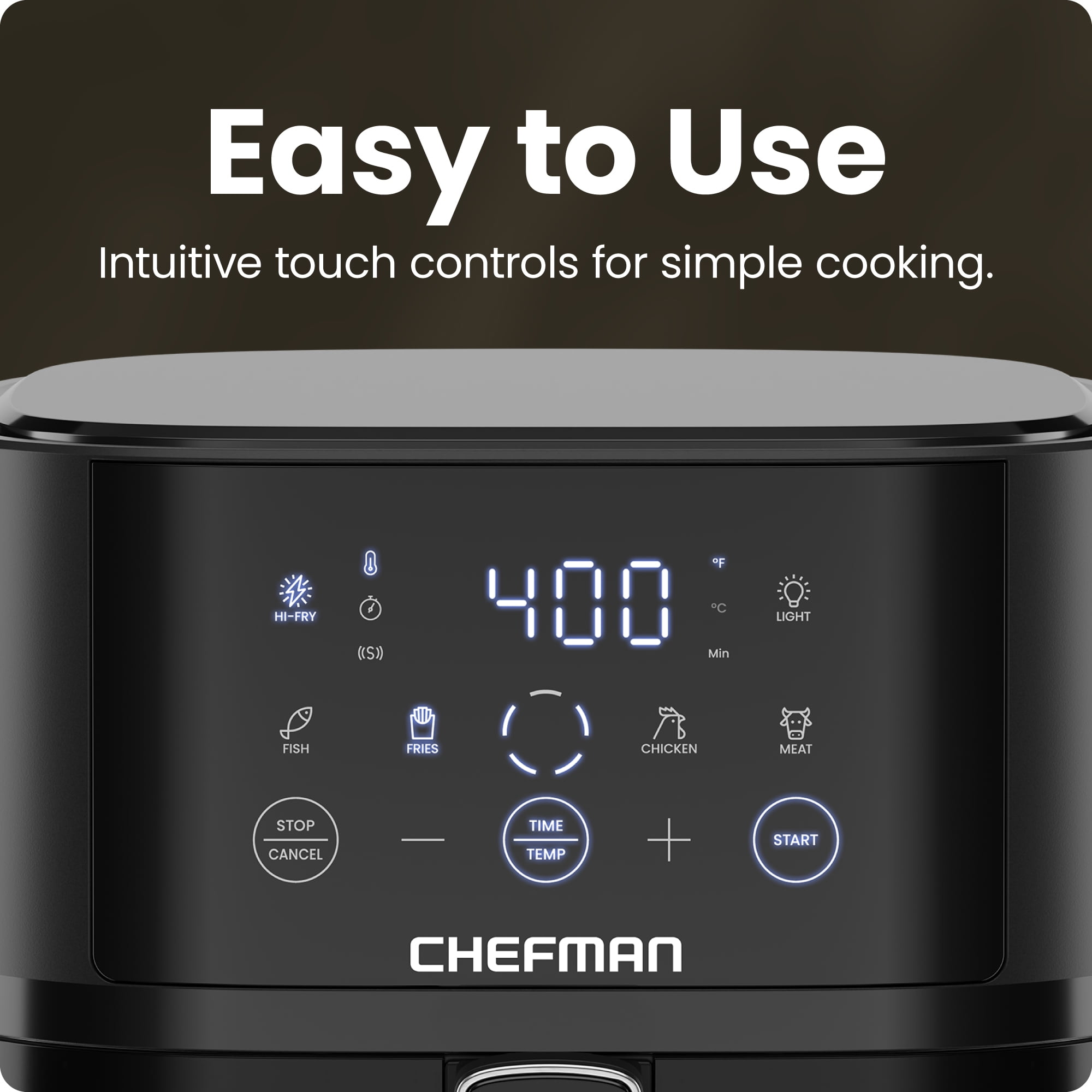 FAST AND EASY: This compact air fryer handles any culinary challenge. Customize cooking time and temperature with the digital touch screen display or use one of four preset functions for quick, one-touch meals. Perfect for serving 2-4 people. 450°F HI-FRY TECHNOLOGY: Achieve the perfect finishing crunch on your air-fried favorites. Increase the heat to 450°F during the final two minutes of cooking: perfect for extra crispy chicken tenders and French fries. STYLISH AND COMPACT: The sleek, narrow design of this air fryers maximizes its 4-quart capacity while minimizing its countertop footprint. Its compact size makes it a great space saver, fitting perfectly on your counter or in your cabinets. HEALTHY COOKING: Enjoy delicious meals with little-to-no oil. This Chefman small air fryer lets you cook healthier, low-fat meals that still taste amazing. EASY-VIEW WINDOW: Watch your food fry to your ideal finish. The integrated cooking window on the basket ensures that you can see just how crispy your food gets with only a fraction of the cooking oil. SHAKE NOTIFICATIONS: Get notified with an audible alarm halfway through cooking, reminding you to shake your food for the crispiest results possible. SIMPLE CLEAN-UP: The 4-quart nonstick basket and rack are both dishwasher safe, making clean-up quick and easy. The stylish black finish is timeless and easy to wipe clean with a damp cloth. SAFETY FIRST: With automatic shutoff technology, this air fryer ensures added safety by turning off when cooking is finished or when the basket is removed. 1500W/120V – RJ38-4TW-BLACK NEW