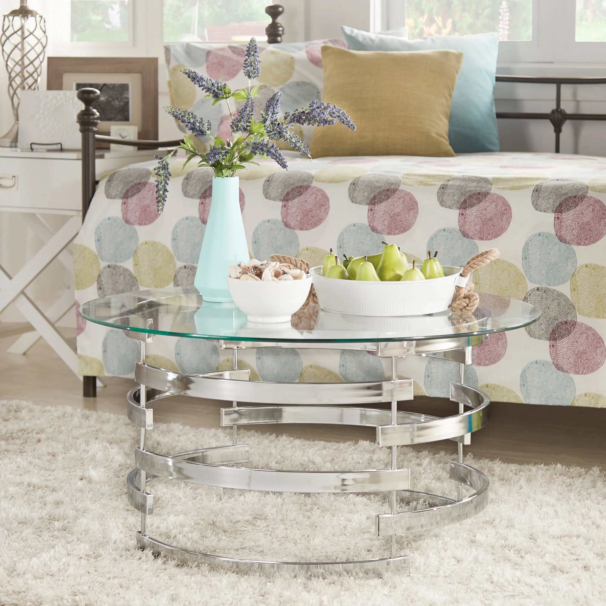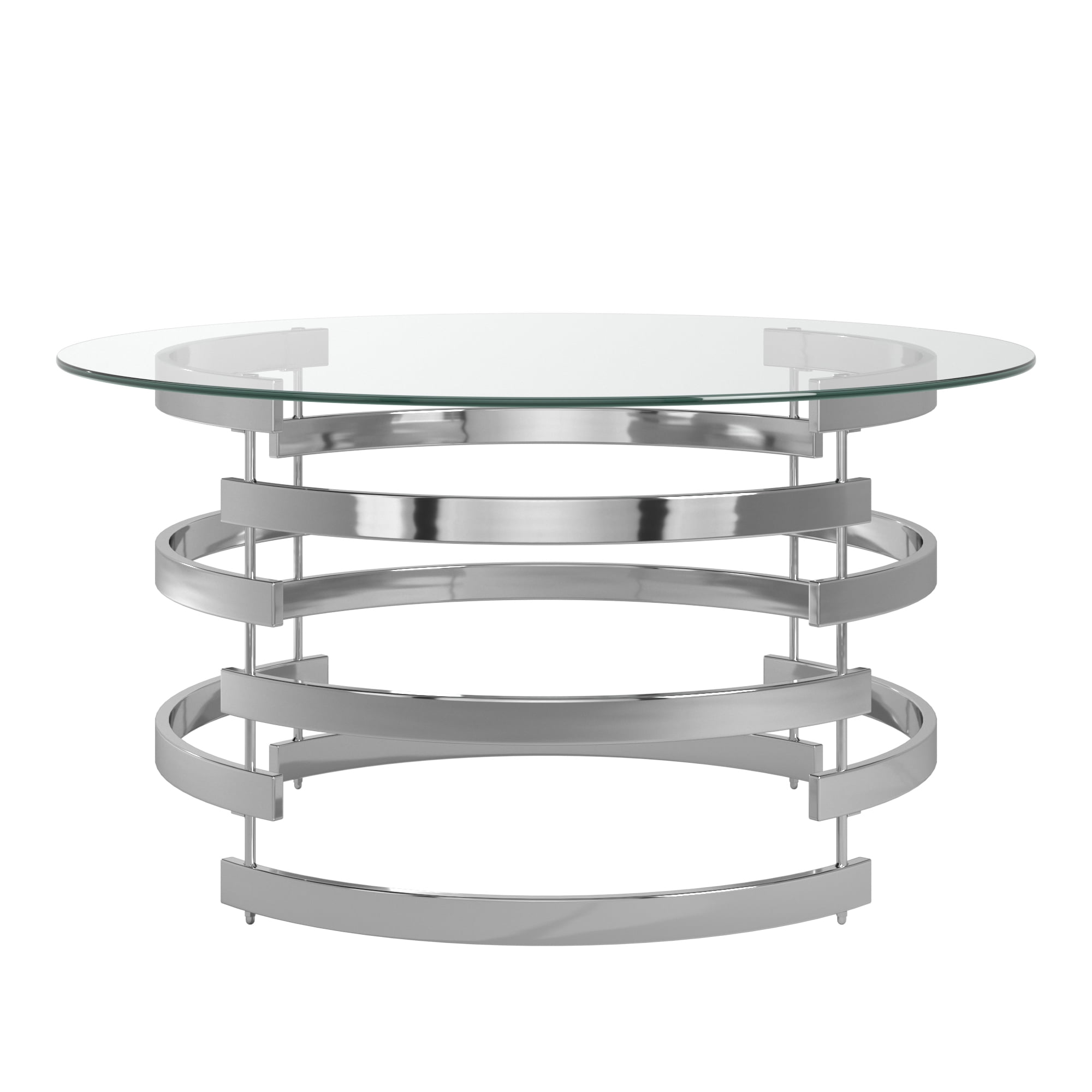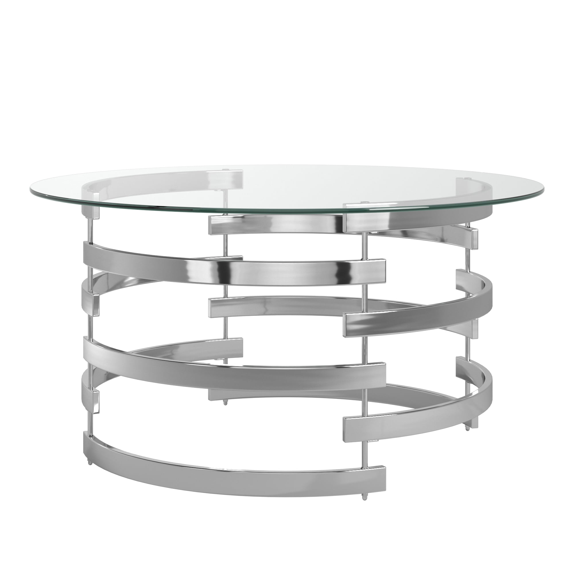 Glass Tabletop Table shape: Round Overall dimensions: 18.25″ H x 35.25″ diameter Material: Chrome, glass Assembly required Glass Top Dimensions: 35.25″ diameter Table base dimensions: 28.25″ diameter Sleek modern design