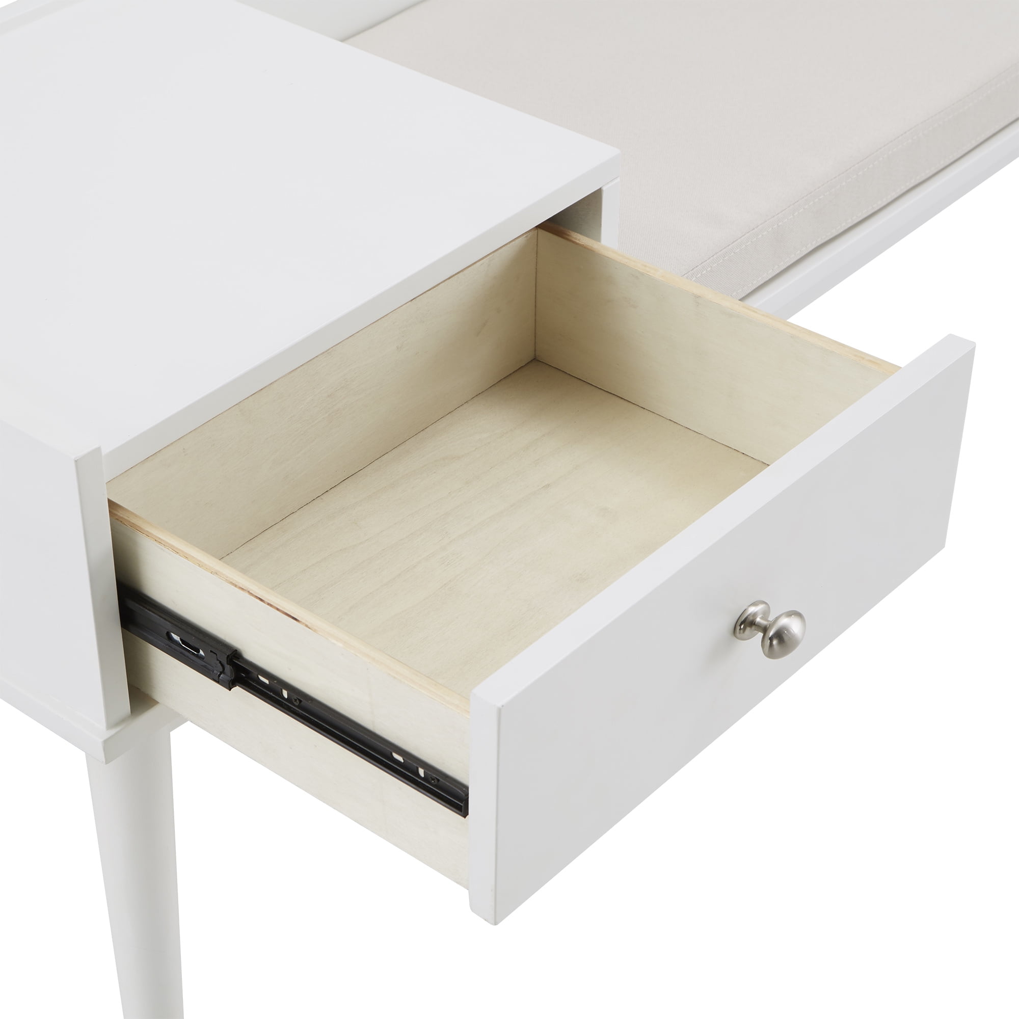 Set includes One (1) Bench and One (1) Cushion Crafted of Linen fabric, foam, rubberwood, MDF, veneer Finish: Espresso, grey, black, white, yellow Beige linen cushion with foam fill One drawer with metal ball bearing glides Brushed nickel drawer pull Weight tested up to 250 pounds per seat ,li>Cushion thickness: 2.5 inches Clearance under bench: 12.8 inches Overall Dimensions: 47 inches wide x 17.7 inches deep x 23 inches high Drawer interior dimensions: 15.2 inches wide x 10.9 inches deep x 4 inches high