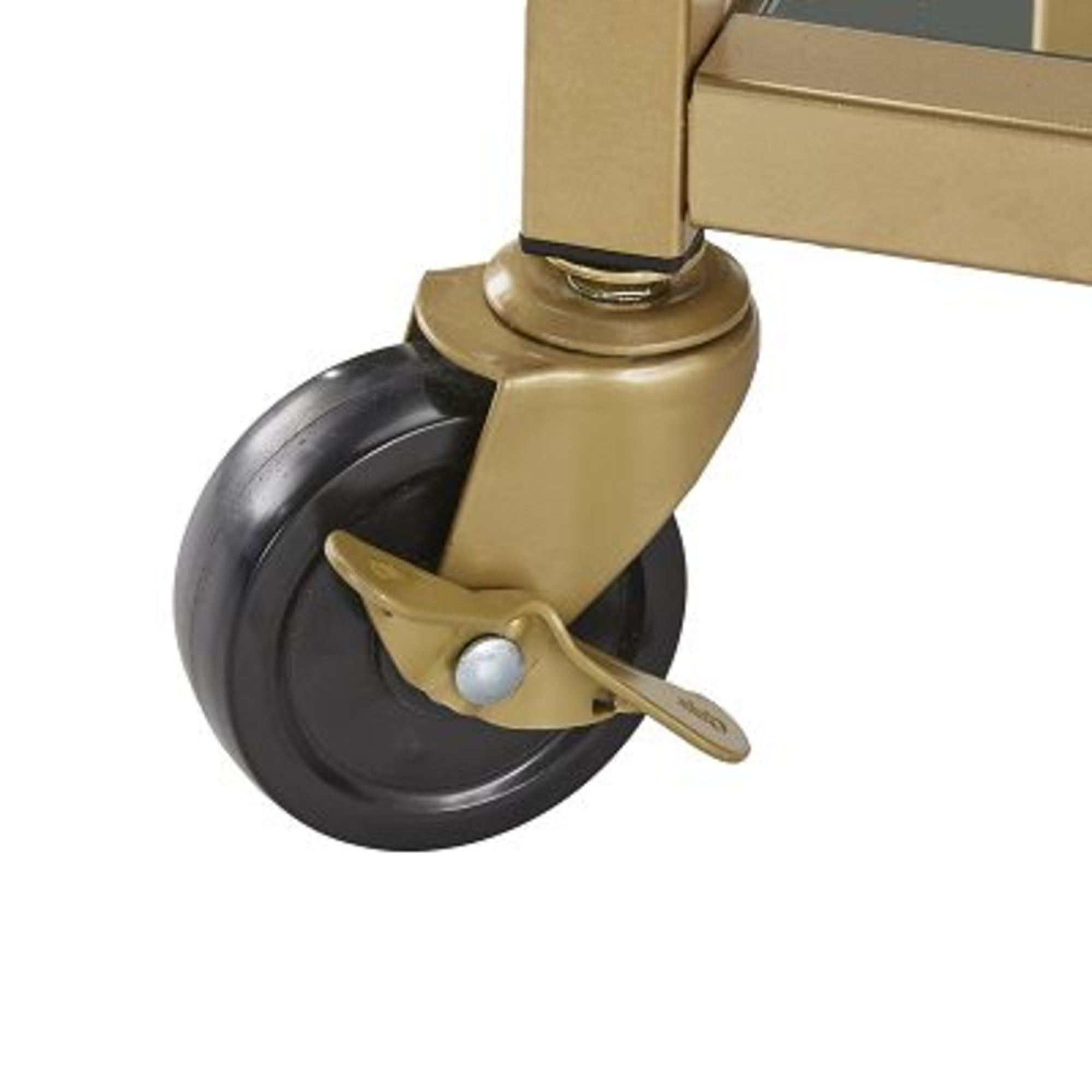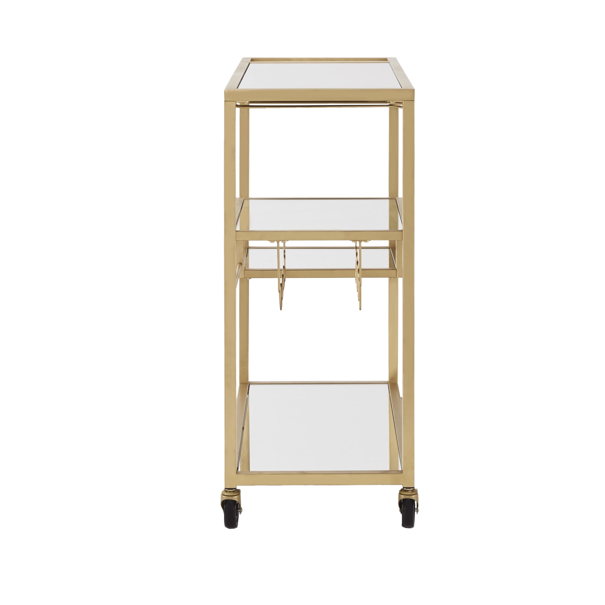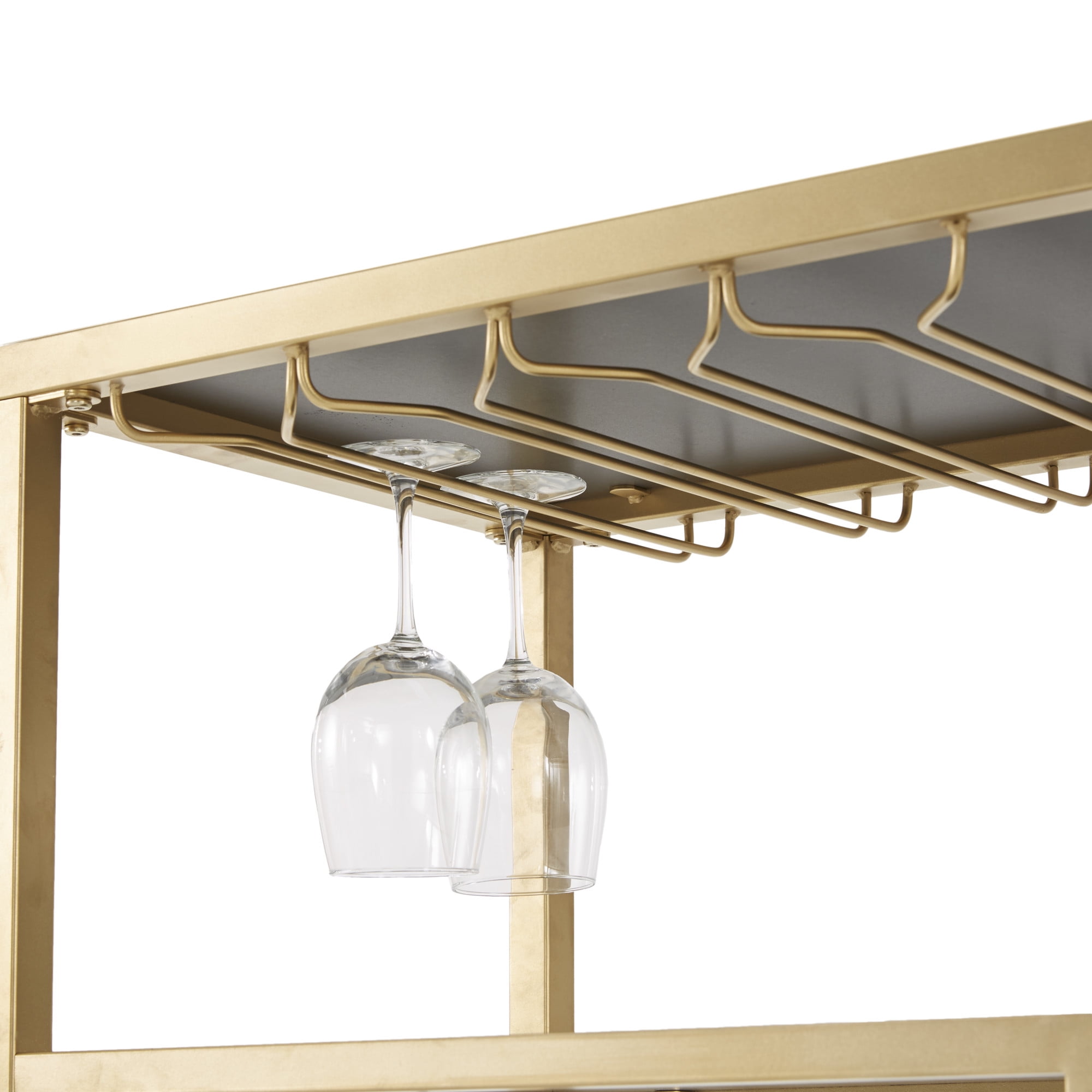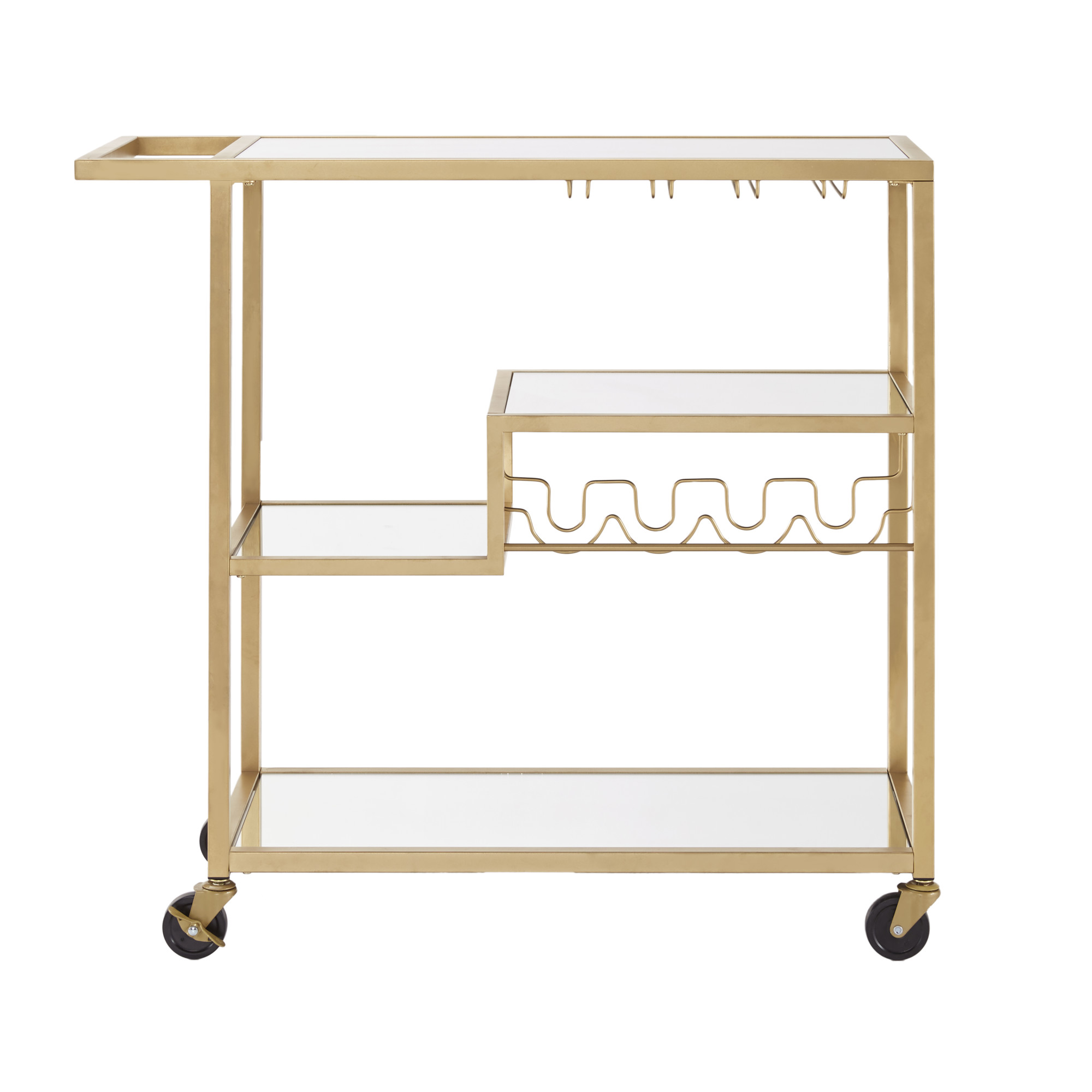 Four (4) glass shelves with black backing The wire rack holds up to four (4) bottles Features four (4) stemware racks for glasses Two locking wheels keep the cart in place Constructed with steel, glass, plastic, and plywood Overall dimensions: 40 in width x 16 in depth x 37.4 in height Clearance under cart: 5.2 in. Includes one (1) bar cart Color: Champagne Gold Metal frame