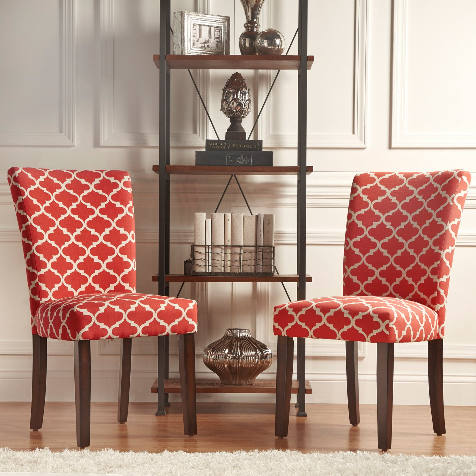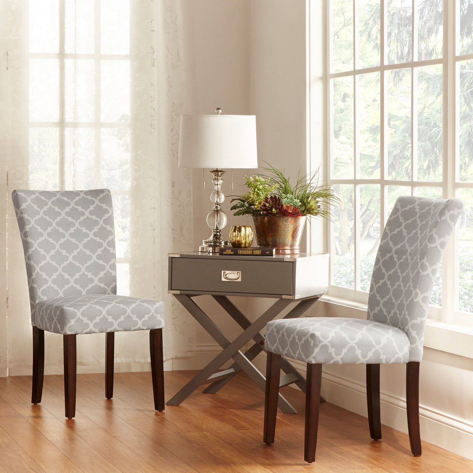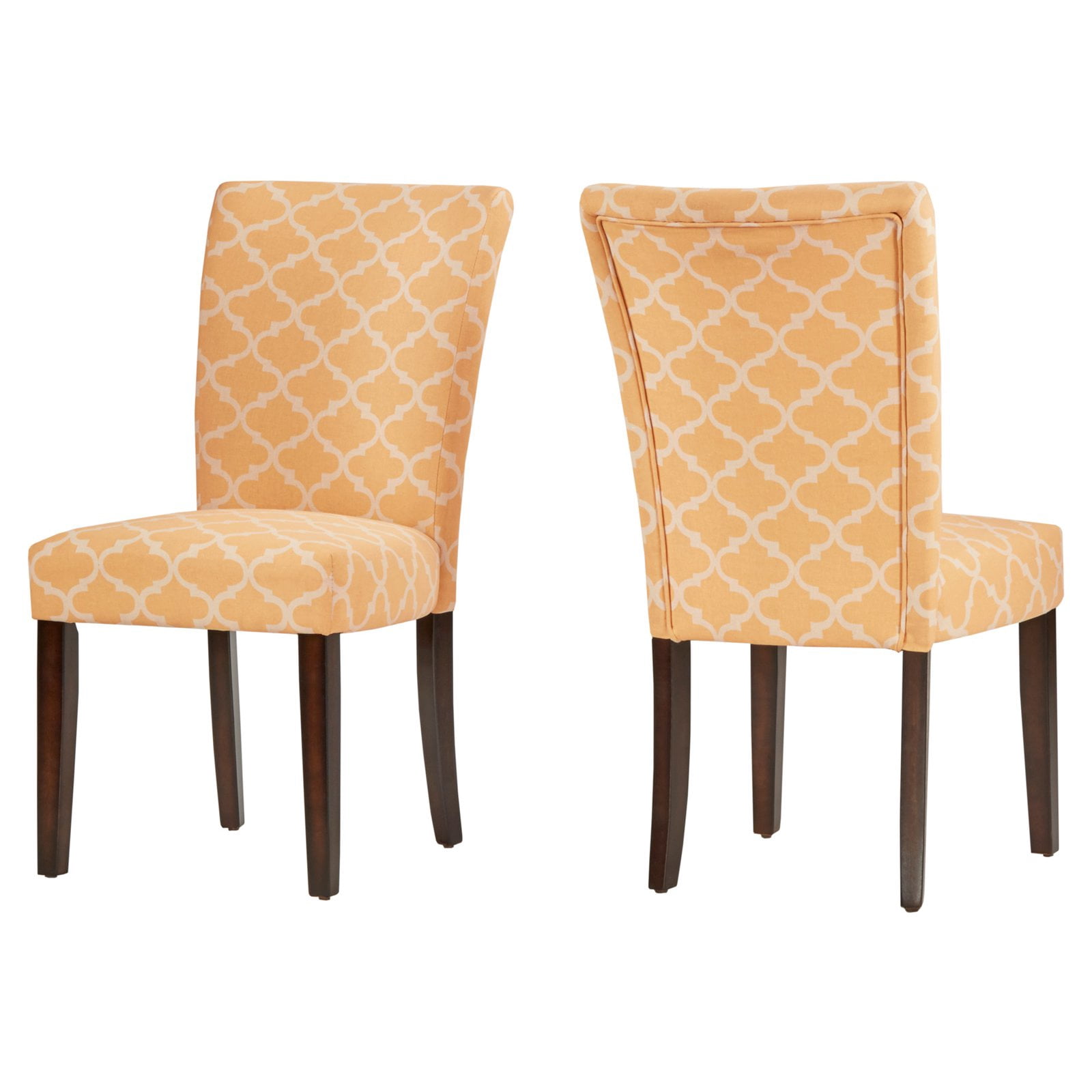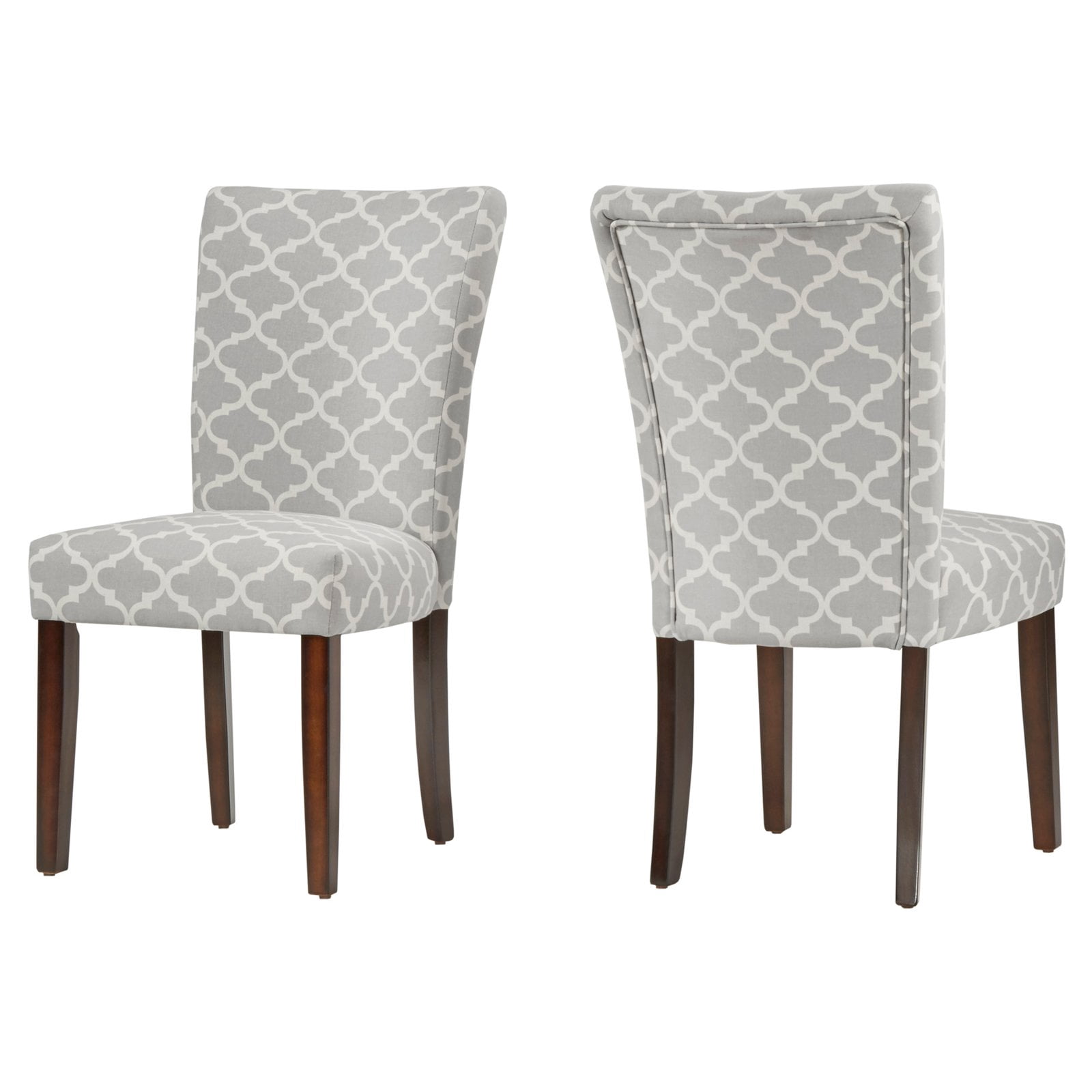 Dimensions: 24.75W x 19D x 38.5H in. Set of 2 Durable wood frame Elegant chenille upholstery in your choice of available color options Rich espresso wood finish Global quatrefoil pattern Spring suspension in foam-padded seats for optimal support Transitional style