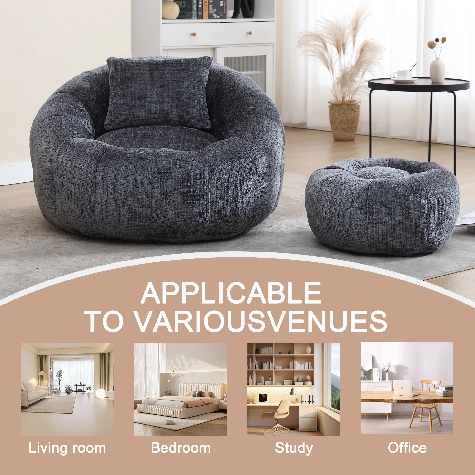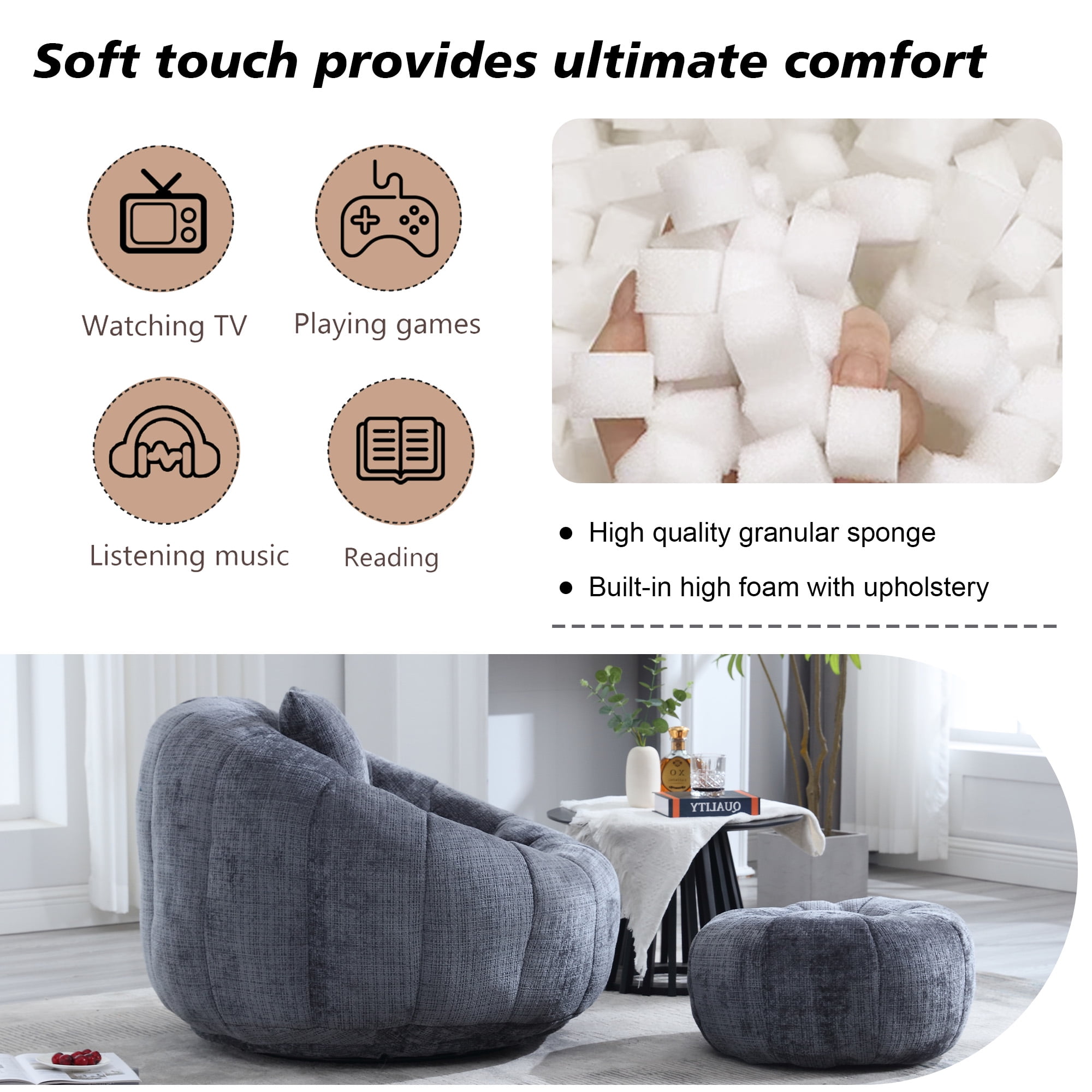 Chenille Upholstered Round Lazy Cozy Bean Bag Chair with Ottoman-Gray