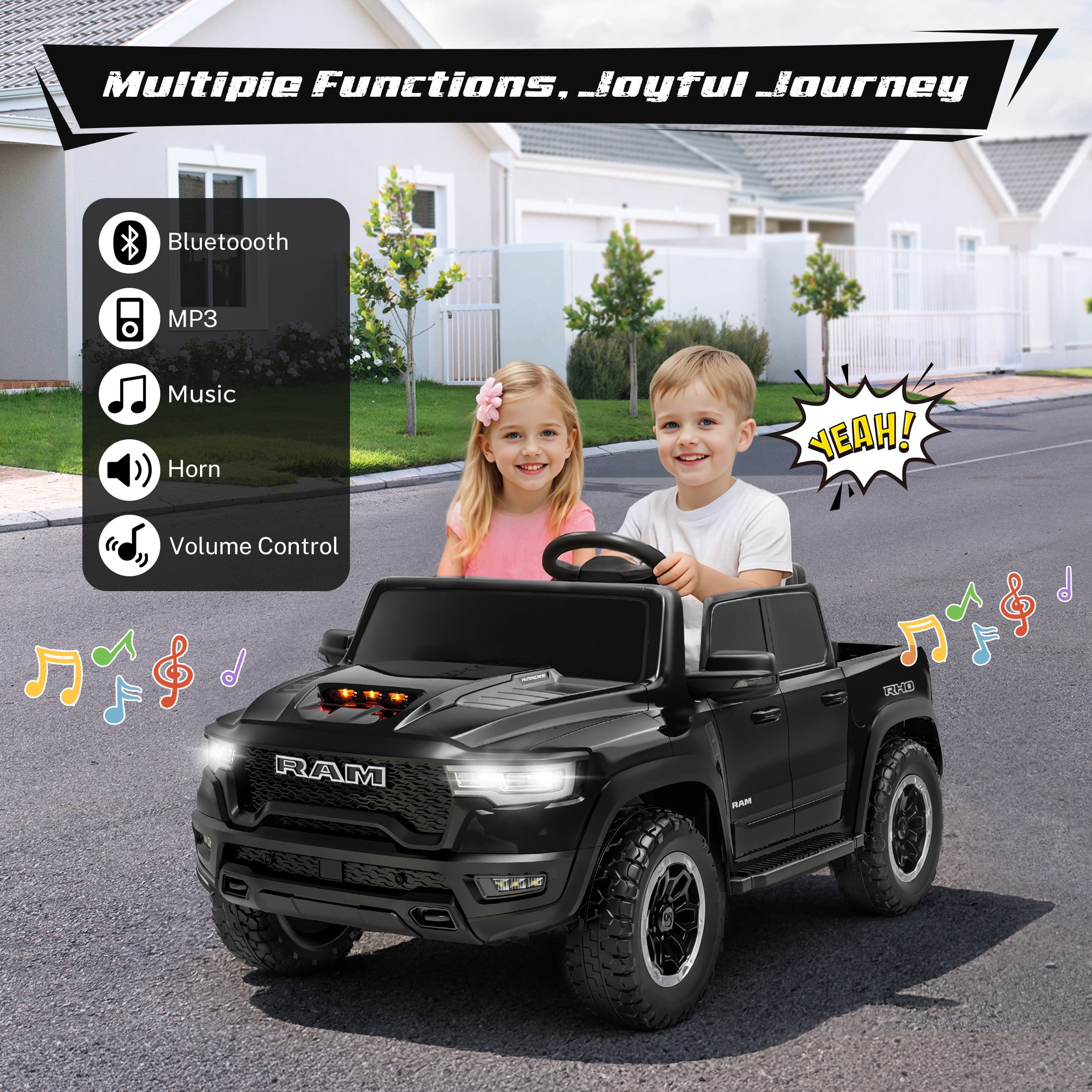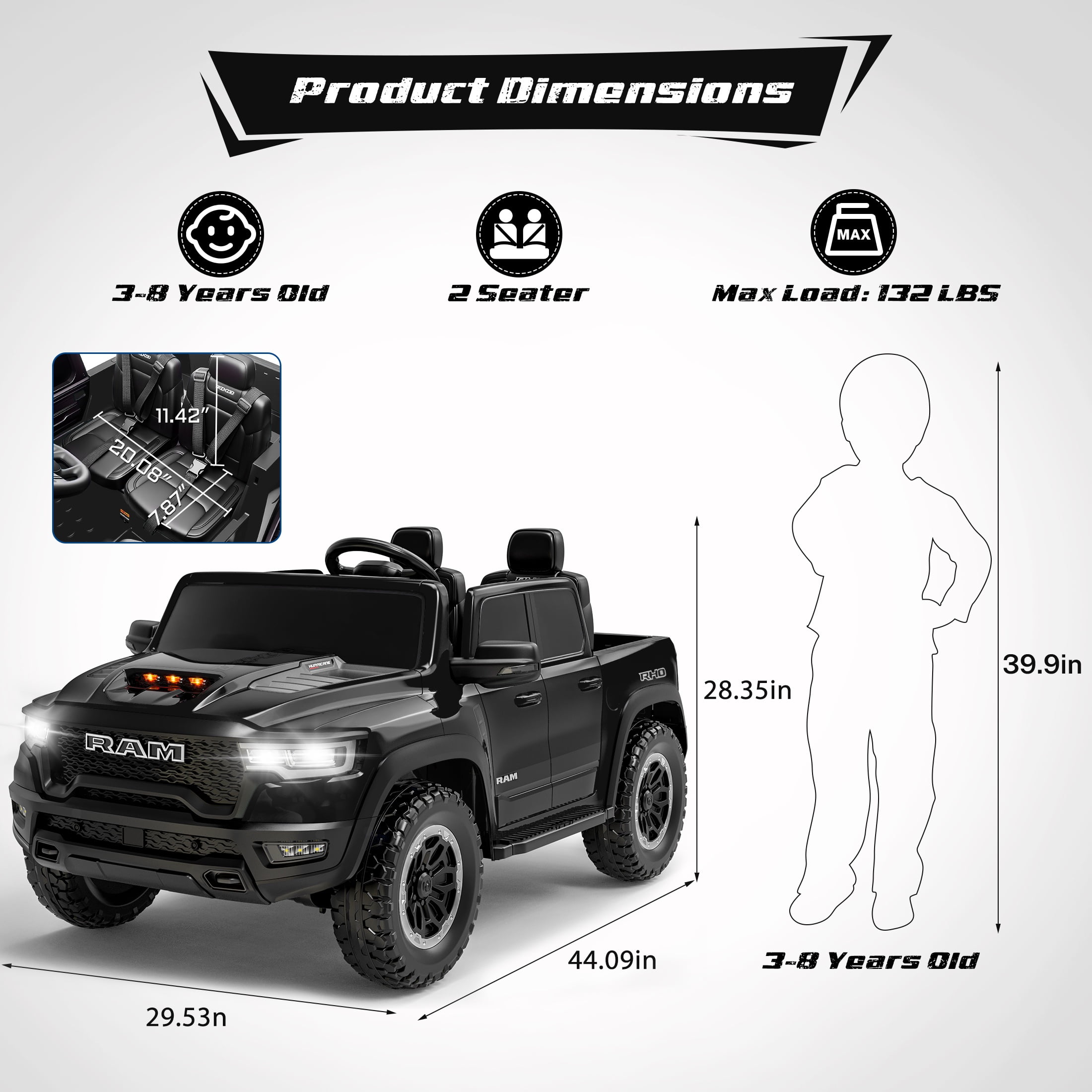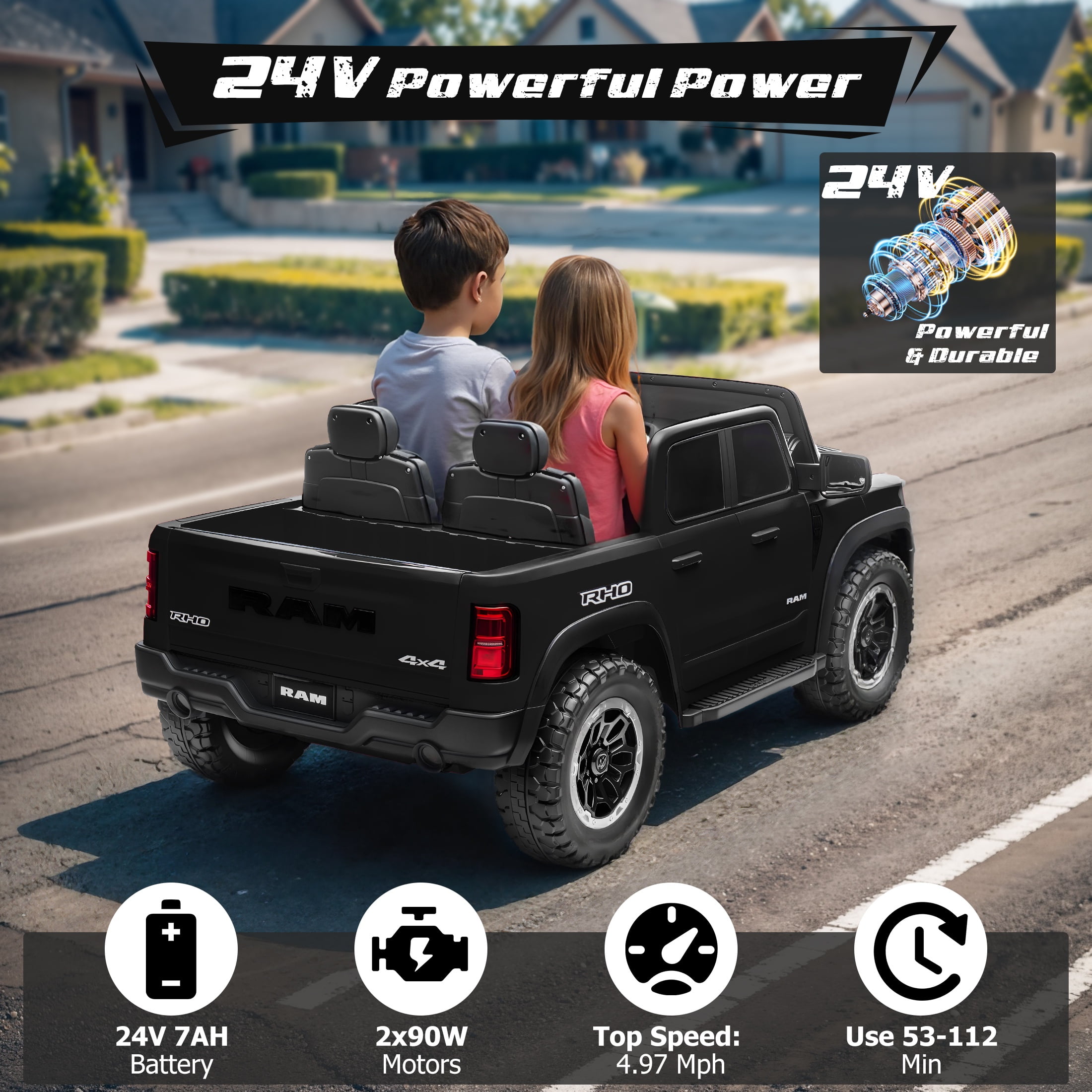 RAM 24V Ride on Cars for Tow Kids, RAM 1500 RHO 2 Seat Battery Powered Ride on Toys with Remote Control, 4 Wheels Suspension Trunk, LED Light, MP3 Player, Electric Car for Kids Boy Girl Gift, Black