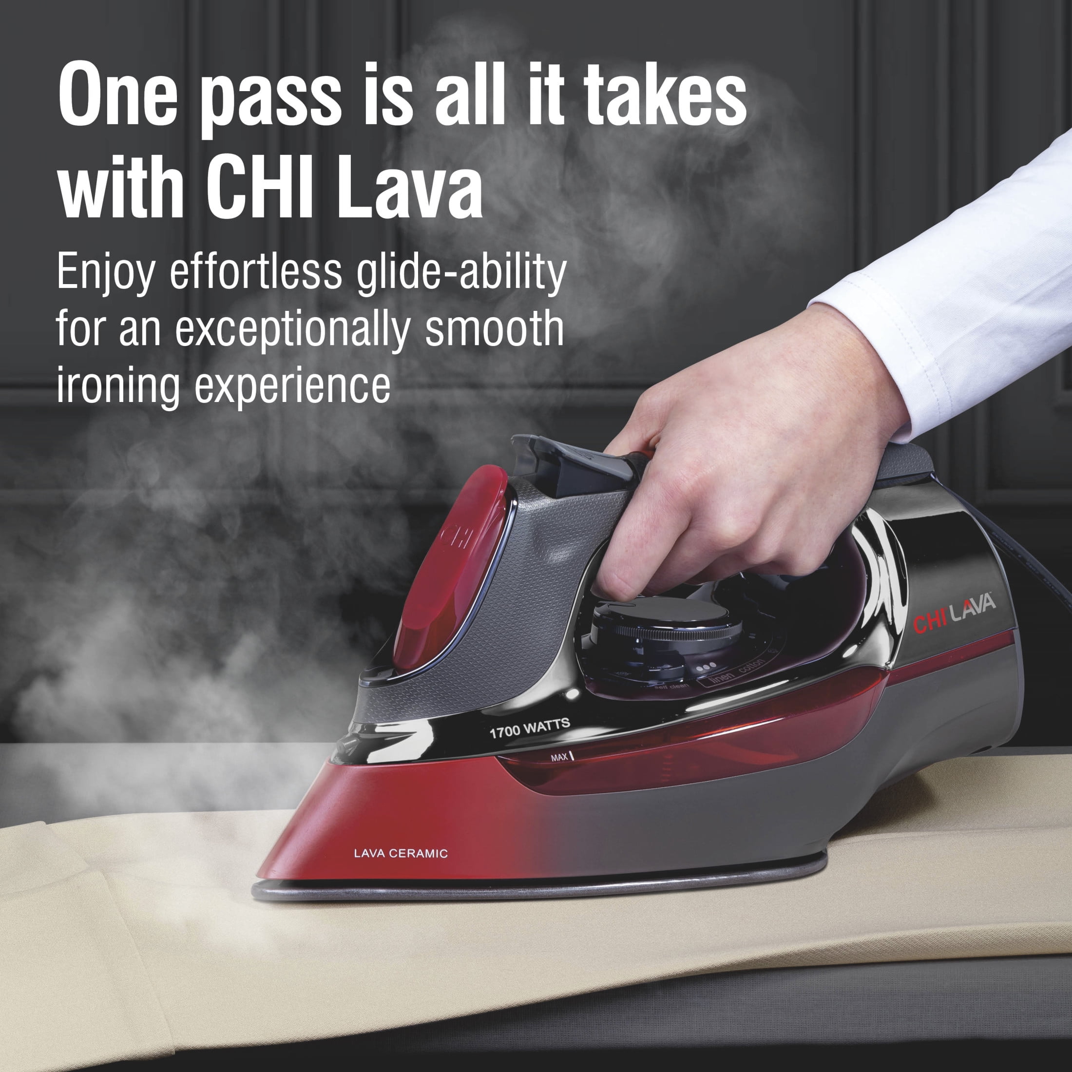 LAVA CERAMIC SOLEPLATE: This steam iron’s soleplate is engineered with volcanic lava combined with the power of CHI ceramic. This innovative combination of elements creates extreme durability, excellent heat conduction and an extra-smooth glide. ONE PASS IS ALL IT TAKES WITH CHI LAVA: Enjoy effortless glide-ability for an incredibly smooth ironing experience. This clothing iron’s advanced lava technology gives you the exceptional glide that you can only expect from CHI. POWERFUL STEAM FOR EFFORTLESS IRONING. With over 400 steam holes and 1700 watts, this CHI iron delivers powerful steam that removes wrinkles effortlessly. You’ll have all the steam power you need to quickly remove wrinkles from every kind of fabric. EASY FABRIC SELECTION AND ADJUSTABLE STEAM: The temperature control dial lets you quickly choose your fabric and sets the temperature accordingly, eliminating guesswork. The adjustable steam lever goes from no steam to full power with just a quick slide. EASY STORAGE WITH RETRACTABLE CORD. The 8 ft. retractable cord winds up quickly with the touch of a button. Its long length ensures that the cord will easily reach the outlet in any room. Water capacity 350 ml.