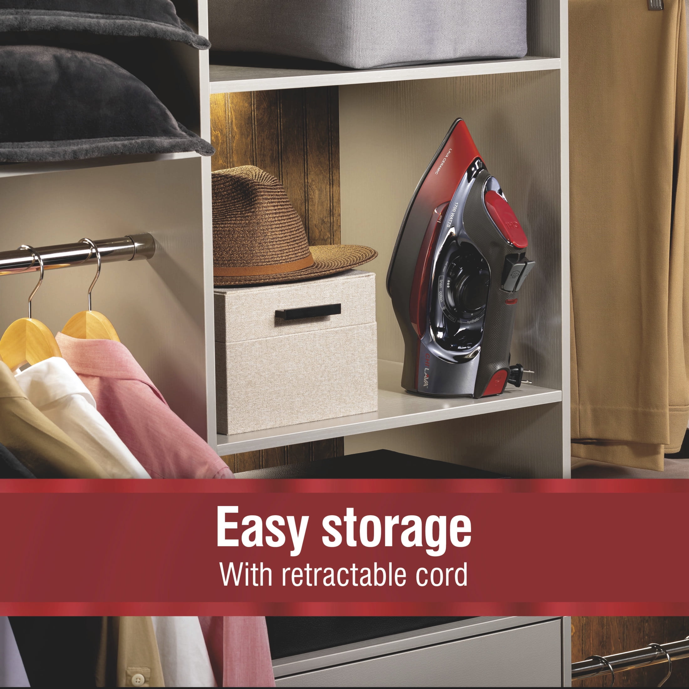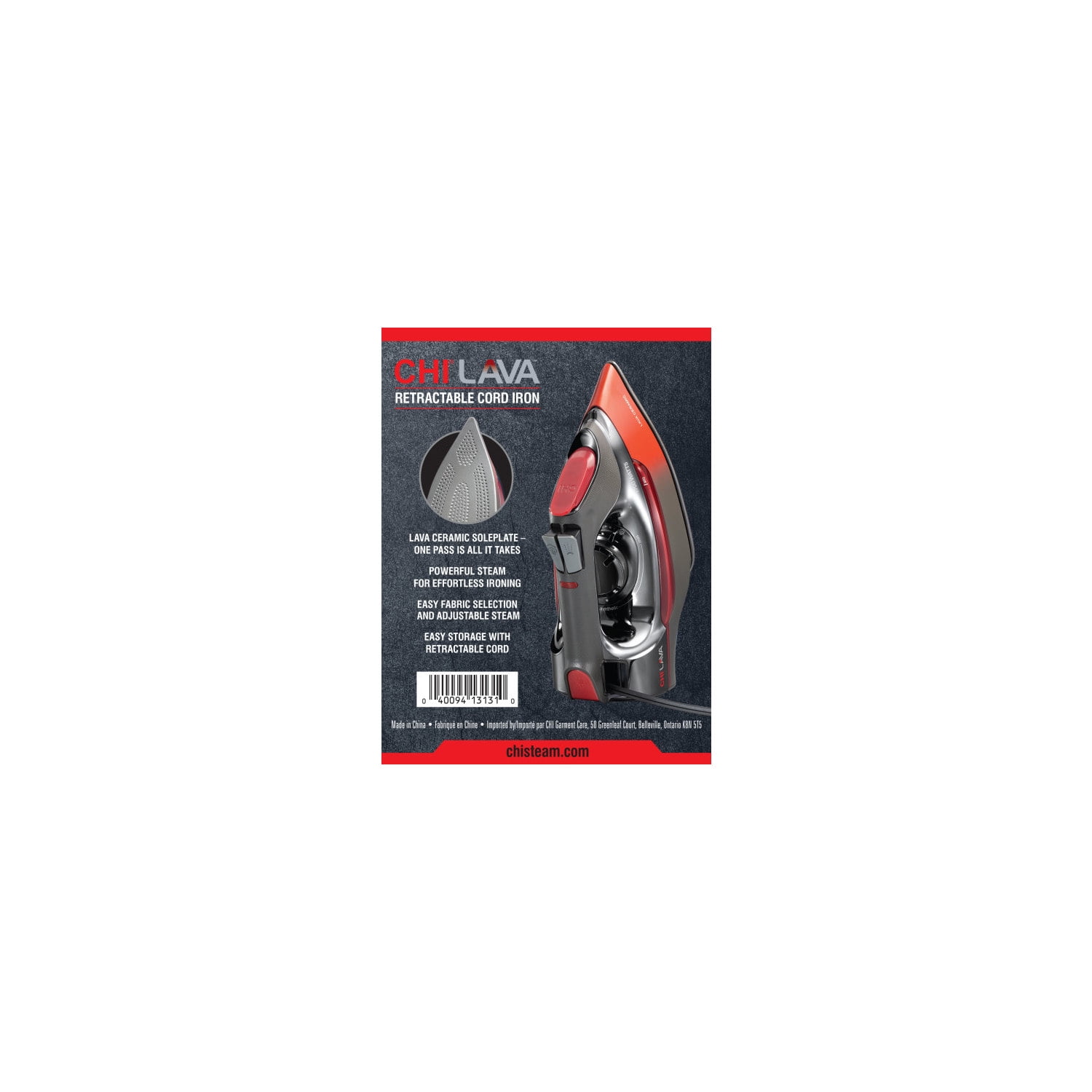 Give your clothes the smooth glide and steaming power of the pros with the CHI® Lava™ Retractable Cord Iron. Engineered with lava ceramic soleplate, the CHI Lava Retractable Cord Iron delivers extreme durability, excellent heat conduction and an extra-smooth glide. The glide-ability is so effortless, one pass is all it takes. The iron is equipped with over 400 steam holes and 1700 watts to ensure powerful steam for effortless ironing, water capacity 300ml, and the temperature control dial and adjustable steam lever let you quickly choose your fabric and steam level. When you’re finished ironing, the 8 foot retractable cord quickly winds into the base with a press of a button for easy storage. For peace of mind, this iron is equipped with 3-way auto shutoff, which turns the power off automatically within 60 seconds if the iron falls down on its soleplate or side and in 30 minutes if it’s left unattended on its heel. Made with premium materials for long-lasting performance and backed with a 3 year limited warranty for extended protection.
