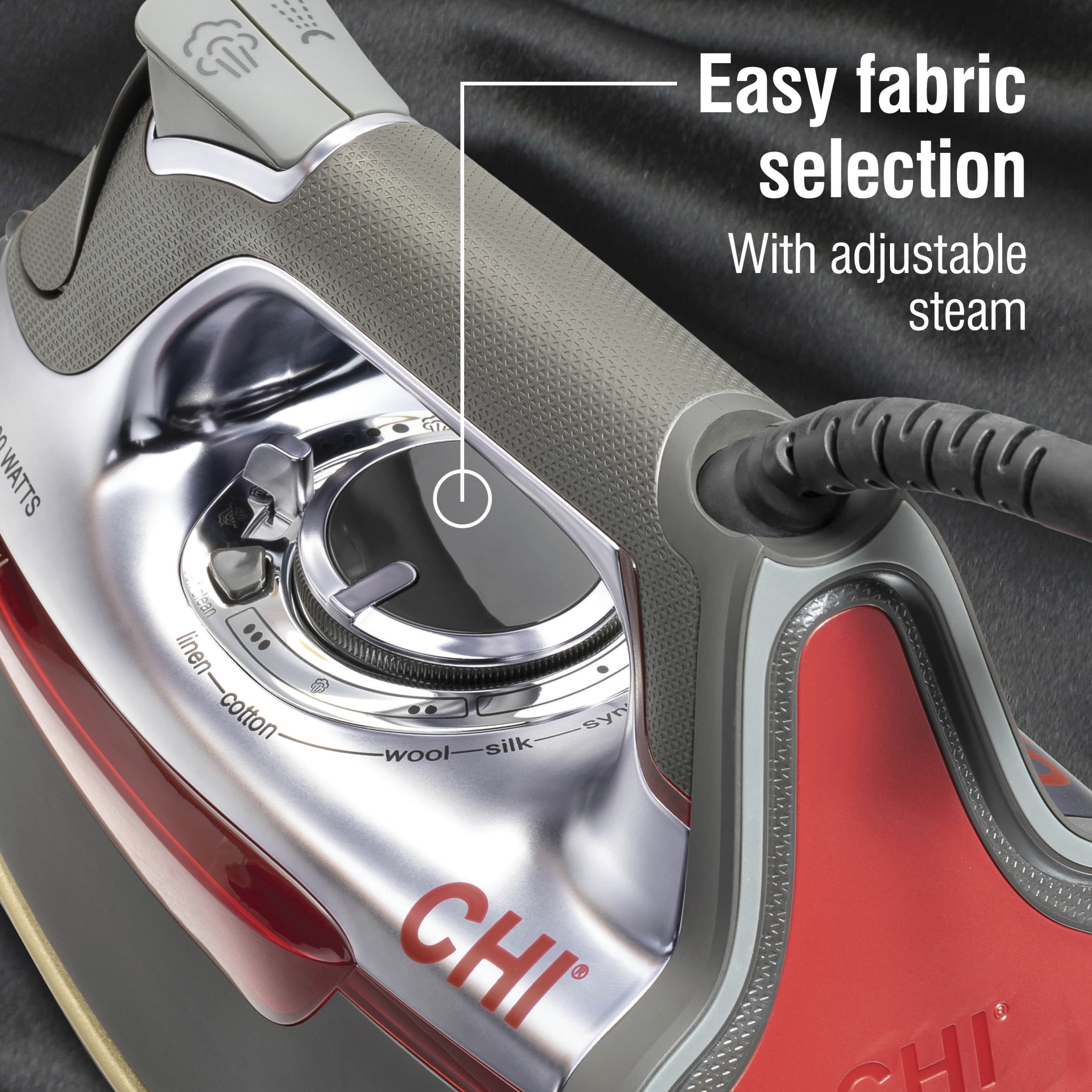 CHI® Professional Clothing Iron Powerful steam, precise temperature, professional results. Whether your definition of a polished look is a well-pressed suit, a smooth silk dress or a wrinkle-free shirt for work, you can achieve it with the CHI® Professional Clothing Iron. Like our haircare tools, this iron is designed to give you the high-performance power of the pros at home. Engineered with a titanium-infused ceramic soleplate similar to our popular CHI® flat irons, the Professional Clothing Iron is durable enough to withstand scratches, heats up quickly and provides an extra-smooth glide. Ironing is simpler than ever with a temperature dial that includes a fabric guide, adjustable steam control and an easy to grasp, comfortable handle. With over 300 steam holes, you can smooth out the toughest of wrinkles effortlessly. Top Bullets: •MADE WITH CHI FLAT IRON TECHNOLOGY. Designed using the same titanium-infused ceramic soleplate technology that powers CHI®’s hair styling tools, including the flagship CHI® G2 Flat Iron. •POWERFUL STEAM FOR EFFORTLESS IRONING. With over 300 steam holes, this iron delivers powerful steam that makes the process of steaming out wrinkles smooth and fast. •FABRIC GUIDE. Choose your fabric type and the iron sets the temperature accordingly, eliminating the guesswork. •PRECISE CONTROL. A unique, adjustable steam lever goes from no steam to full power with just a quick slide. And the sleek handle with textured grip gives you complete control and comfort. •PREMIUM MATERIALS WITH MODERN STYLE. The titanium-infused ceramic soleplate is ultra-strong and scratch-resistant. Matte chrome accents and a sleek design give this iron a polished look. CHI® From hair to wear. From the world-renowned brand that has innovated the haircare industry for over 30 years, comes a high-performance line of irons and steamers for all the fabrics of your home and wardrobe. Engineered with CHI® flat iron technology, and designed for the modern home, these products deliver the precise results you can only expect from CHI®. Whether you want to create a flawless look from head to toe for a milestone event, or have a perfectly-pressed outfit for your workday, it’s now easier than ever to achieve with CHI®. CHI® Flat Iron Technology The Professional Clothing Iron is designed using the same titanium-infused ceramic soleplate technology that powers CHI®’s hair styling tools, including the flagship CHI® G2 Flat Iron. Powerful Steam With over 300 steam holes, this iron delivers powerful steam that makes the process of steaming out wrinkles smooth and fast. Precise Control The temperature control dial lets you choose your fabric type and sets the temperature accordingly, eliminating the guesswork. A unique, adjustable steam lever goes from no steam to full power with just a quick slide. And the sleek handle with textured grip gives you complete control and comfort. Modern Style with Premium Materials The titanium-infused ceramic soleplate is ultra-strong and scratch-resistant. Matte chrome accents and a sleek design give this iron a polished look.