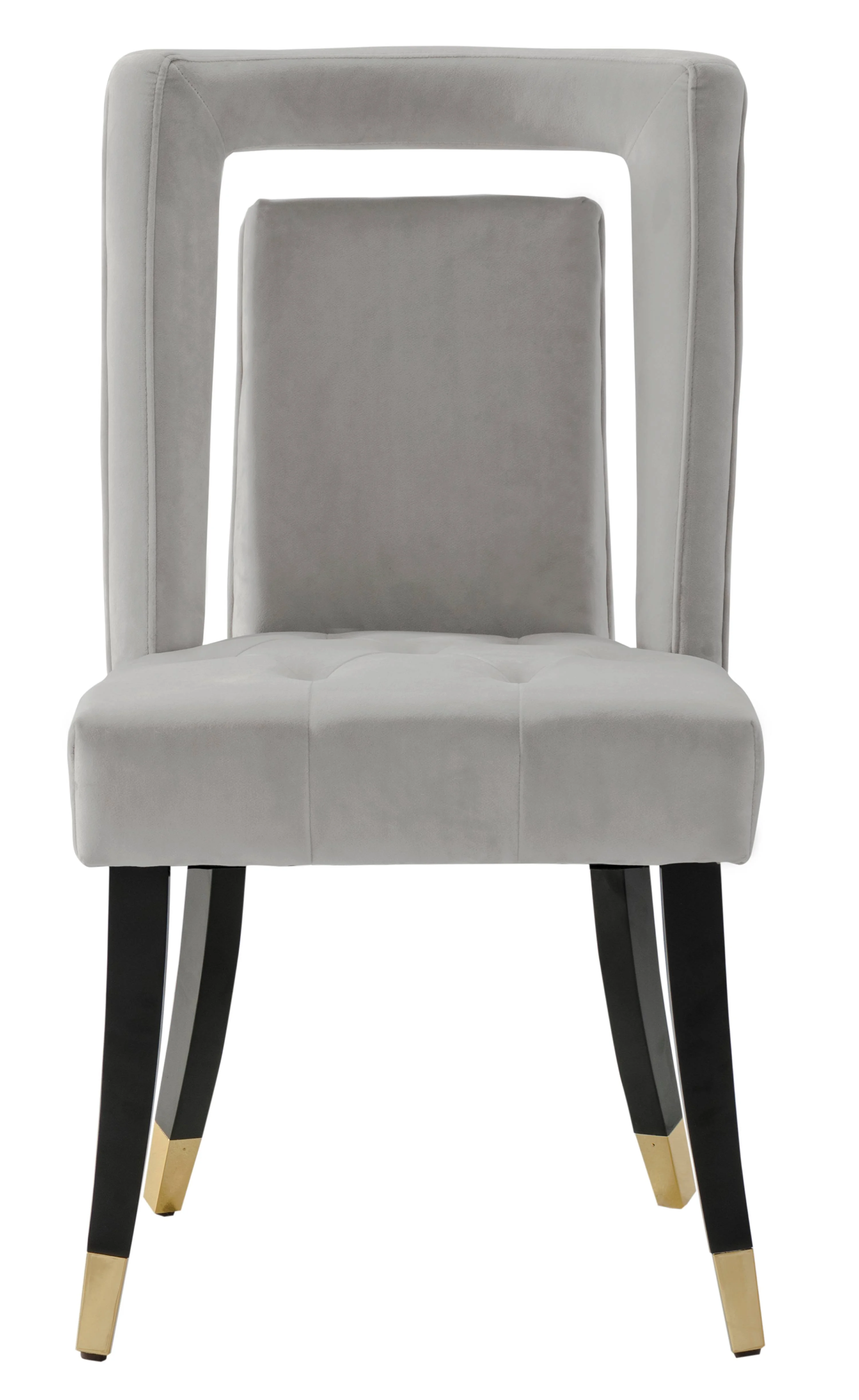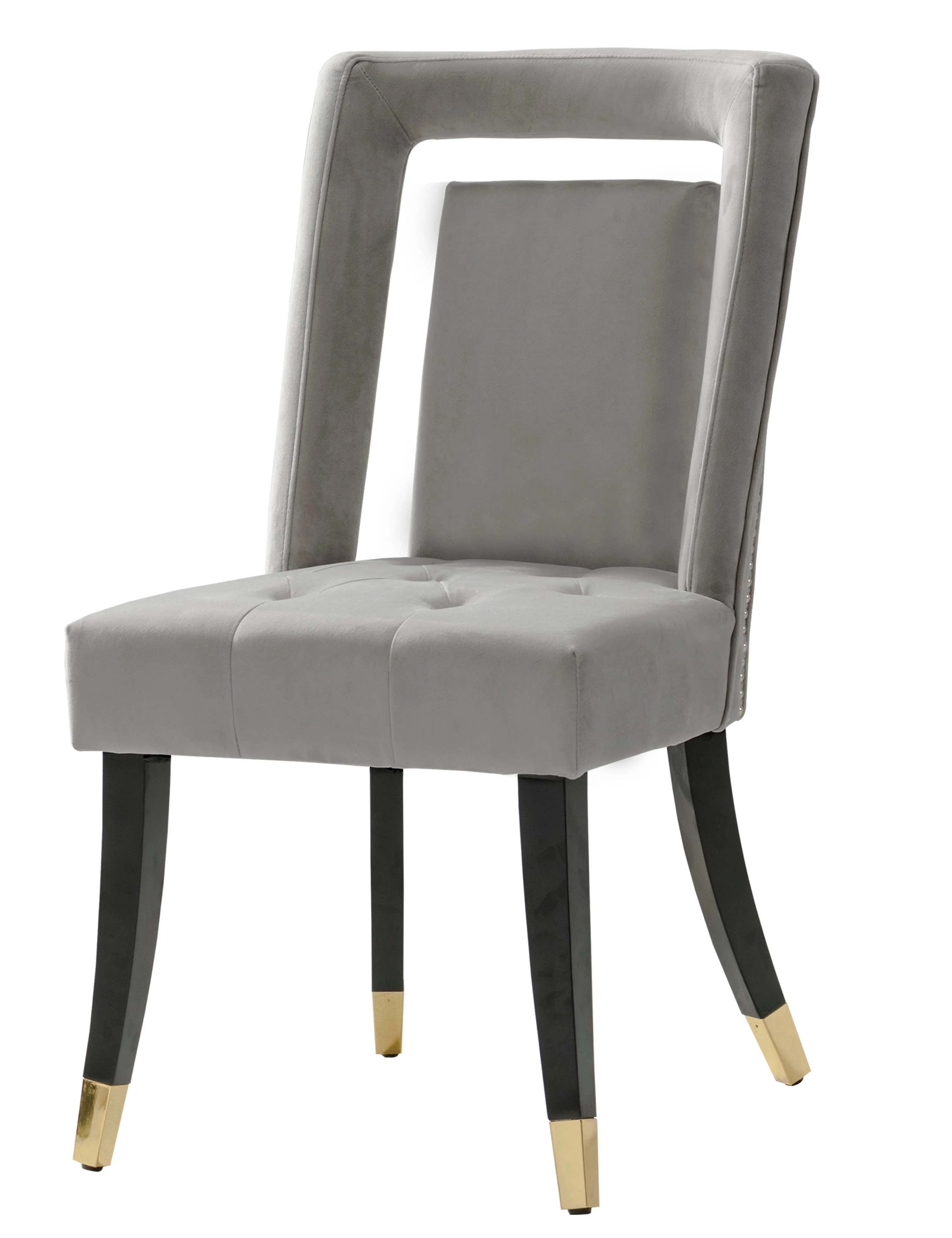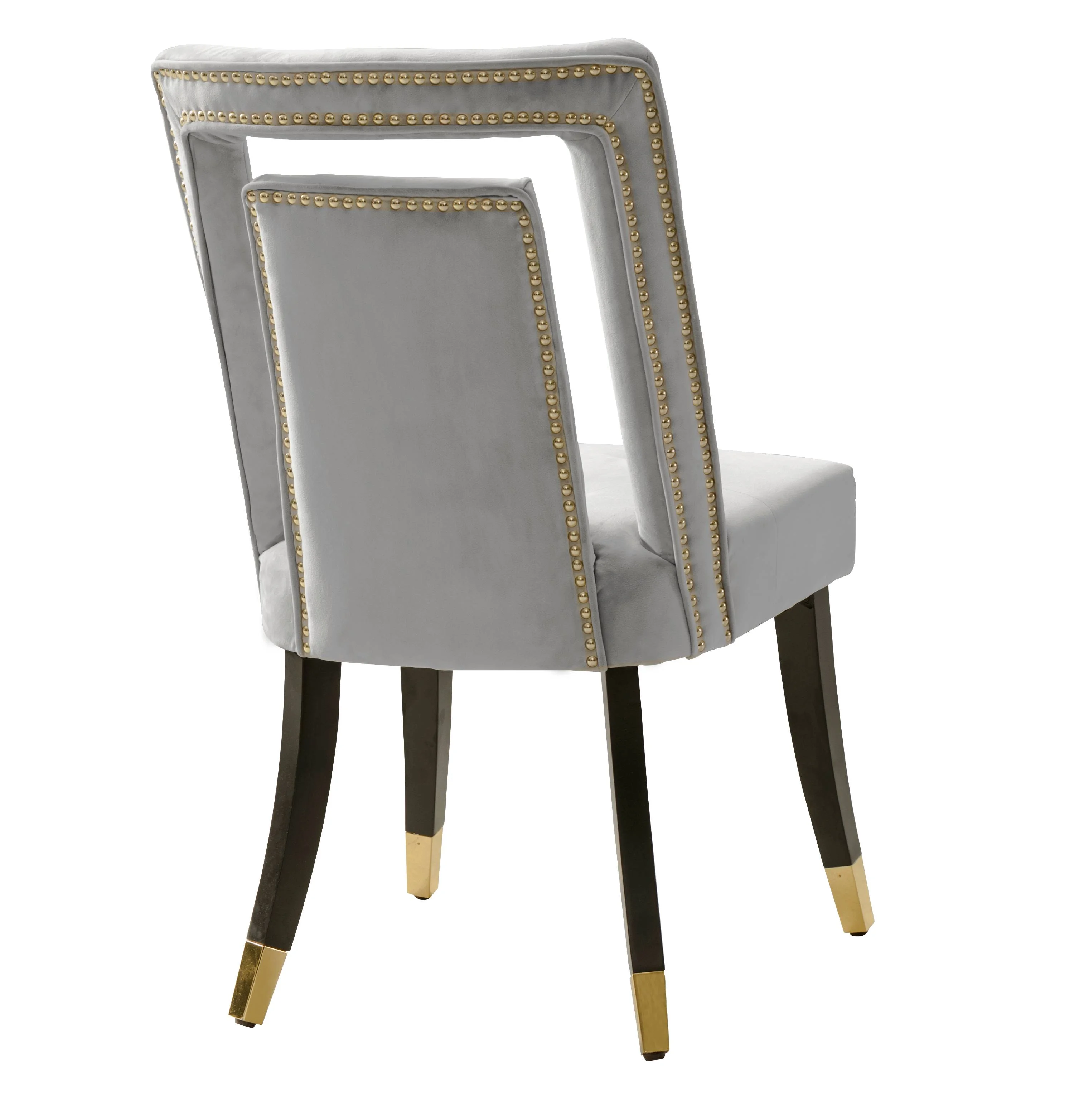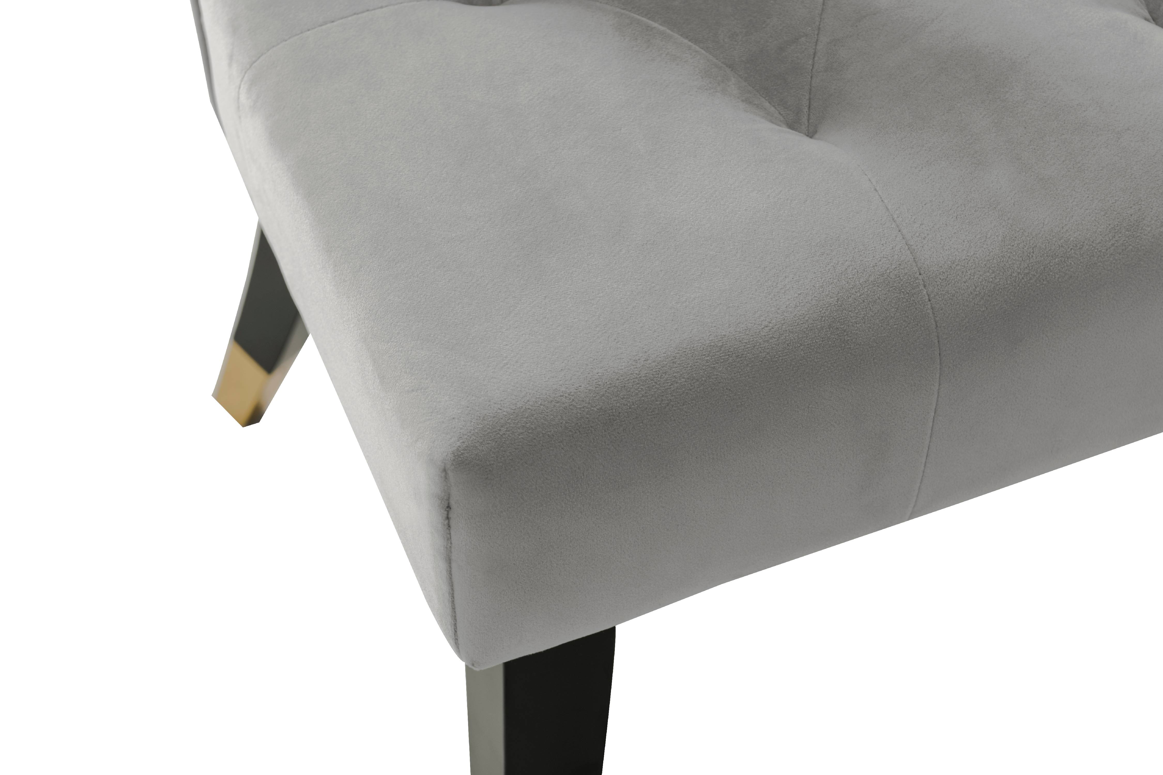 An updated interpretation of an the otherwise timeless dining chair. The Ellie features a tufted velvet upholstered seat finished precisely with gold tone nail heads and espresso finished gold tipped tapered wood legs. Use in multiples in dining and living room settings. Includes ? 2 Ellie Dining Chairs Specifications ? Color: Silver ? Width: 20.5? ? Depth: 22.8? ? Height: 38? ? Seat Height: 20.5″ ? Materials: Velvet upholstery, Solid wood legs Fabric and Design ? Premium quality luxe velvet upholstery ? Clean, soft lines create a look that fits a modern or contemporary setting Features ? Nailhead trim seat and espresso finished gold tip wooden legs ? Luxurious plush multi density cushions to relax in comfort and style ? Built to last with premium fabrics, materials, and expert craftsmanship Care Instructions Spot clean only The images we display have the most accurate color possible. However, due to differences in computer monitors, we cannot be responsible for variations in color between the actual product and your screen.