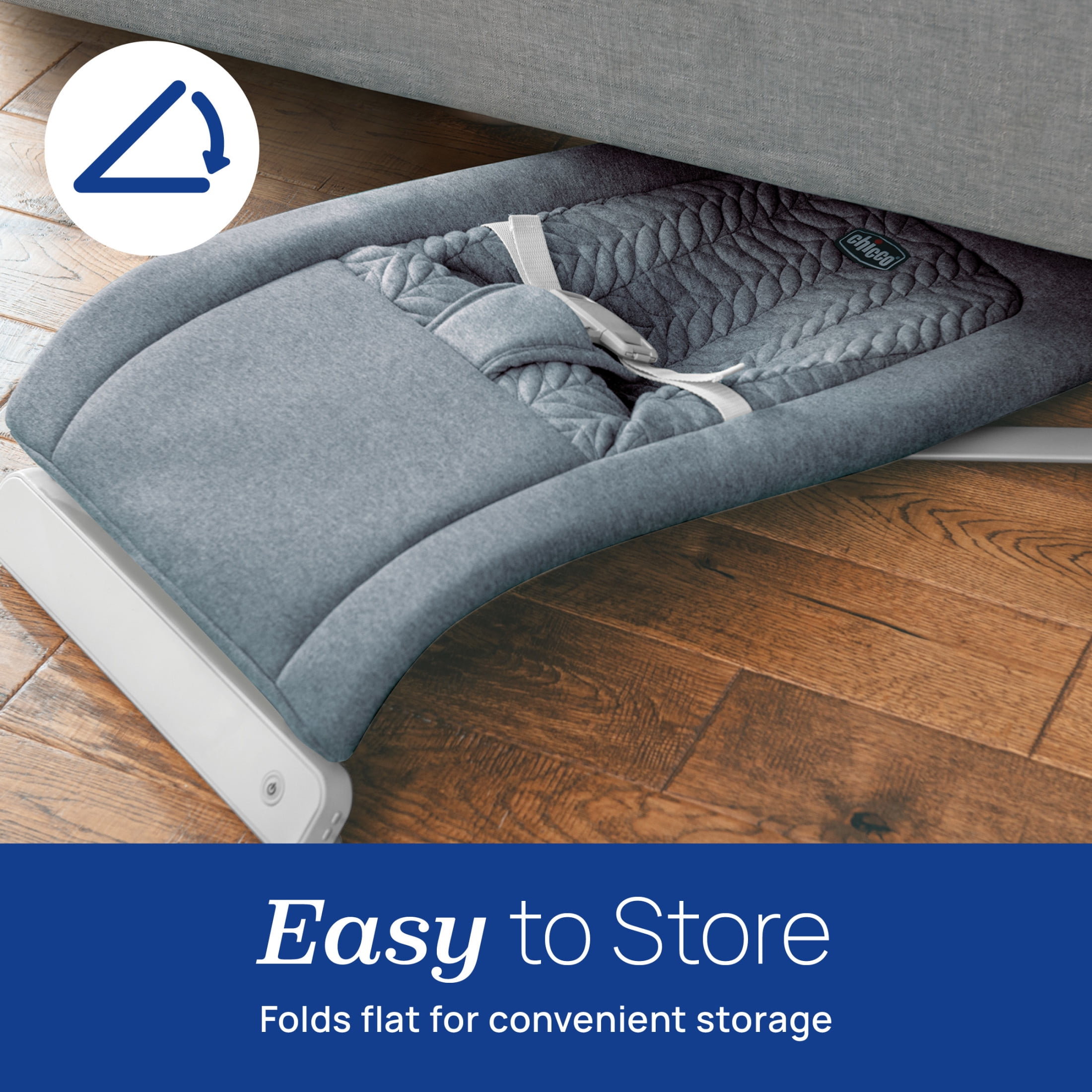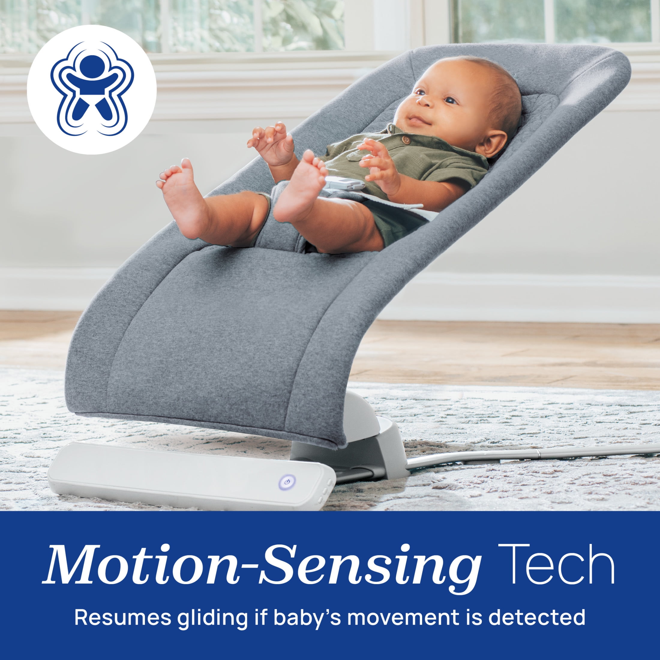 Automated gilding motion mimics a parent’s sway Advanced motion-sensing technology resumes gliding motion if baby’s movement is detected Easily converts to standard bouncer mode letting baby create the action Soothing sounds include four nature sounds and three melodies Machine-washable seat pad made with soft, organic cotton fabric for natural comfort 3-point harness and anti-slip non-marking feet for added security Folds flat for convenient storage and portability AC and battery powered (15 hours capacity, 4-AA batteries – not included) The Grey fashion features cozy heathered organic cotton knit quilted with stylized leaves for chic comfort.