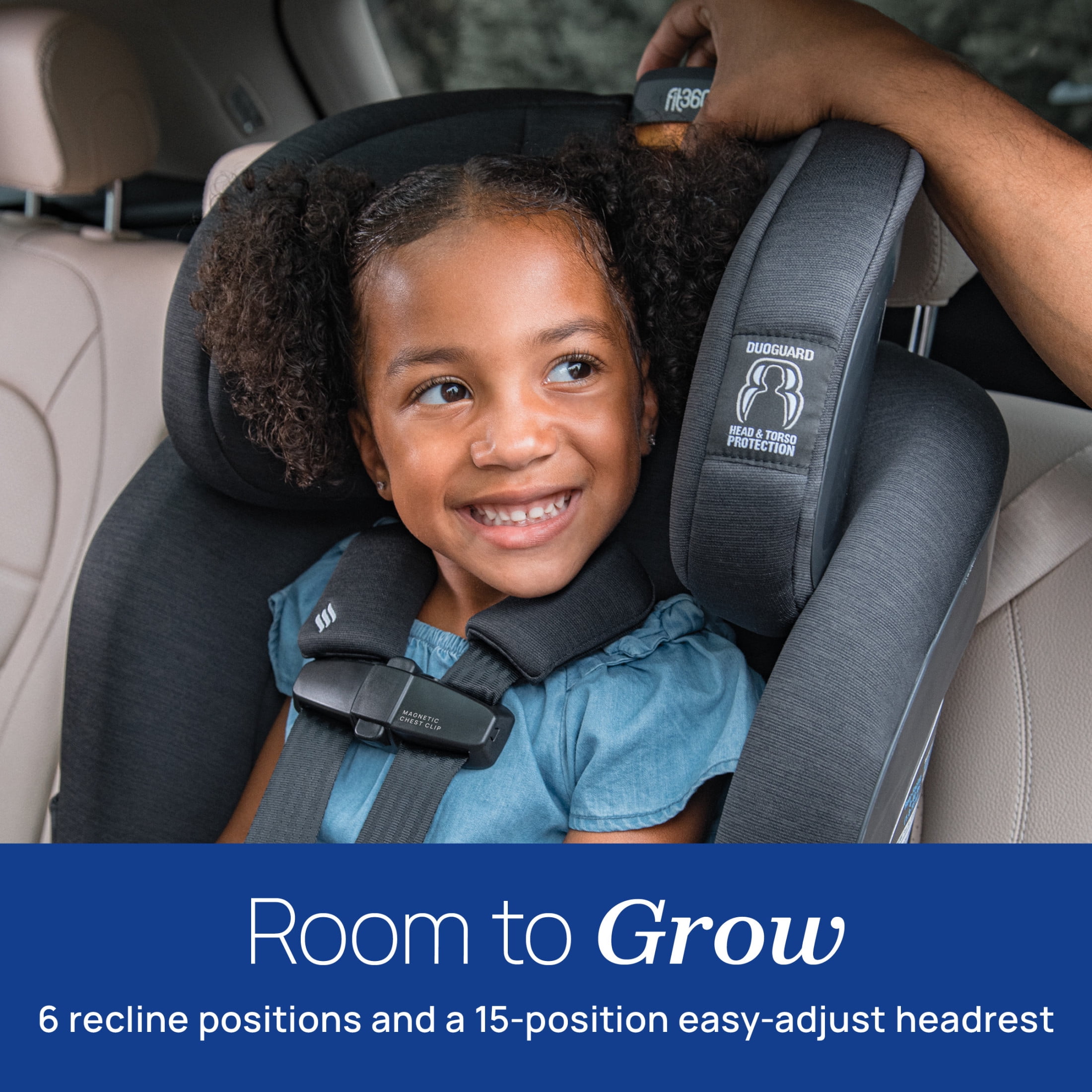 The Chicco Fit360® ClearTex® Rotating Convertible Car Seat is the all-around easiest-to-use car seat, thoughtfully designed to make every day travel easier. The 360° one-hand rotation provides an optimal experience to comfortably secure your child in the seat and just as comfortably remove them from the seat when your ride is complete. Fit360® is also enhanced with an innovative Quick Secure Harness System including a magnetic chest clip, flex-forward buckle, 15-position easy-adjust headrest and easy-flow harness. Fit360® provides the all-around best experience starting face-to-face for easy loading and unloading, and then turning to rear-facing (4-40 lbs.) or forward-facing (26.5-65 lbs.) when you’re ready to ride. Installing the Fit360® into your vehicle is as simple as Open-Route-Close with innovative one-time LeverLock® seat belt installation. Open the LeverLock® door on the Fit360® base and route the seat belt using the easy-access belt guides. The car’s shoulder and lap belts follow their natural path through the guides for trouble-free belt routing. The built-in LeverLock® Self-Tensioning Lock System offers superior stability with three points of contact for continuous use from rear-facing (4-40 lbs.) through forward-facing (26.5-65 lbs.) usage. By simply closing and latching the LeverLock® door, the vehicle belt is tightened in a way that eliminates any movement from front-to-back or side-to-side. This provides an ultra-secure installation with minimal effort, ensuring reliable stability over time. Two RideRight™ bubble level-indicators work in tandem with the 6-position ReclineSure™ leveling system to provide improved vehicle fit and child comfort. Once the base is securely installed in the vehicle and the seat is attached to the base, the red or green ready-to-ride indicators found on both sides of the base clearly indicate if the seat is properly positioned (green) or not (red) for travel in a moving vehicle. The ergonomically designed seat shell combined with the premium ultra-plush seat pad, supports your child in a natural seated position and provides enhanced comfort as they grow. The Fit360® base is equipped with six recline positions that allow you to select the ideal seating angle during installation that will provide peace of mind throughout the duration of use. Featuring ClearTex® flame retardant-free fabrics, Fit360® is GREENGUARD Gold Certified for low chemical emissions, contributing to healthier air quality around your child. Everyday conveniences include machine-washable fabrics for easy cleaning and two flexible, removable dishwasher-safe cup holders. Offering two layers of protection, DuoGuard® features a steel-reinforced frame, a deep rigid shell and EPP energy-absorbing foam that surrounds the head and torso. A removable head and body support for newborns (4-11 lbs.) makes the Fit360® ready to go from day one. From installation to in and out, the Fit360® ClearTex® Rotating Convertible Car Seat is the all-around easiest, every day, wherever the day takes you.