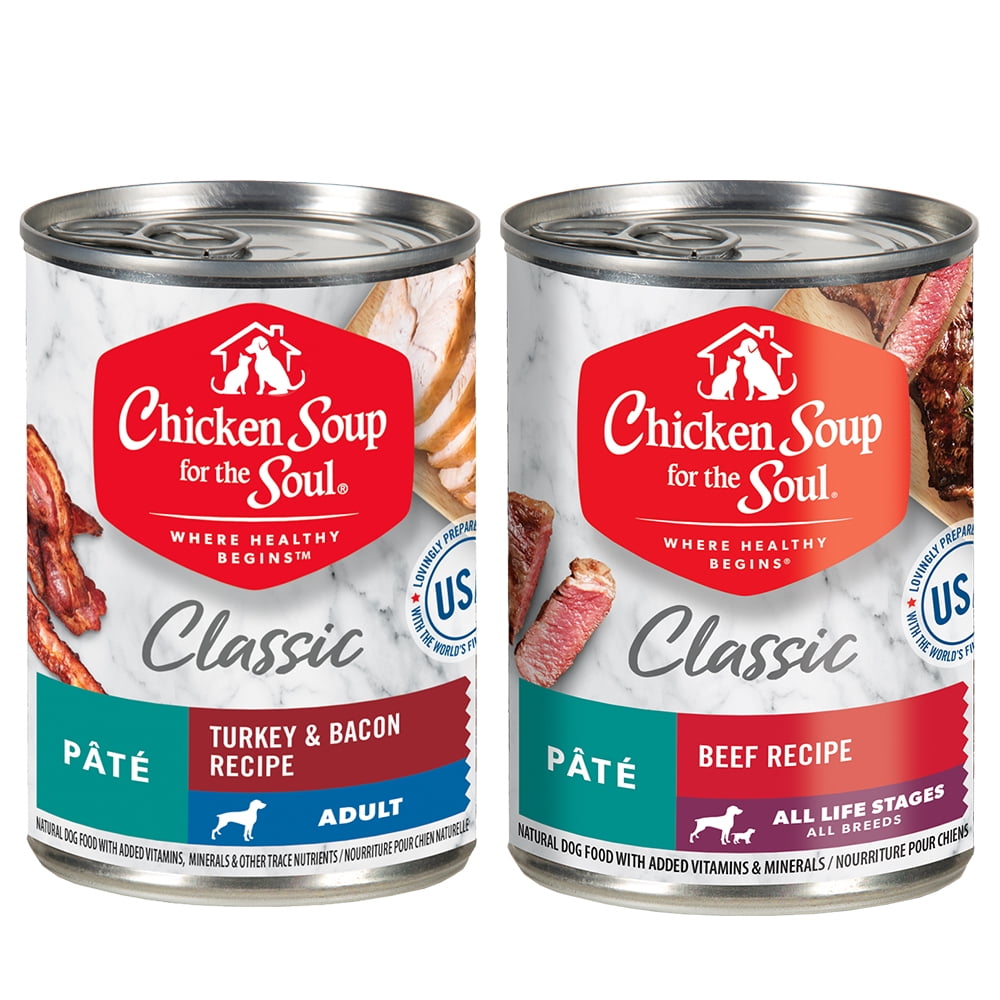 CHOICES! Give your buddy the choice: Chicken Soup for the Soul Classic Turkey & Bacon Recipe or Beef Pate Recipe. This multipack contains 12, 13-oz cans of complete & balanced wet dog food with real turkey or beef as the very first ingredient. Not only is this dog food packed with the flavor furry friends love, but it is also completely free from by-product meals, corn, wheat and soy. Now you can support your pup’s health and happiness by feeding him well-balanced nutrition. These pate meals can be served as an excellent stand-alone meal or a great supplement to dry kibble.
