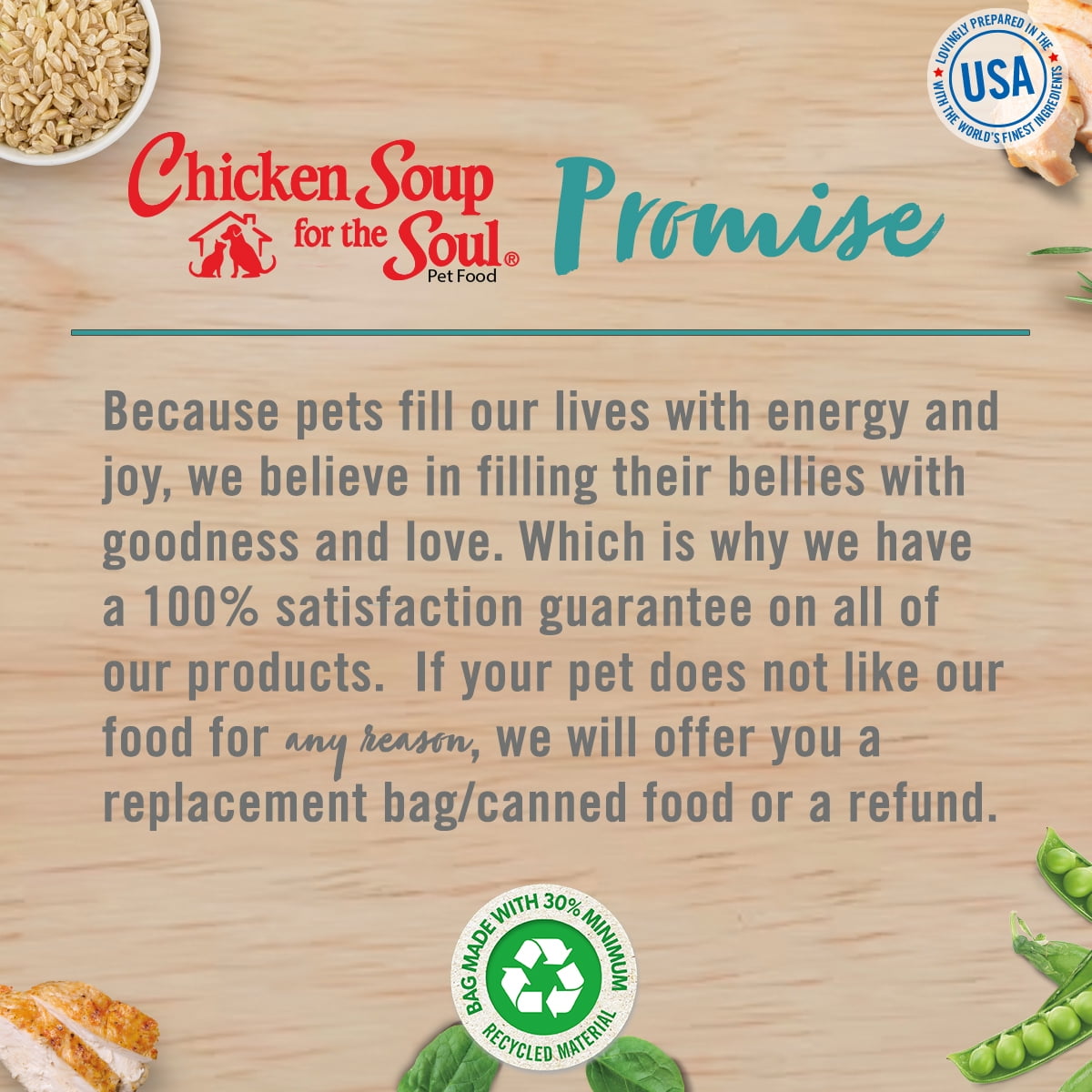 Big-Boned and Beautiful! This Chicken Soup for the Soul Adult Large Breed dry dog recipe offers four (4) REAL animal proteins: chicken, turkey duck and salmon to promote lean muscles and create a taste dogs can’t resist – with chicken and turkey as the #1 & #2 ingredients. YUMMM! Glucosamine and chondroitin promote stronger joint support. Wholesome fruits & vegetables like spinach, carrots, blueberries & cranberries encourage immune health. Guaranteed omega 3 & 6 fatty acids help maintain a healthy skin & coat. No artificial colors, flavors, or preservatives. No by-product meals. No added corn, soy or wheat. Providing premium pet food since 2004.