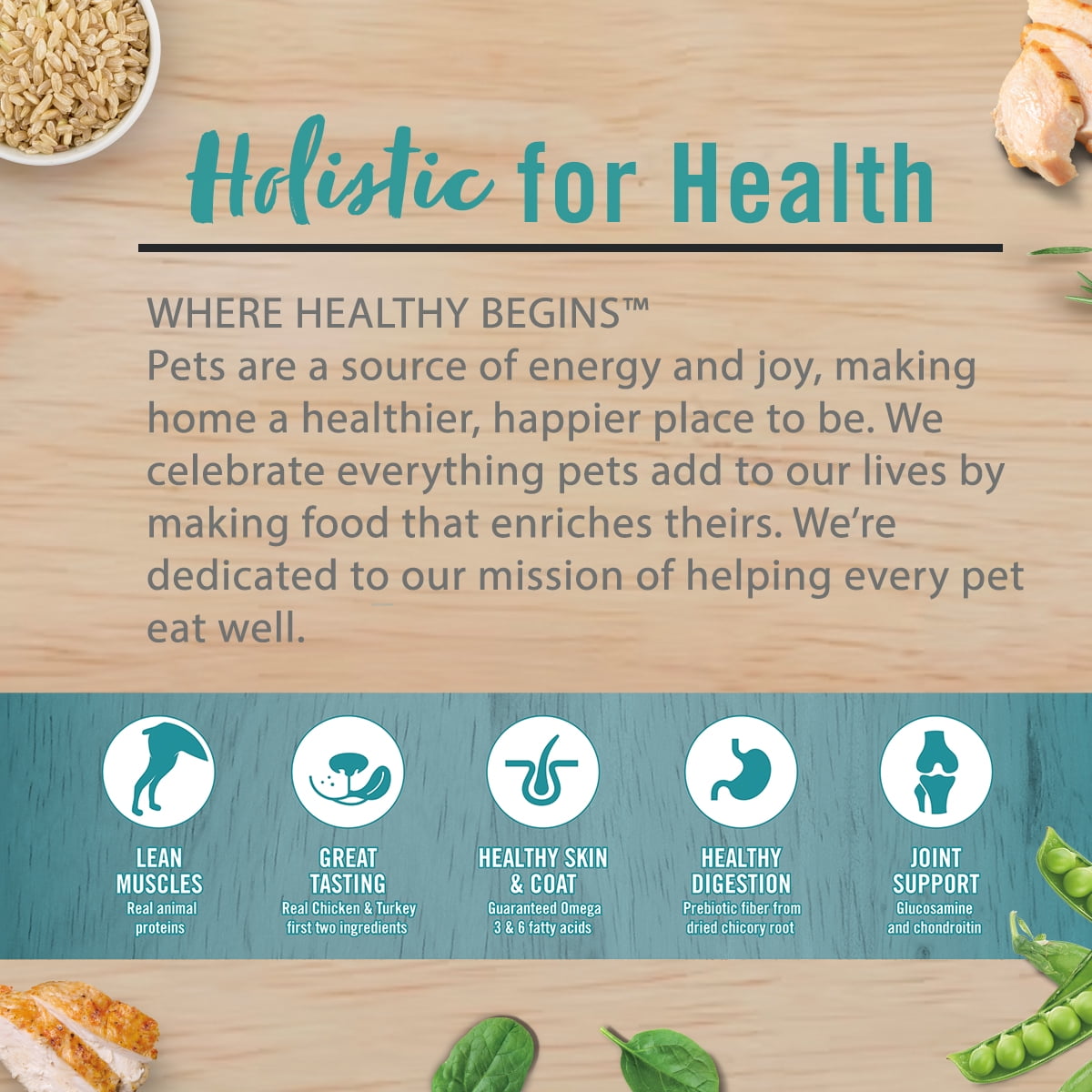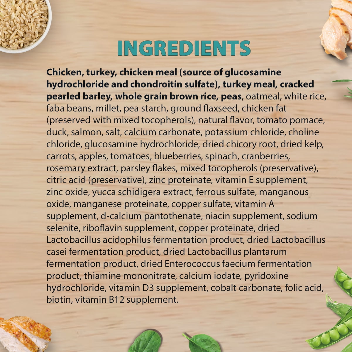 Four (4) REAL animal proteins: chicken, turkey duck and salmon support lean muscles and great taste. YUMMMM! Prebiotic fiber from chicory root helps with healthy digestion. Glucosamine and chondroitin for joint support. Guaranteed omega 3 & 6 fatty acids help maintain a healthy skin & coat. Wholesome fruits & vegetables like spinach, carrots, blueberries and apples help support immune health for your adult dog. No by-product meal, wheat, soy or corn. No artificial colors, flavors, preservatives. Premium Pet Nutrition Since 2004.