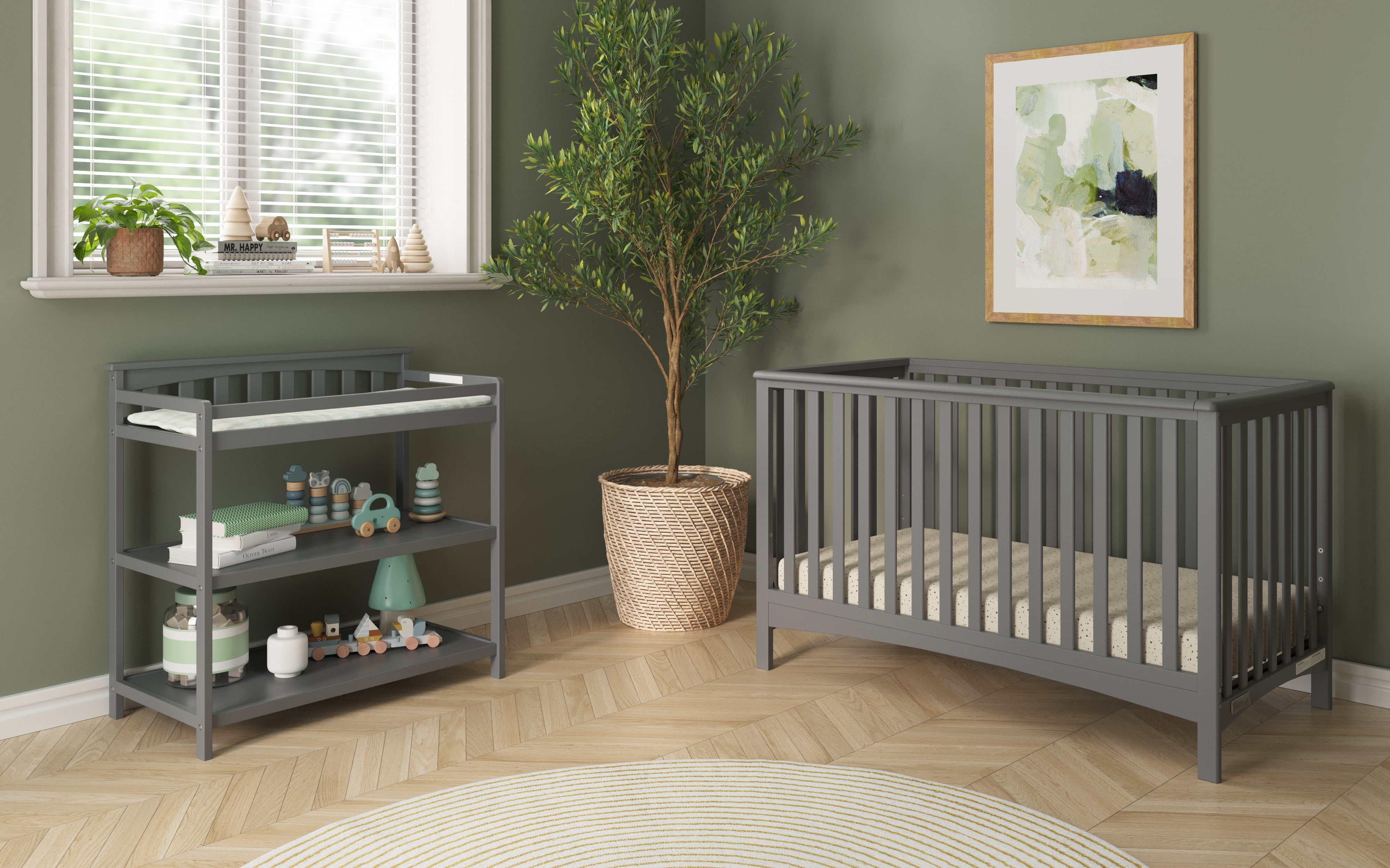 Bring timeless style and convenient storage to your little one’s nursery with this Child Craft Flat Top Baby Changing Table. The Child Craft Flat Top Changing Table’s design features smooth, clean lines that provide a look of sophistication while complementing many different styles of furniture. The Child Craft Flat Top Changing Table is available in three different, non-toxic finishes: Cool Gray, Dapper Gray, Slate, and Matte White. The bottom of the Child Craft Flat Top Changing Table features two bonus shelves for extra storage and space. The two large storage shelves on the Child Craft Flat Top Changing Table are conveniently located below the changing table allowing room for quick access to diapers, wipes, ointments, clothing and more without needing to leave your baby’s side. The Child Craft Flat Top Changing Table was manufactured with safety in mind and features a safety rail and security belt to help keep your little one safe and secure during diaper and outfit changes. All tools and hardware are included for assembly. The Child Craft Flat Top Changing Table has the following assembled dimensions: 37.9″L x 19.55″W x 36.19″H.
