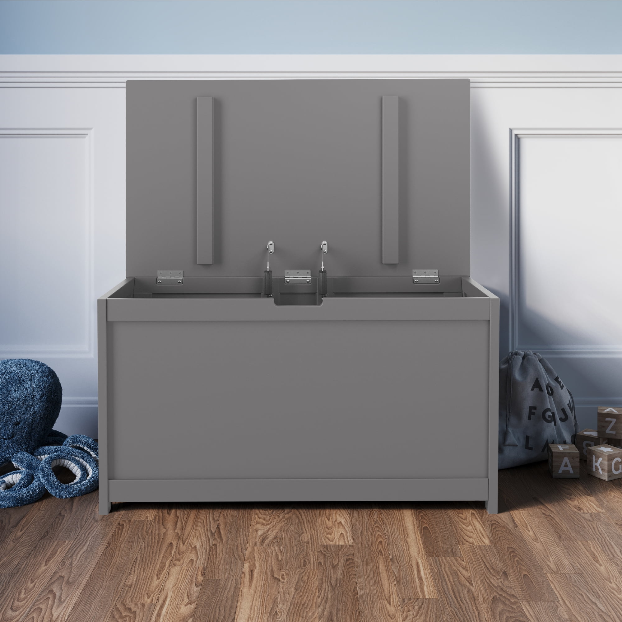Child Craft Harmony 33″ Kids Toy Box Storage Chest, Soft-Close Hinges, Wooden Construction, Cool Gray