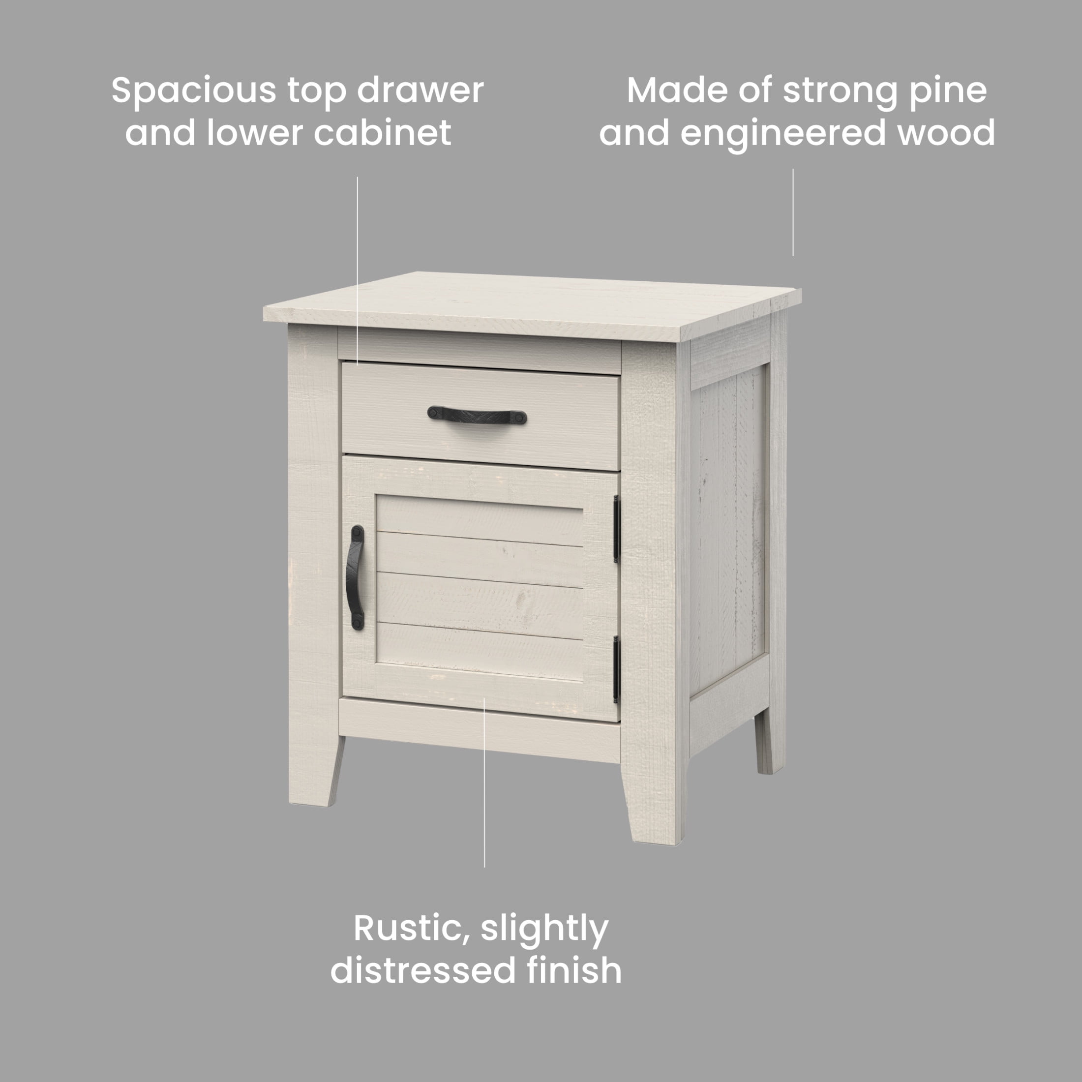 Coastal Nightstand: Nightstand with rustic, modern design features a large drawer with smooth drawer glides and an additional storage cabinet. Great for a baby nursery, kid’s room, or adult bedroom. Strong Pine Wood: Crafted of strong, sturdy pine wood, MDF with veneer and plywood drawer boxes. Pair with Child Craft Pieces: Pair this nightstand with matching furniture pieces from the Child Craft catalog, like a crib, dresser, or chest. Available in Seascape Gray and Pumice Gray finishes. Dimensions: Assembled nightstand dimensions: 21″ L x 17.5″ W x 24″ H; Assembly Required.