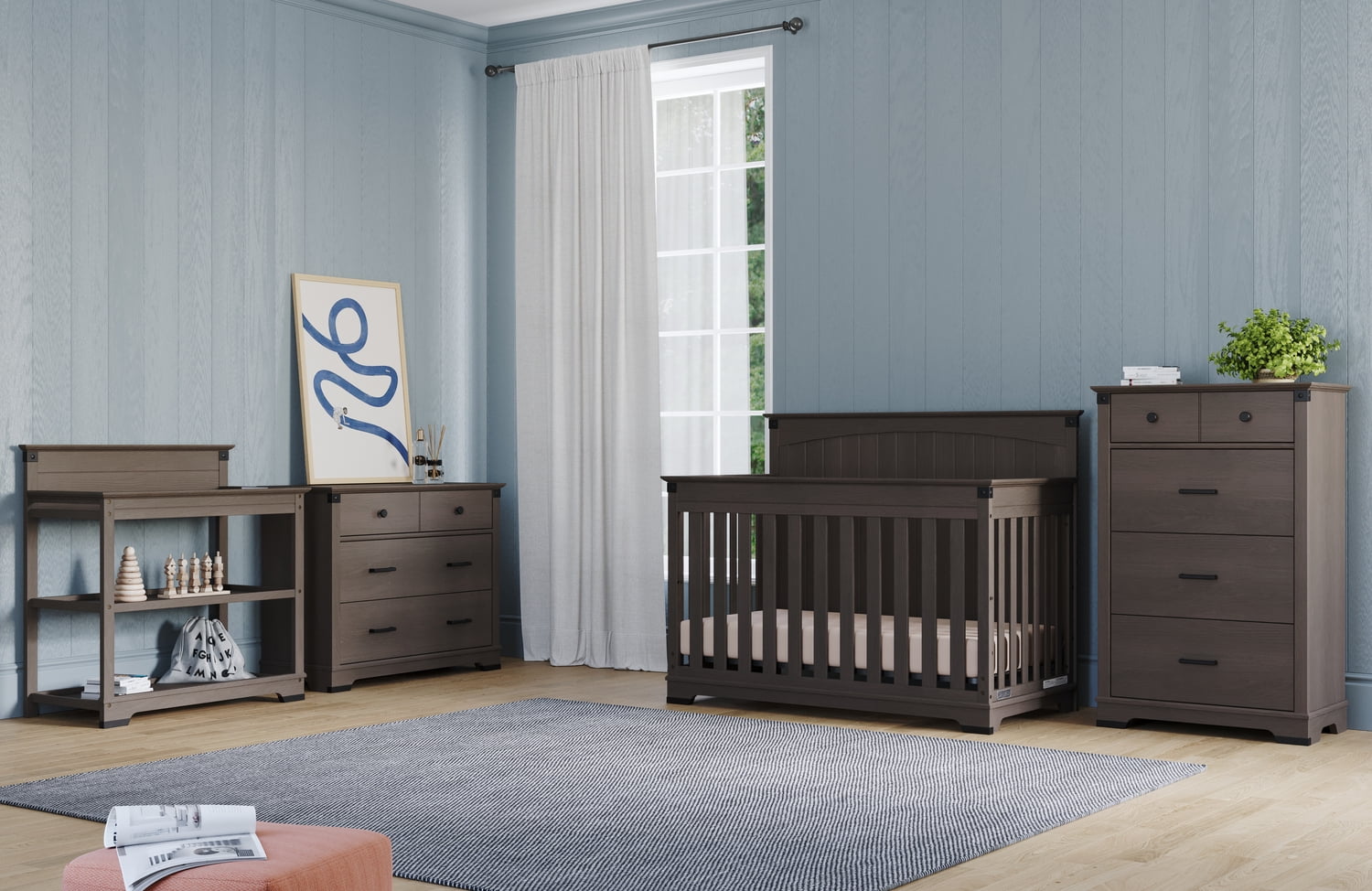 Rustic Design: The Redmond Changing Table features wrought iron hardware and clean lines to give your nursery a charming feel. Safe Design: Dressing pad features security belt to keep baby secure. Changing table comes with anti-tip kit to prevent furniture from tipping or falling over. Complete the Collection: Pair with the rest of the Redmond collection for a cohesive nursery look. Available in 2 Sophisticated Finishes: Coach Cherry and Dapper Gray. Assembled Dimensions: ‎The assembled dimensions of the Redmond Changing Table are 39 x 19.5 x 40 inches, with a weight of 33 pounds.