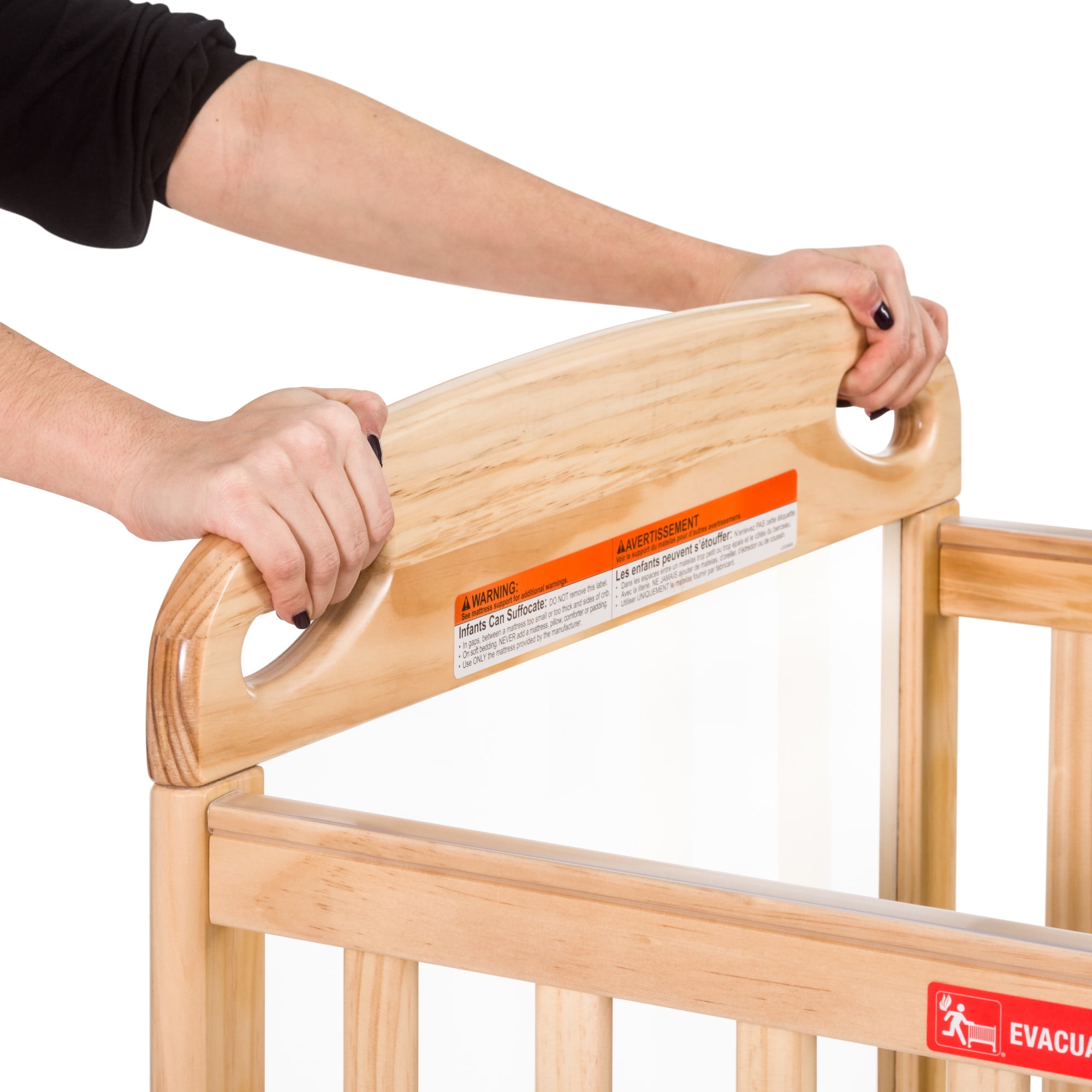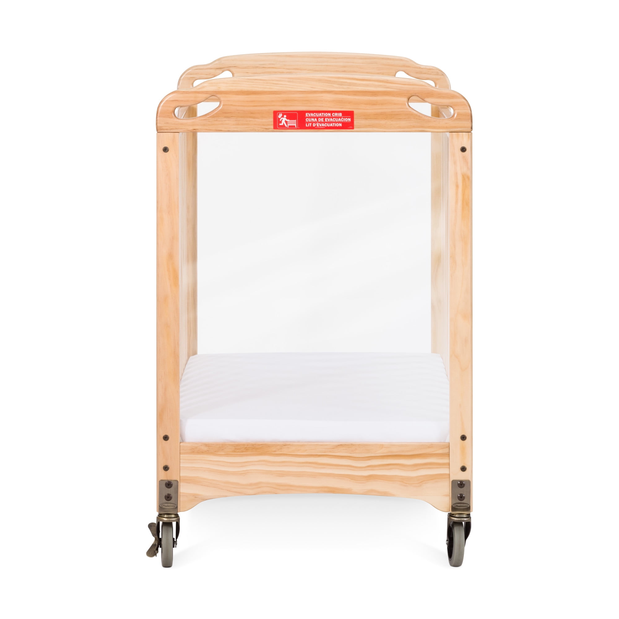 Compact Design: Sized for doorways and emergency evacuation use. Space-Saving Build: Streamlined design offers easy storage and portability. Built to Last: Durable wood with steel frame and ClearView end panels. Easy to Move: 4” heavy-duty casters with easy-grip handles for transport. Locking Wheels: Two locking wheels secure crib in place when stationary. Included Mattress: Comes with a 3″ naturally safe foam mattress. Evacuation-Ready: Clearly labeled for emergency use in daycare settings. Clear Visibility: Transparent ends allow for constant infant monitoring. Safety Certified: Meets all federal and industry safety standards. Assembled Dimensions: 39.33″L x 26.25″W x 40″H