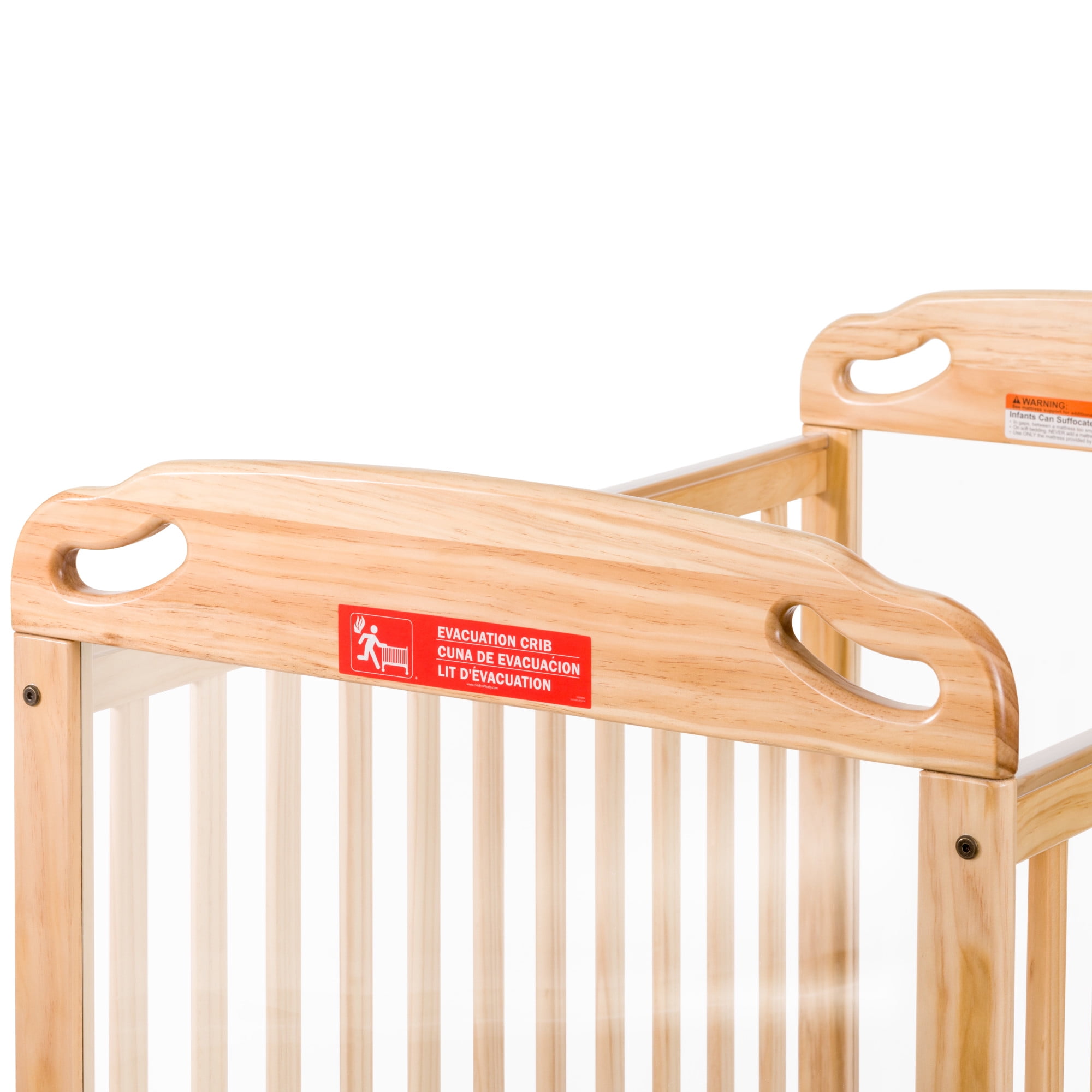 Keep your baby safe in an emergency with this wonderful evacuation compact crib. The crib features a color coordinated finish, matched with hardware and casters for added beauty and a solid steel frame for unequaled threshold strength and support. The high quality construction includes mortise and tenon joinery and high strength fasteners for superior durability. The lower profile provides easier accessibility to infant while reducing back strain for the caregiver. The Safe Haven Professional Series Evacuation Compact Crib will allow caregivers to safely carry infants to safety in the event of an emergency and is the only comprehensive solution available for infant evacuation. Four-inch, non-marking casters enable the crib to maneuver the evacuation route safely and successfully. The 3-inch ultra-durable mattress rests on a non-adjustable, 4-inch mattress board. Clearview end panels allow for easy viewing of infant. The crib’s compact size and easy grip handles integrate into headboards to assist stable evacuation transport. Exclusive evacuation icons that are visible for all sides clearly identify this crib for evacuation use for immediate recognition by first responders. Be safe and prepared with this compact evacuation crib.